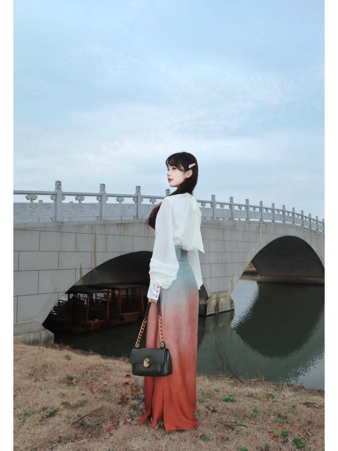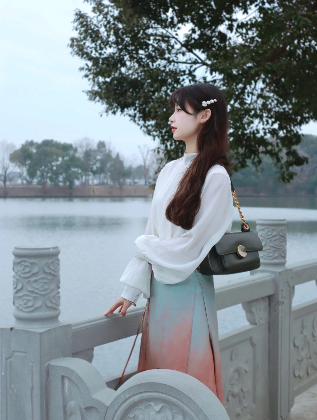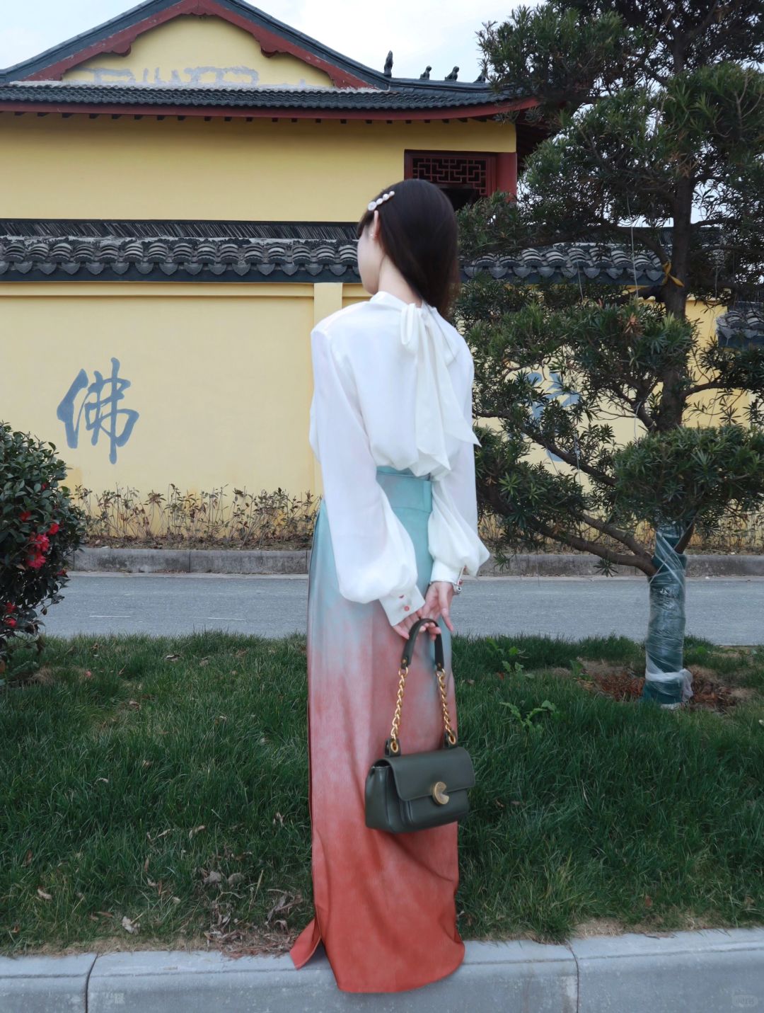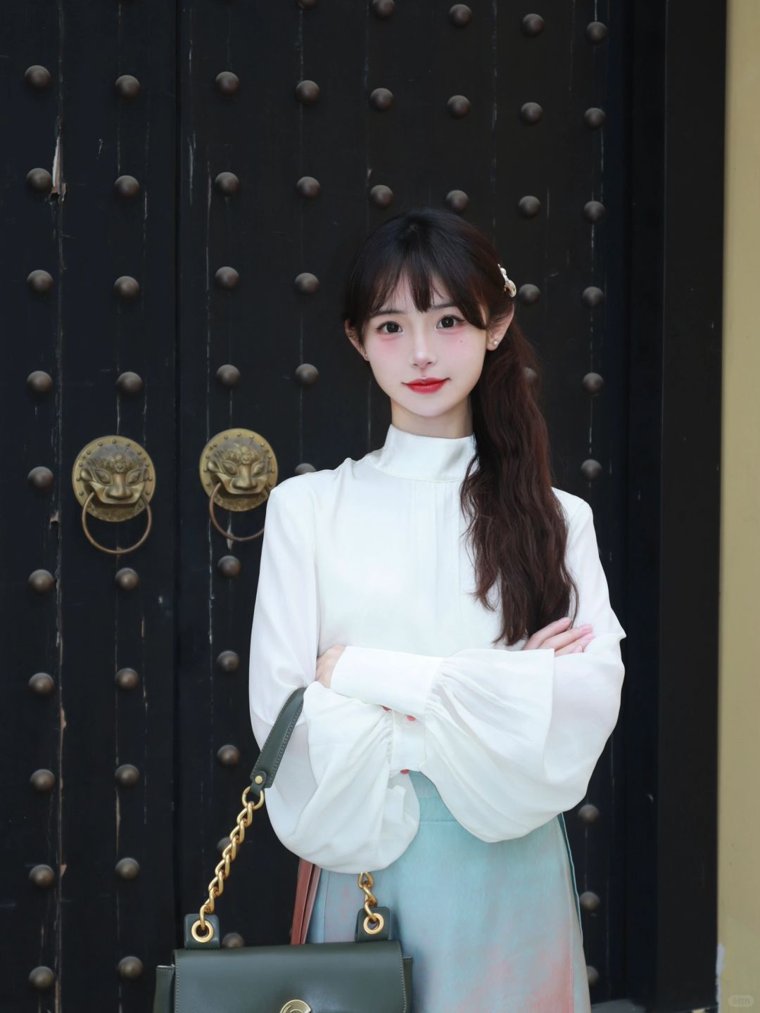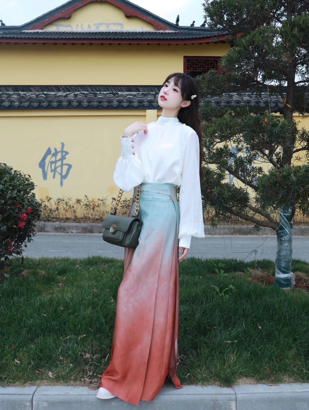 一抹青绿同粉黛,人间绝色是“惊鸿” - 今日份穿搭: ▫️新中式提花上衣 ▫️仿色元代“影青釉里红高足杯”的旋裙 再搭配上简单的发型和包包 日常又有气质~