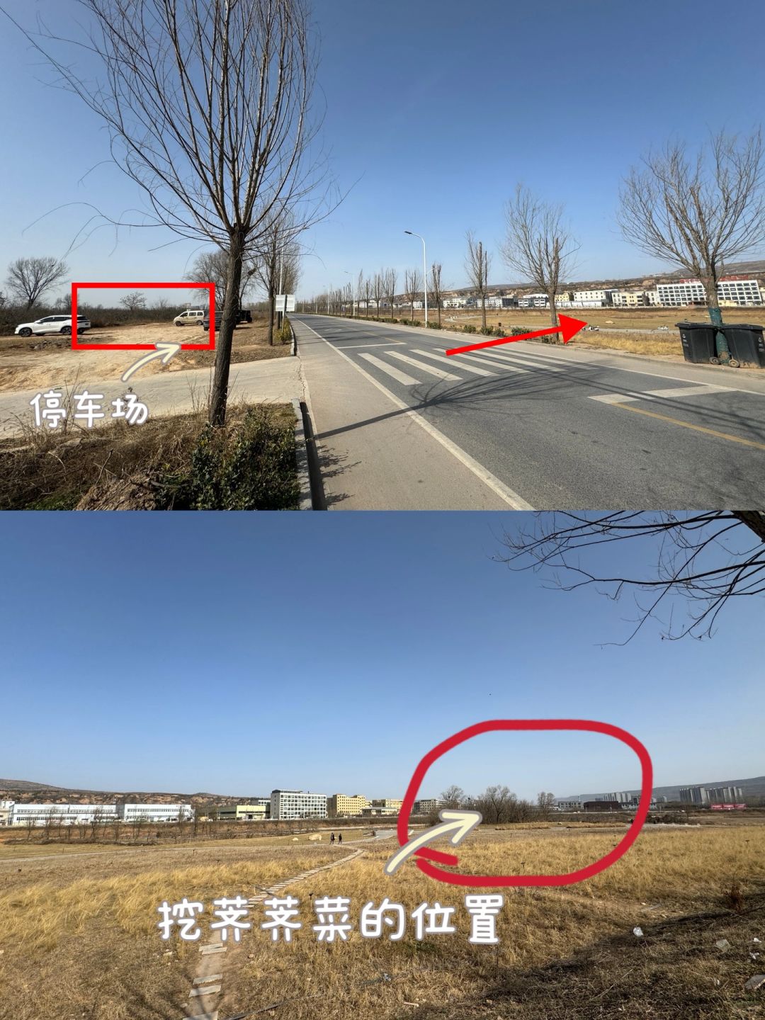📍导航“东李驿”,距离目的地还有595米的时候会看到(图8-1)的简易停车场,停好车从马路对面下去看到(图8-2)的树林,挖荠荠菜的位置就在树林里,绿色的草里面有很多,一堆一推的藏在草里!