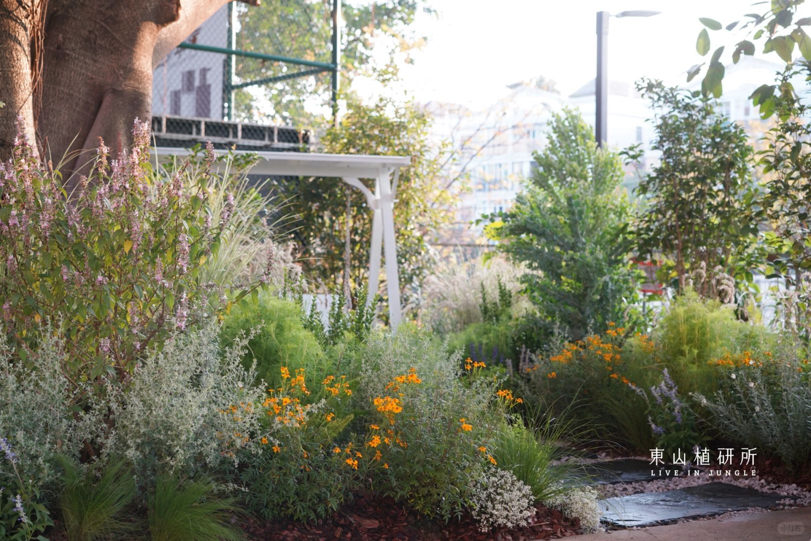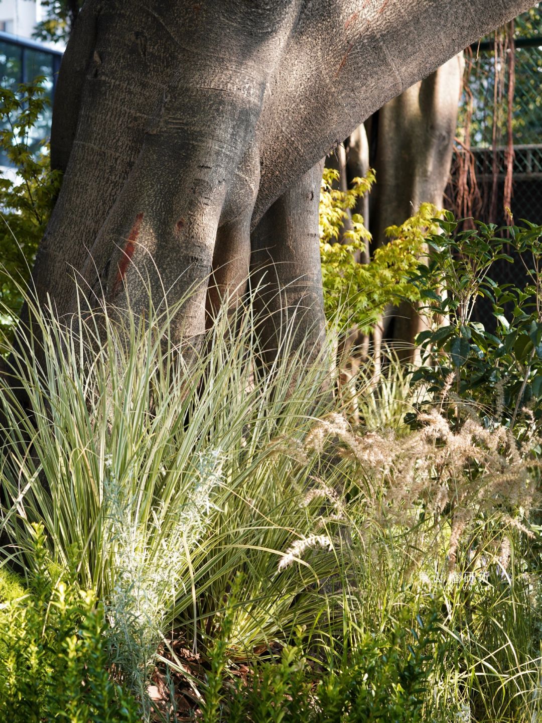 办公室室外花园设计 花园规划时团队设计师考虑到场地中原有的大树。大树枝干繁茂,散发着自然的力量感 在中段加入木本植物过渡 引导视线由上至下 底层用了柔美的花卉和观赏草 明媚的色彩、柔和的质感 为场景增添无限生机 柔美的植物衬托出 榕树坚实的质感 阳光下不同高度 不同质感的植物 带着不同的光影 植物清单:金合欢,桂花树,黄金枫,粉蝴蝶,狐尾天门冬,假蒿,墨西哥羽毛草,银叶仓鼠,芳香万寿菊,台草凤凰绿,大布尼狼尾草,飘雪 ——————