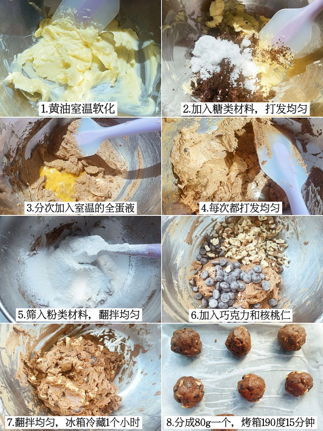 2️⃣筛入粉类材料,翻拌至无干粉的状态。加入巧克力和核桃仁翻拌均匀,放冰箱冷藏1个小时。