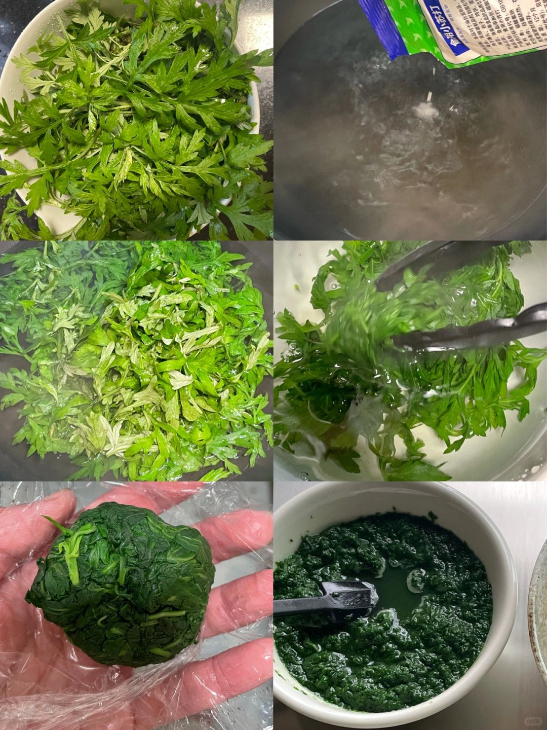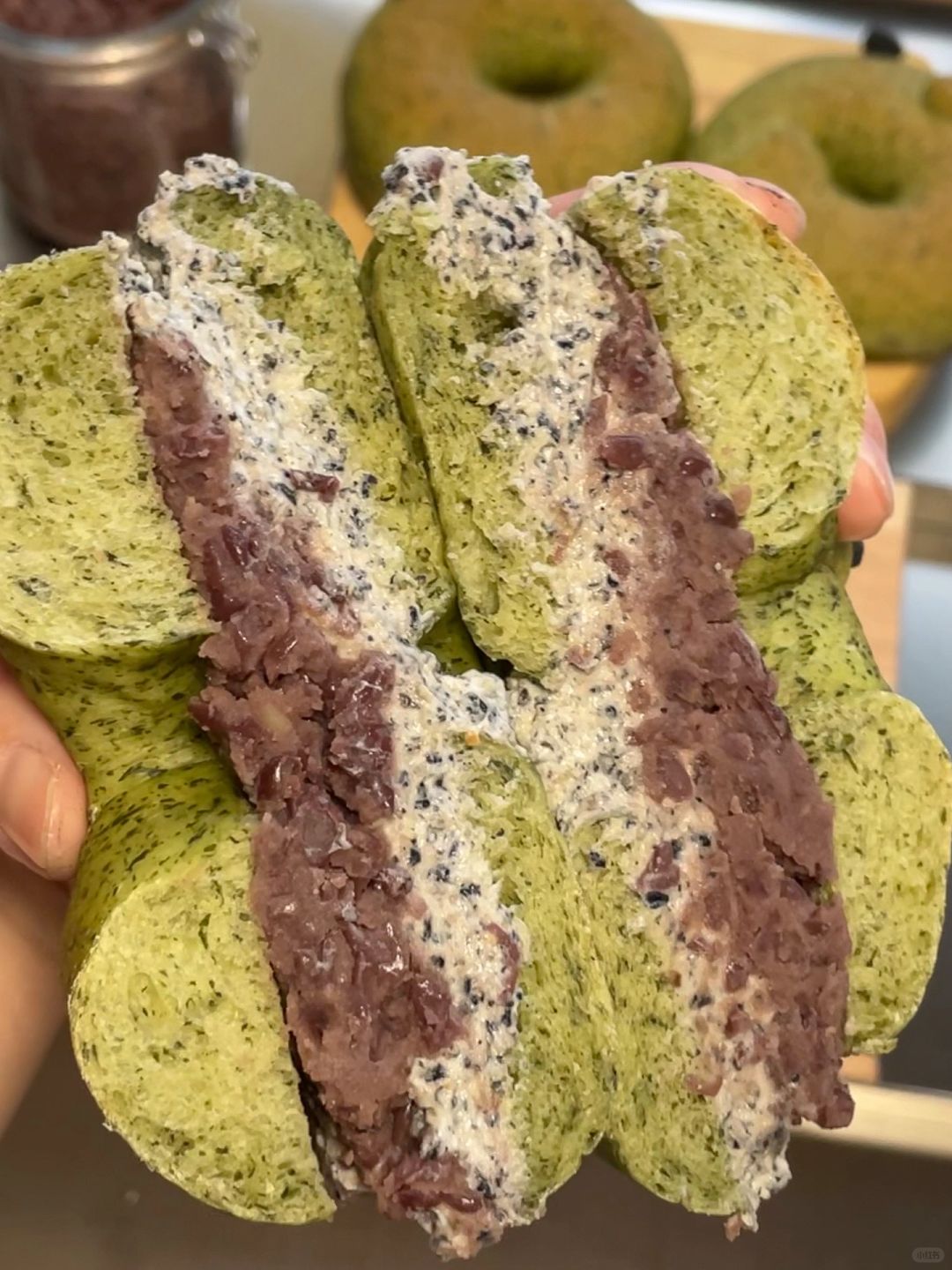 春天是吃艾草的季节 我真的敲很喜欢艾草的味道 今天就将艾草揉进面团里 艾草贝果里夹上厚厚的自制芝麻奶酪和红豆泥 实属养生贝果了! - 处理艾草: 1️⃣艾草选取叶子和嫩梗的部分,洗干净后备用 2️⃣烧一锅水,水烧烤后加入适量苏打粉(加入苏打粉可以保持颜色翠绿),把洗好的艾草放入锅里,烫个一分钟捞起 3️⃣捞起放到冷水里,挤开水分就可以了(可以一次处理多一点,分成每个50g,放到冰箱急冻保存) - 艾草贝果 材料: 高筋面粉300g、处理好的艾草50g、清水130g、酵母3g、盐3g、白糖15g 步骤: 1️⃣将处理好的艾草和清水加入到破壁机里,打成艾草泥 2️⃣将高筋面粉、艾草泥、酵母、盐、白糖加入到面包机里,按揉面模式 3️⃣揉好的面团盖布室温发酵2贝大 4️⃣发酵好的面团,分两小块出来做表情,一份加入竹炭粉,剩余的面团均分成5份 5️⃣分好的面团团圆后,盖布松弛静置10分钟 6️⃣ 松弛好的面团擀成长方形后翻过来,再继续擀薄排气,卷起来后在封口处捏紧 ,稍微再搓一下,将面团的一端成牛舌状后包住另一端 ,再给贝果加上表情 7️⃣放入烤箱发酵模式34度发酵30分钟 8️⃣糖水:1000ml清水+40g白糖,贝果放入微微煮沸的小锅里煮25秒 9️⃣烤箱提前预热后上火205 下火175烤16分钟 - 红豆泥 提前一晚泡好的红豆,放入电饭锅里按煮粥模式,煮到红豆软烂,将煮好的红豆倒入奶锅里,加入冰糖和黄油,小火把水分熬干,熬好的红豆泥装入到干净的密封罐里