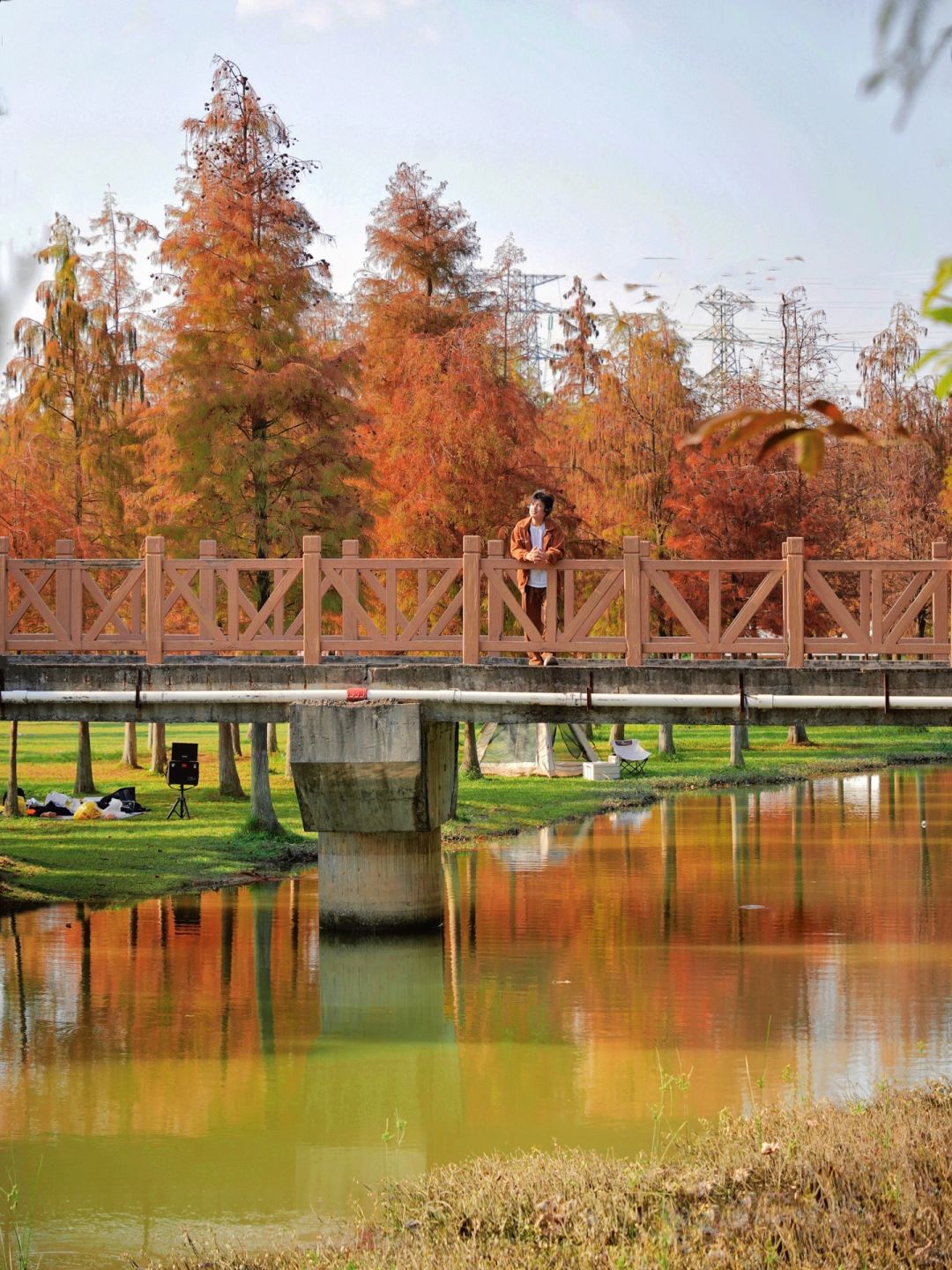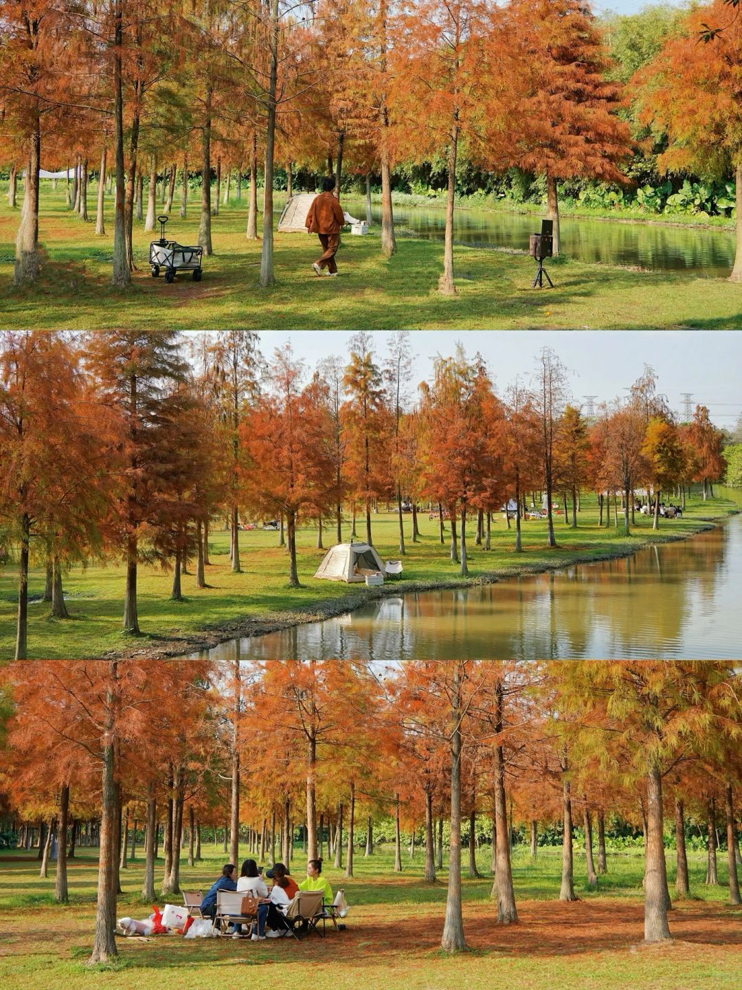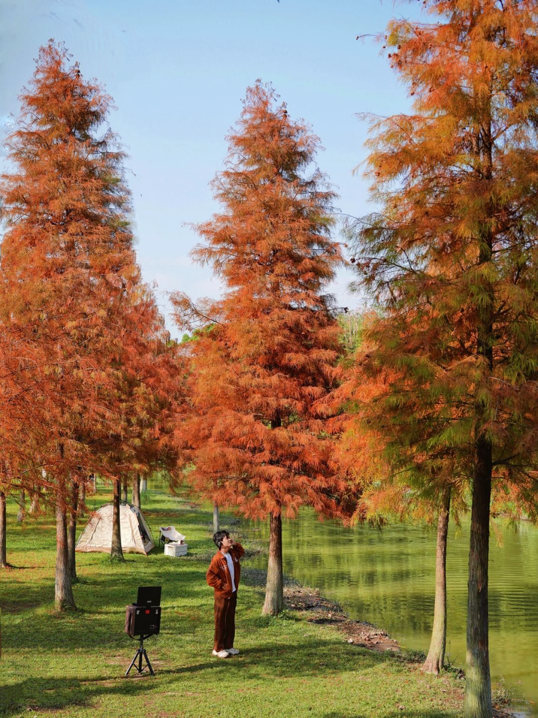 成片的落羽杉被江水包围着,晴天透进来的阳光让这红彤彤的树林变成了童话森林。无论是来这里露营、野餐拍照📸,都一定会惊艳到你。