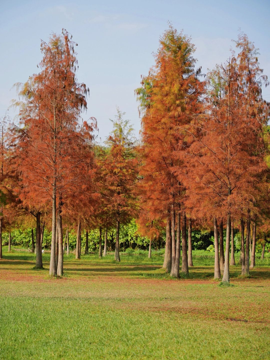 2️⃣过来游玩拍照,在东二门就有租单车骑行,可以环绕公园骑行。可以导航:中央群岛公园,距离1公里。这边落羽杉更多,沿江全是落羽杉,骑行拍照很出片。