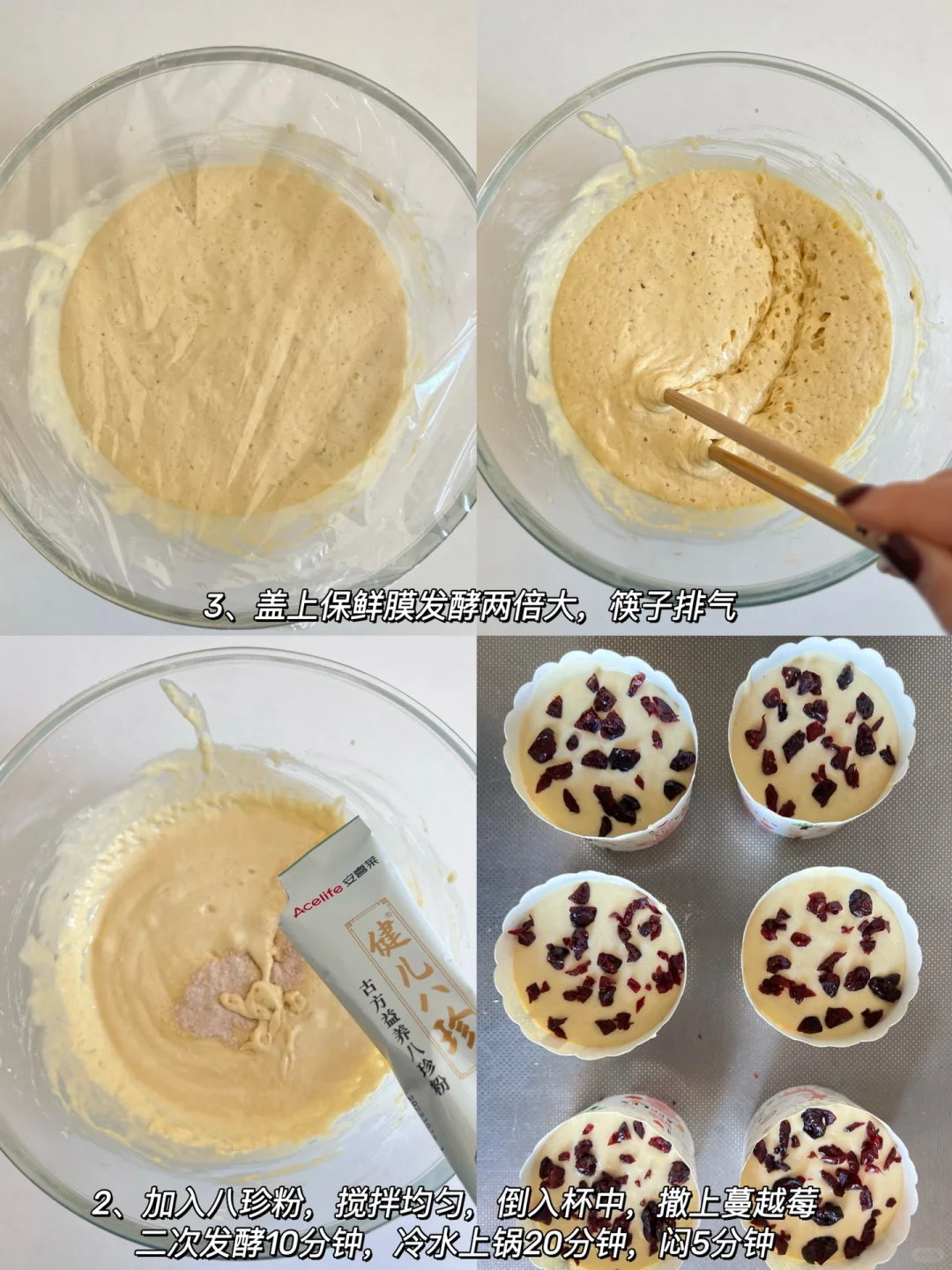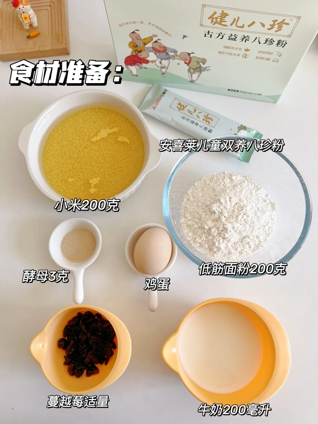 今天给大家分享一款我们全家都很爱吃的蔓越莓小米发糕,小米大家都知道好处多多啦,小朋友吃小米也能健脾养胃哦,妈妈们快安排起来啦! 🧑🏻‍🍳食材: 小米200克、牛奶200毫升、鸡蛋1个、酵母3克、低筋面粉200克、蔓越莓适量(一岁以内的可以放红枣或者葡萄干、熟黑芝麻都可以哈) 🧑🏻‍🍳制作步骤 1、小米提前泡发4个小时,控干水分,放入料理机加入配方奶打成米浆,加入鸡蛋和酵母、面粉搅拌均匀,盖上保鲜膜发酵到2倍大 2、筷子搅拌排气,搅拌均匀,倒入纸杯或者碗中刷油垫油纸,轻震一下,表面撒切碎的蔓越莓碎,二次发酵15分钟,冷水上锅蒸20分钟,焖5分钟即可 说到小朋友养脾胃真的很重要,脾胃不好小朋友身高体重也不能达标,还会有便便时间长、口臭、吸收不好等等问题啦,妈妈们一定要及时发现哦,我月亮之前就是便便时间长,所以我就比较注重食养,八珍粉就是最好的选择了,我一直在用就是安喜莱儿童双养八珍粉,分袋包装也是很方便,虽然很小众但它是专为儿童定制改良的,添加了燕麦、魔芋优质的膳食纤维,用山楂、红枣来减轻芡实、茯苓的苦味,而且粉质很细腻。不论是做辅食放进去,还是直接冲泡,宝宝都超爱吃!1~10岁的小朋友一定要看看~