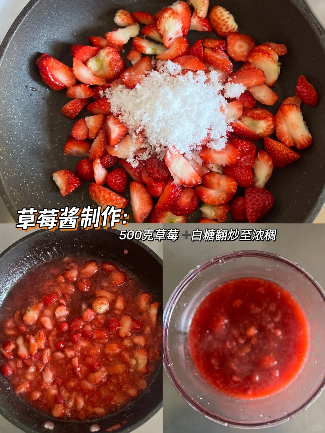 制作步骤:将草莓丁和糖倒入不粘锅中小火加热不停翻拌,加入柠檬汁继续翻拌到草莓酱粘稠,凉凉备用