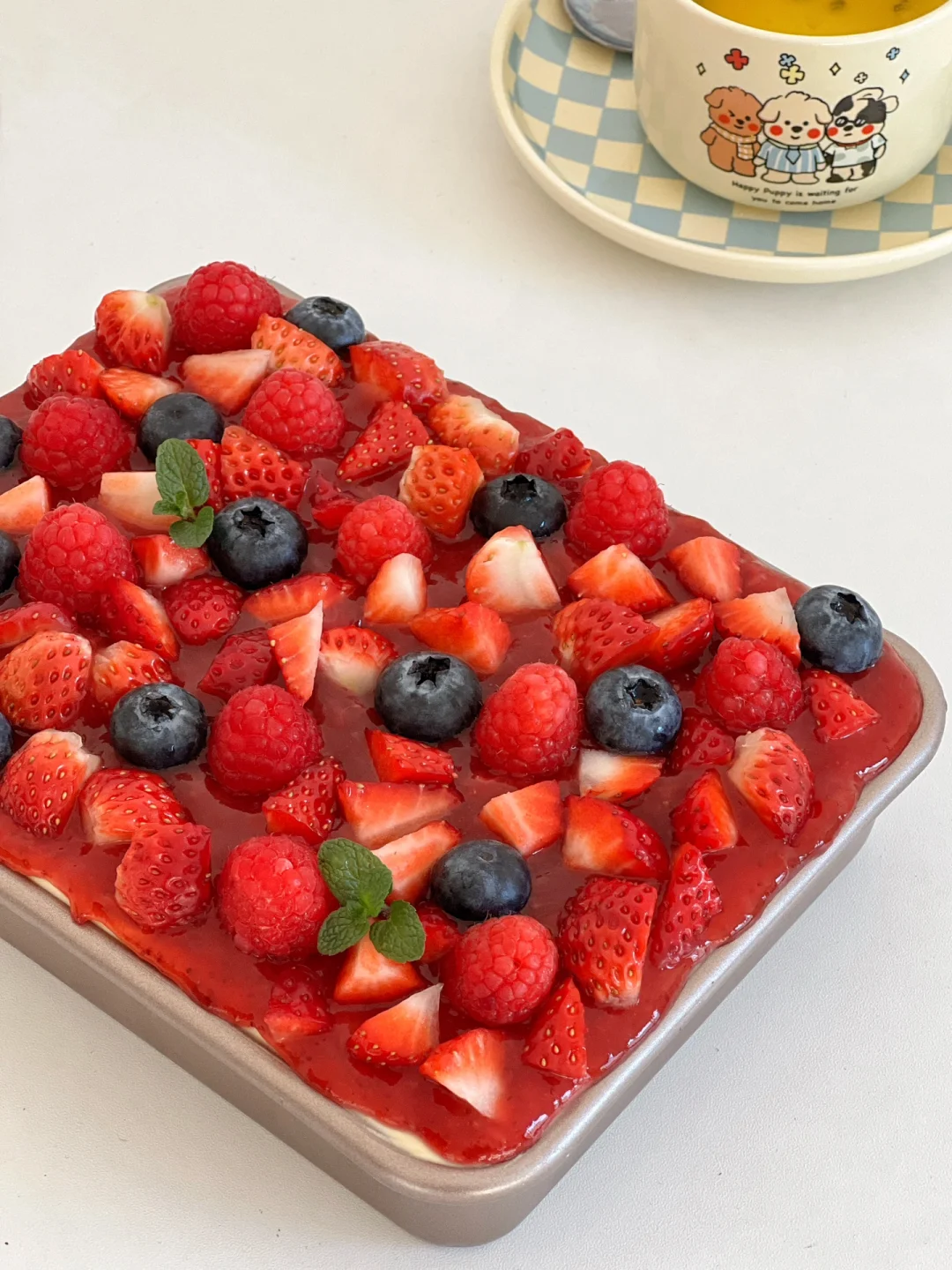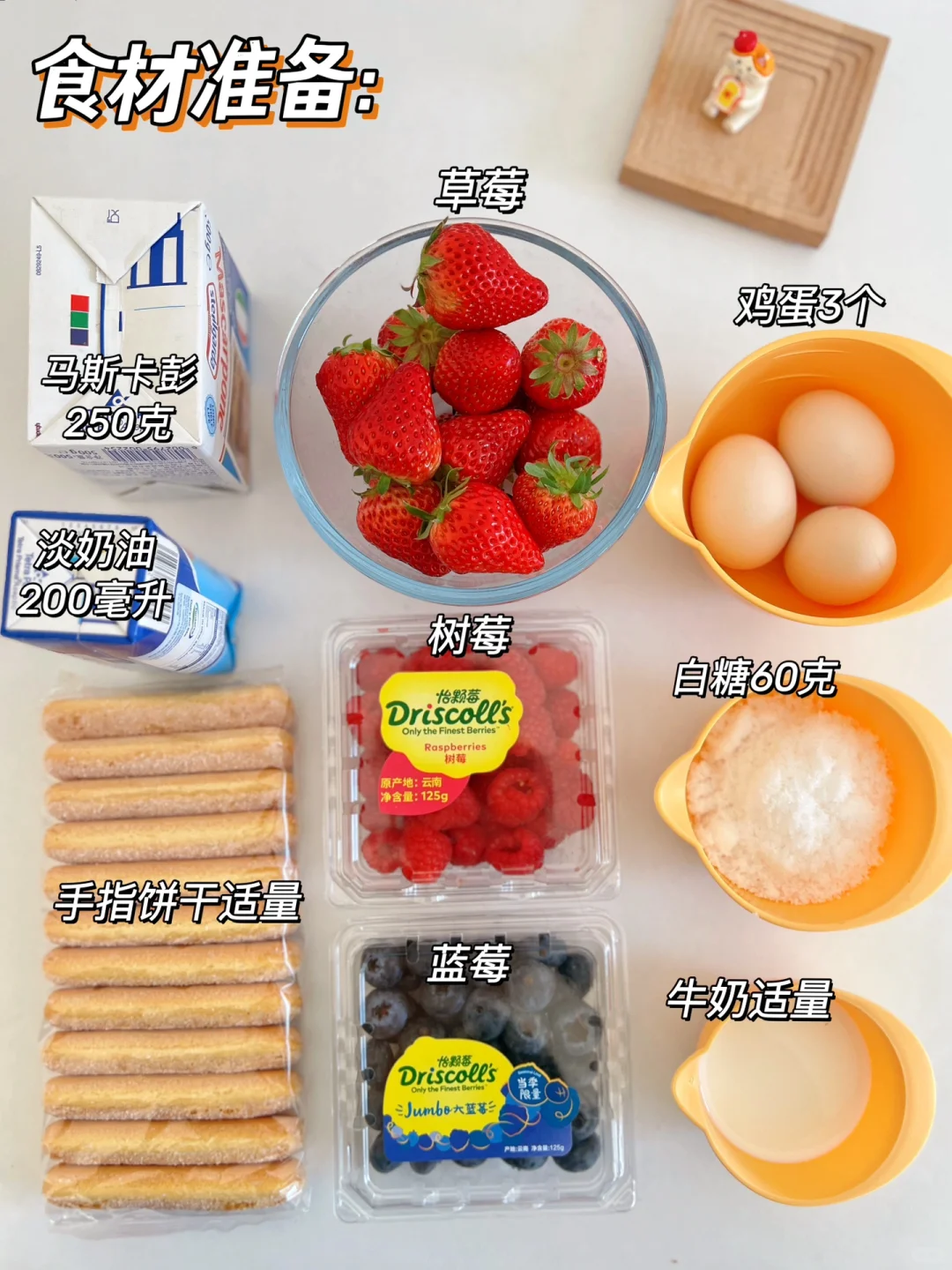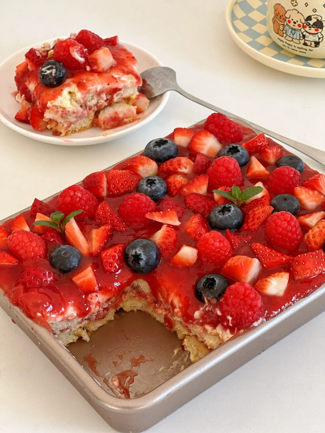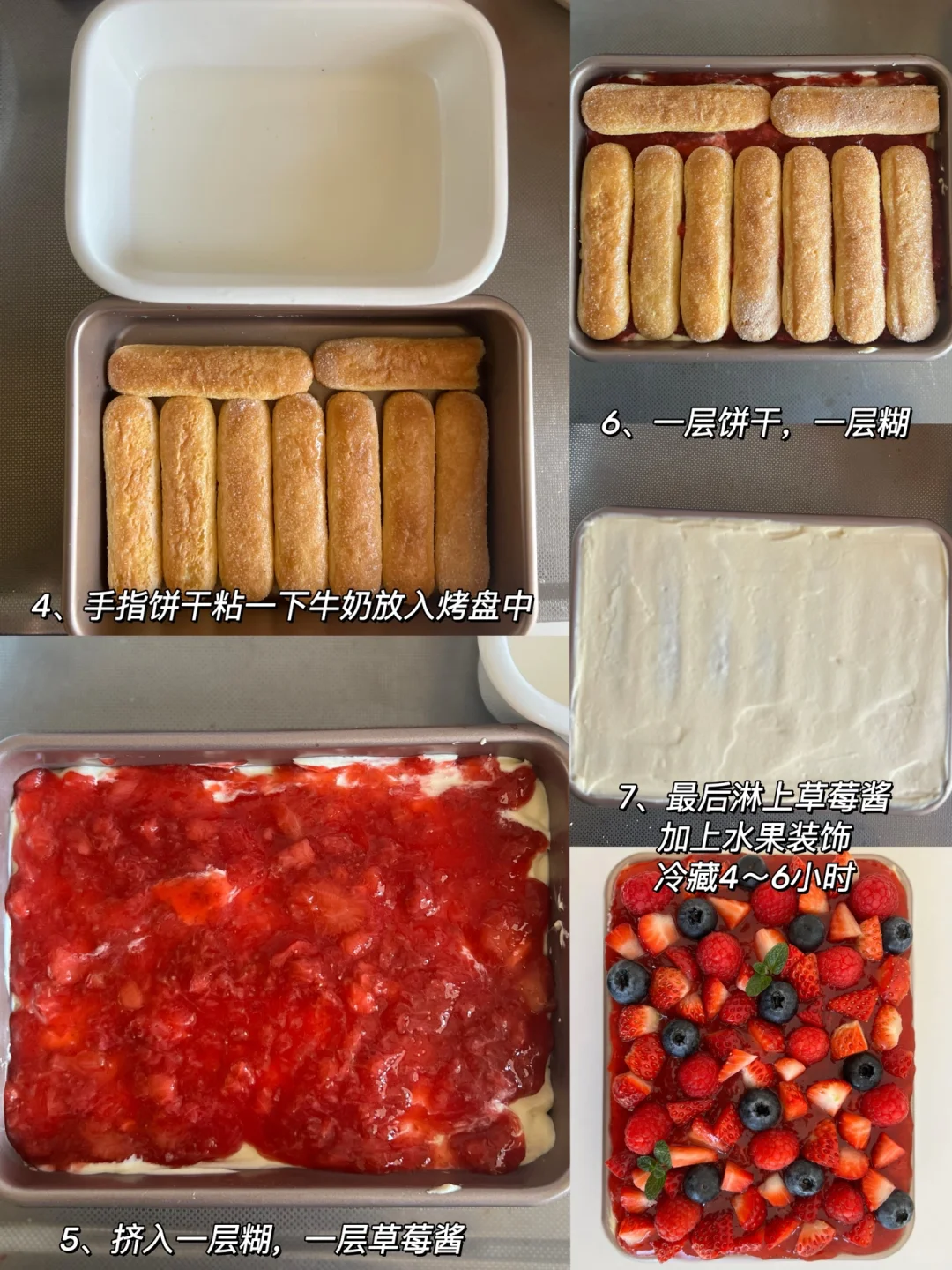 2、手指饼干两面沾牛奶,不要太湿,一层手指饼干一层提拉米苏糊糊,一层草莓酱,再一层手指饼干一层提拉米苏糊糊,最后铺上一层厚一些的草莓酱放入冰箱冷藏4-6小时,拿出后用水果装饰就可以啦,这次我用的还是我们家经常吃的Driscolls怡颗莓,月亮最爱吃蓝莓,树莓,来自云南,日照充足,个头超级大和饱满,超级适合做甜品,蓝莓粒粒脆甜,红色树莓酸甜低卡,太适合我这个减脂人士啦,姐妹们安排起来✌️