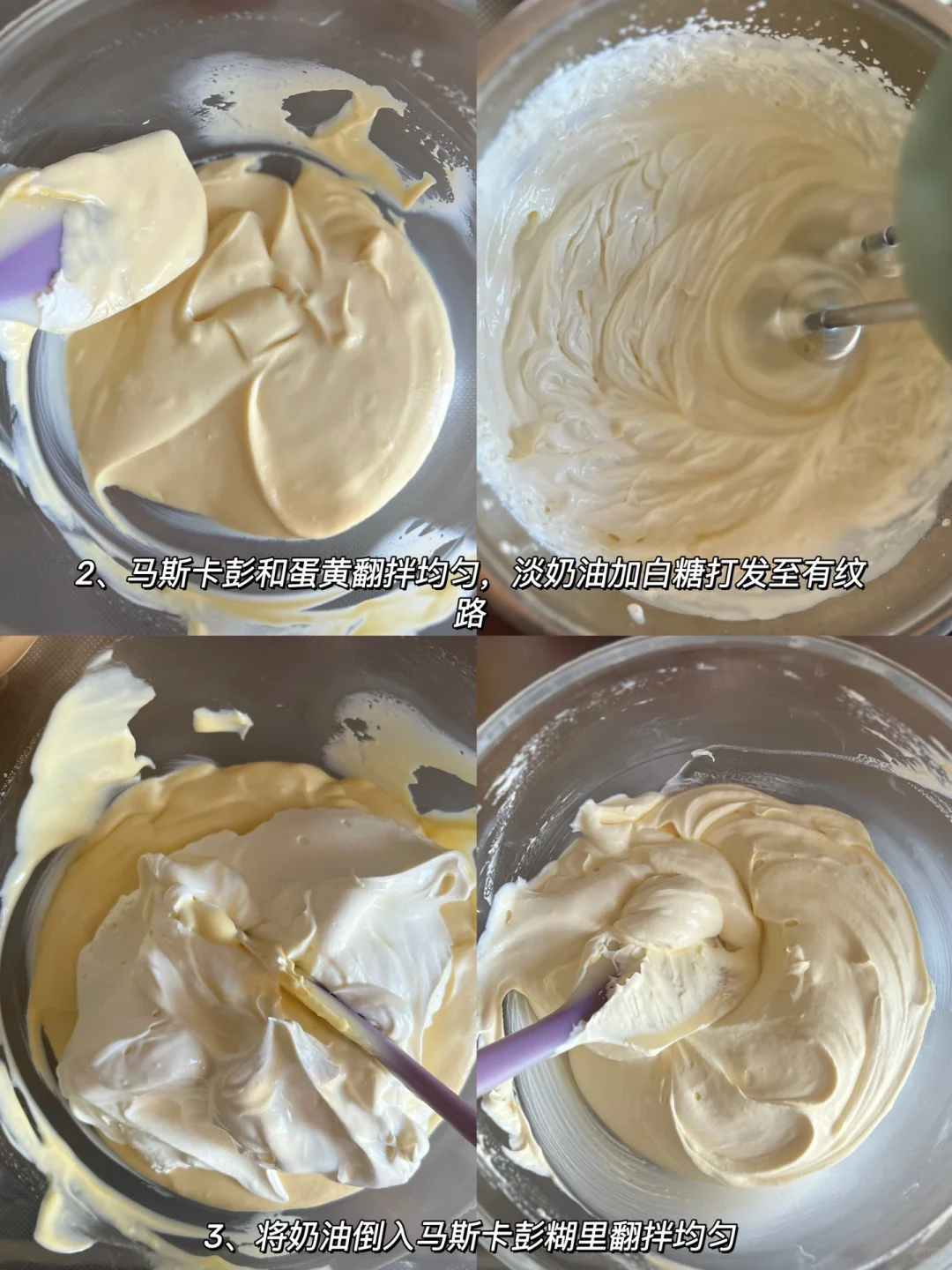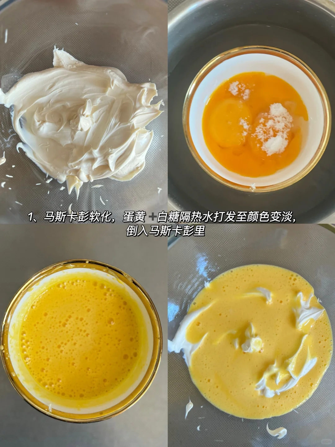 1、马斯卡彭室温软化,蛋黄和糖隔热水打发至颜色变浅,与软化后的马斯卡彭混合均匀,淡奶油打发至有纹路,与马斯卡彭糊翻拌均匀