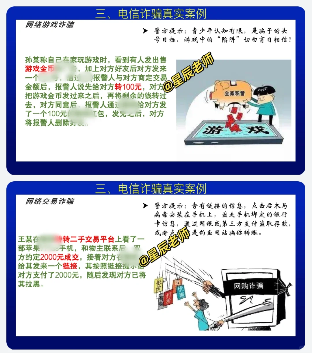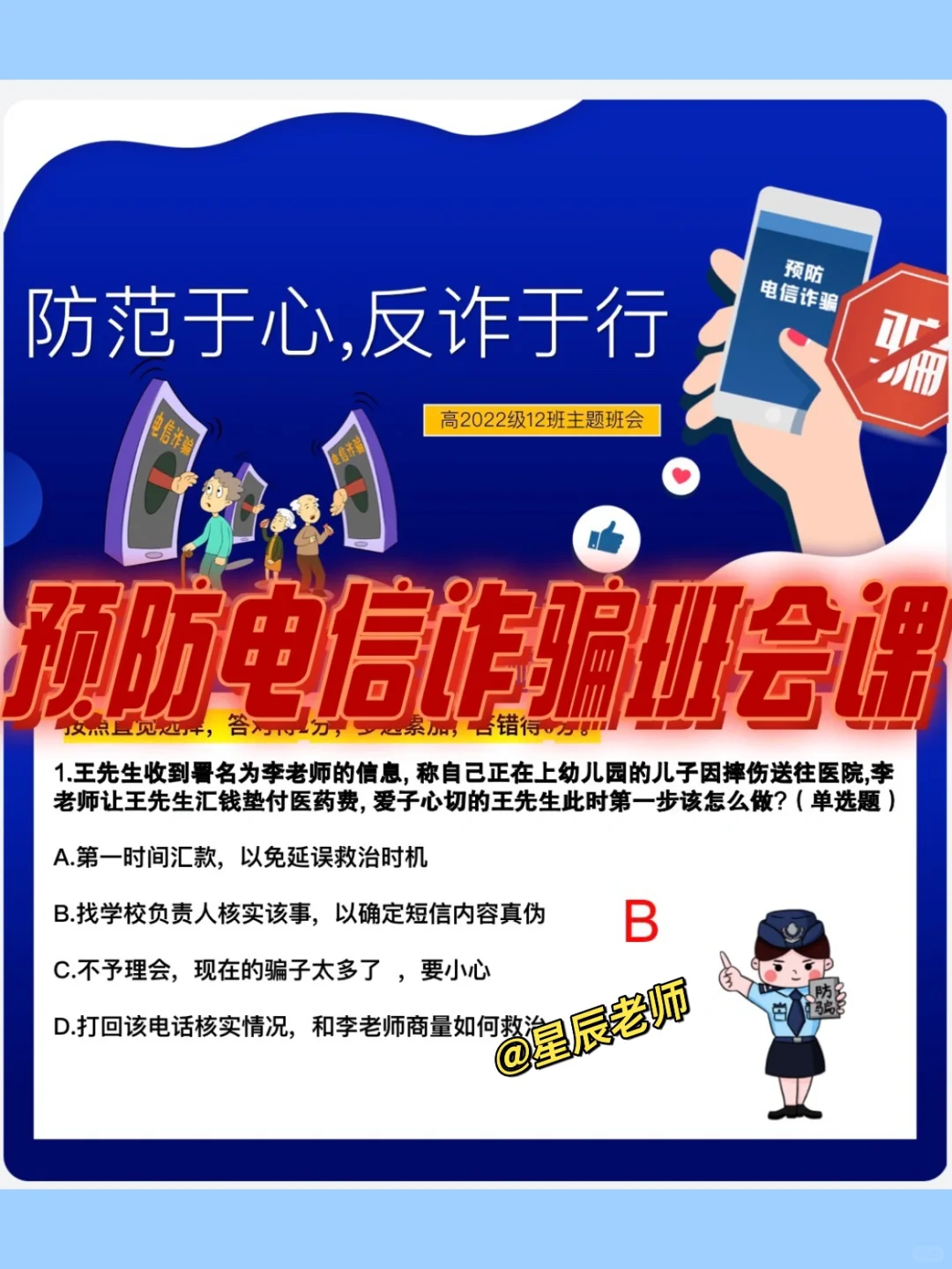 [紫色心形R]主题:防范于心,反诈于行—预防电信诈骗主题班会 [蓝色心形R]内容:ppt23页➕视频 [绿色心形R]班会流程: 1⃣️导入环节:通过问卷了解自己的“被骗”指数,引发学生的注意和思考。 2⃣️主体活动: —什么是电信诈骗 —常见的电信诈骗案例 —如何预防诈骗 —如果被诈骗了,怎么办? 3⃣️总结阶段 老师进行简要总结,提醒学生关键点,并观看视频。 🌿注意事项:上课前可分小组谈论对电信诈骗的认识,如果每一个小组都进行演讲,效果会更好。