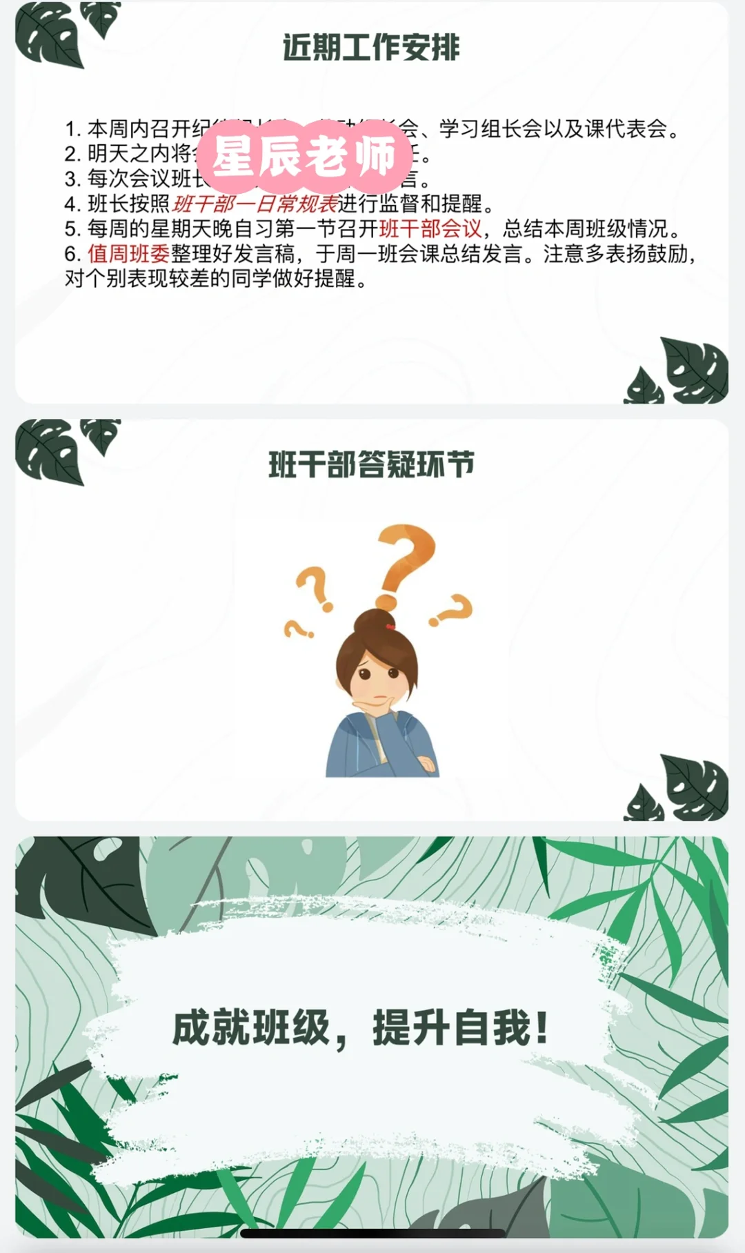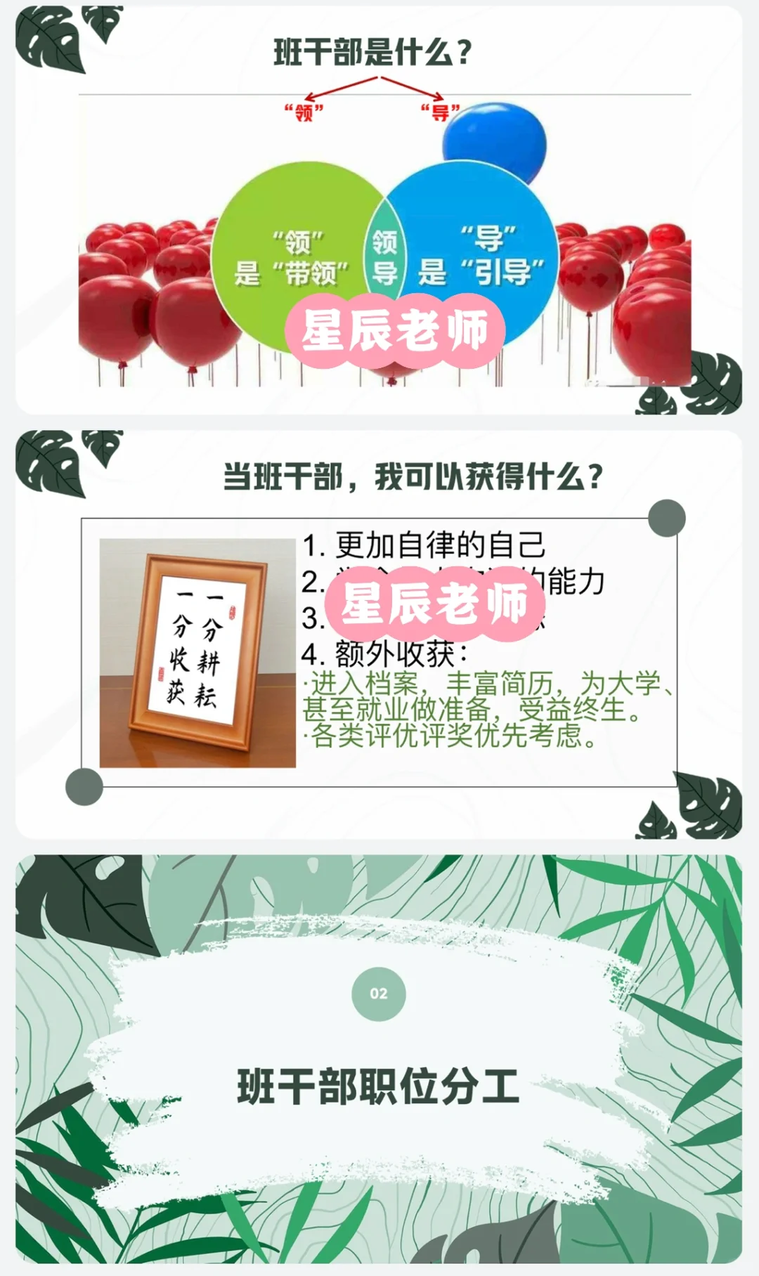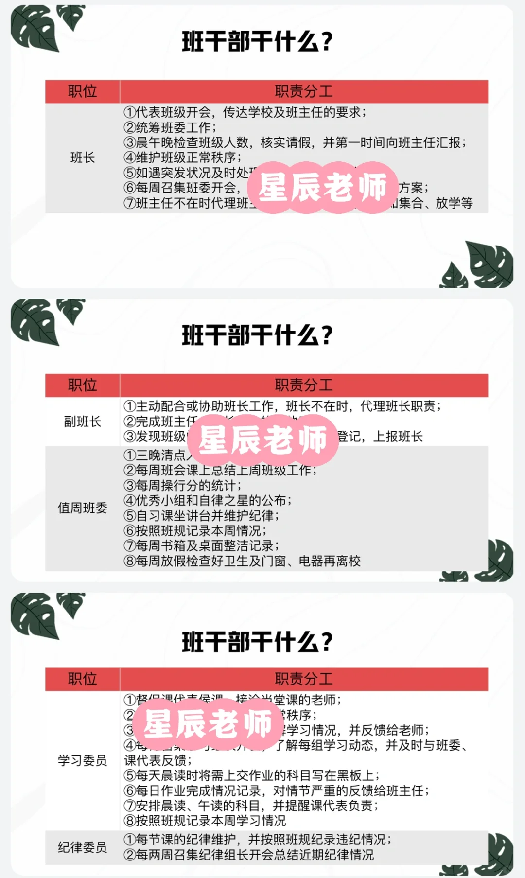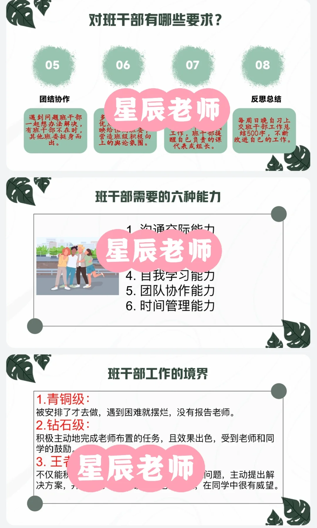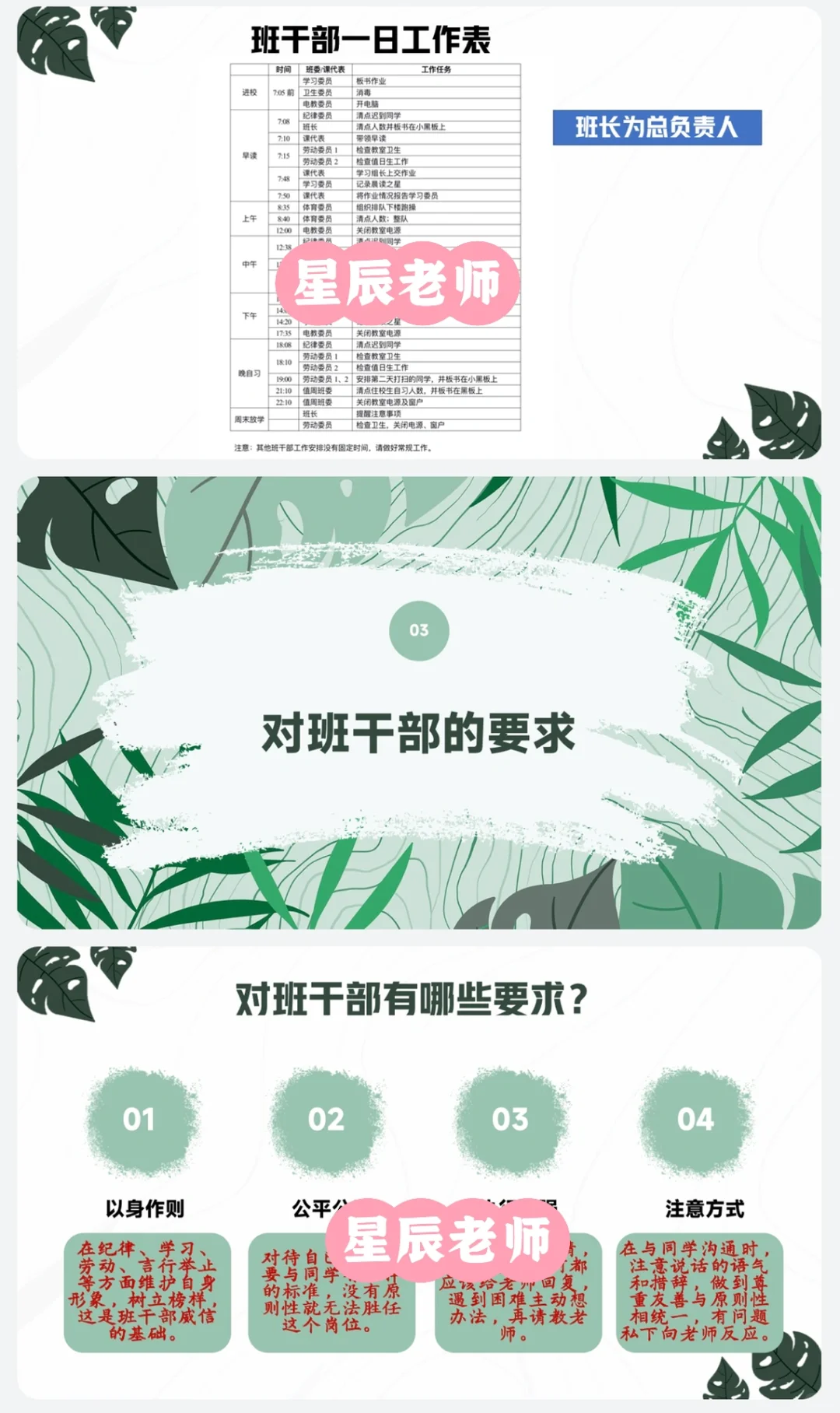 大家好,我是星辰老师,千呼万唤的班干部培训ppt来啦[满月R]共23页😎 主要分为四个板块: [一R]对班干部的认识 [二R]班干部职位分工 [三R]对班干部的要求 [四R]近期工作安排 班干部是分担班主任工作的利器,培养好了班主任真的可以做到“甩手掌柜”哦🤭还有什么疑问都可以🐮言哦👉👉 下次见啦🌿