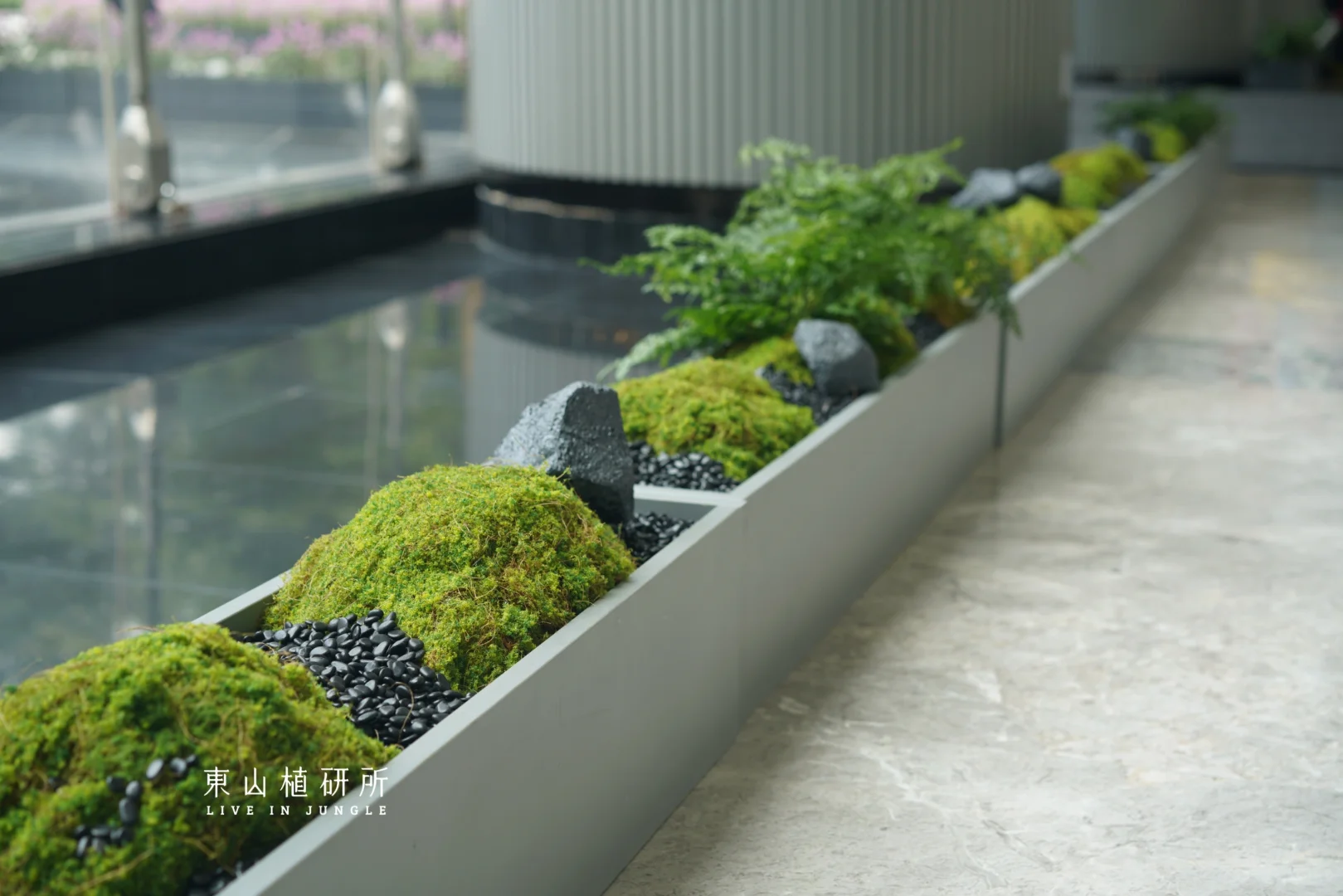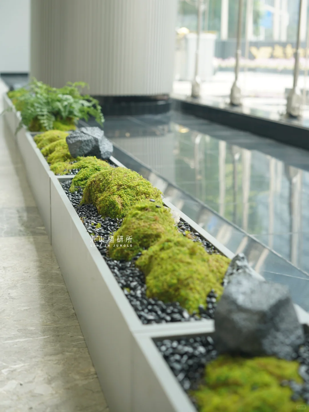 苔藓、蕨类搭配粗朴的石头🪨 细腻生机与坚实粗朴的元素结合 长条苔藓小景融入商业空间 增添自然、清新的氛围