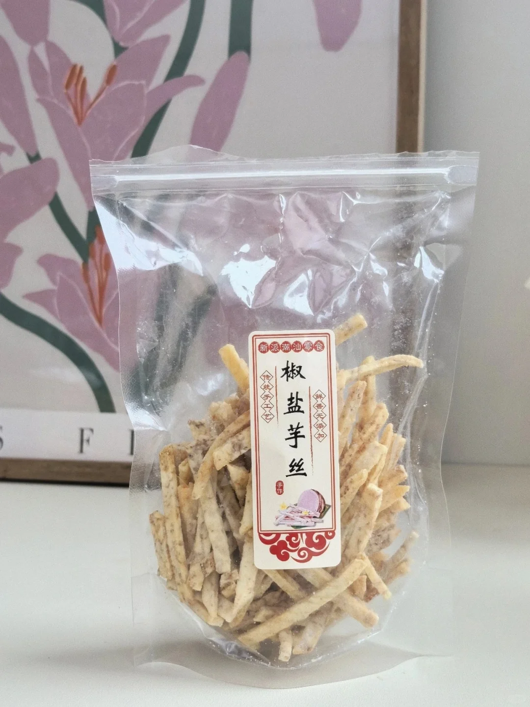 这是我上周我和闺蜜出去玩随便在路边买的,本来在买奶茶,隔壁摊子老板猛地招呼我过去,说这包芋头丝今天卖了好多包,保证我吃了会回头再买。