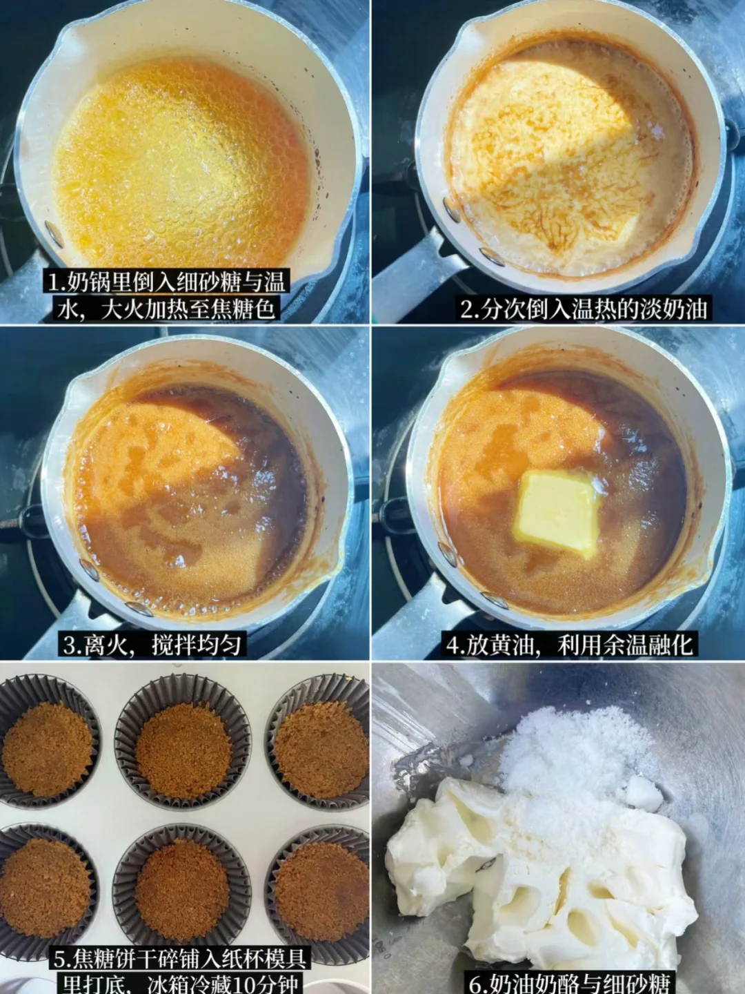 ⚠️熬煮焦糖的时候,轻晃奶锅就可以,不要搅拌糖水,避免反砂。这款芝士蛋糕没有吉利丁,需要冷冻凝固