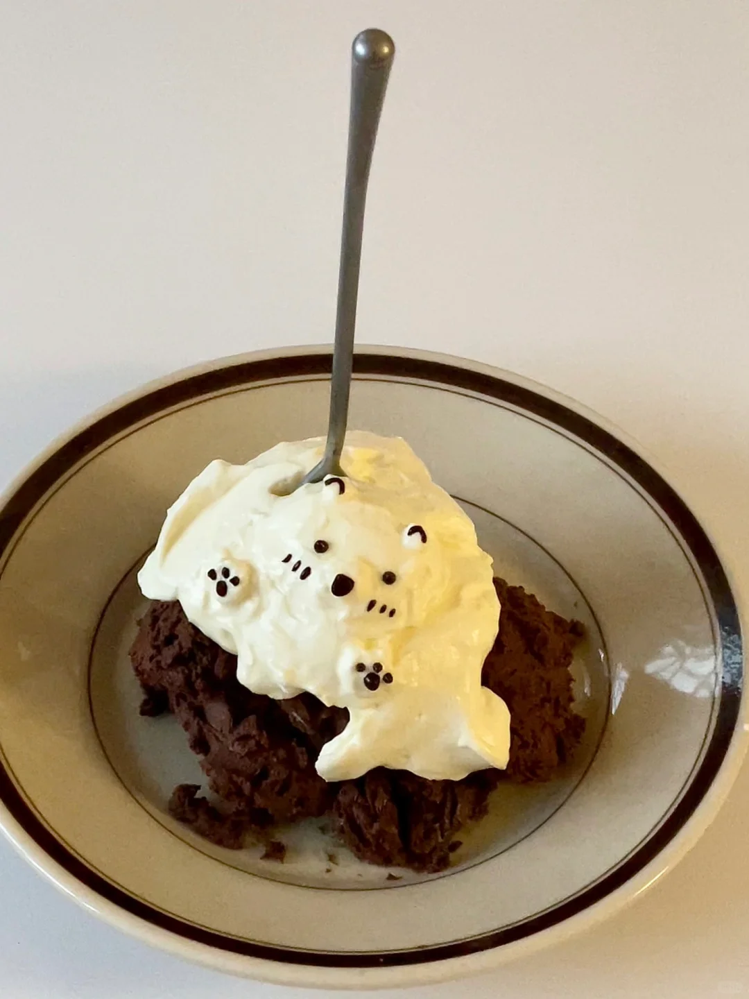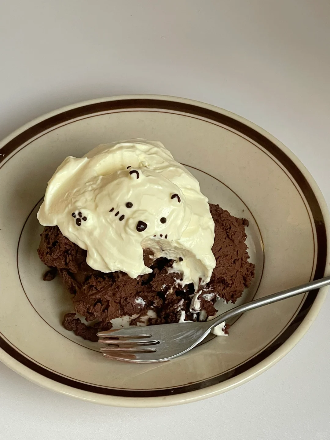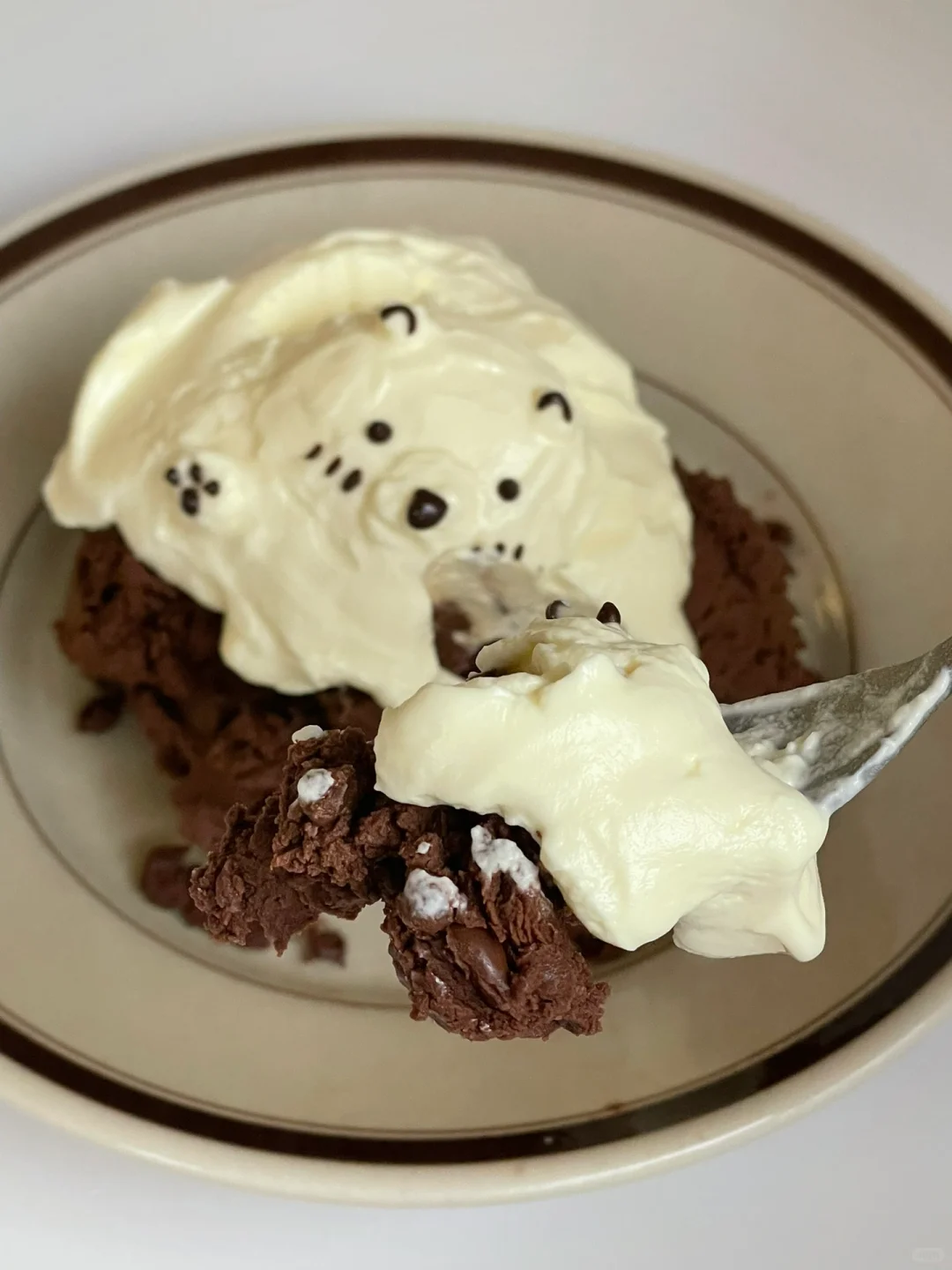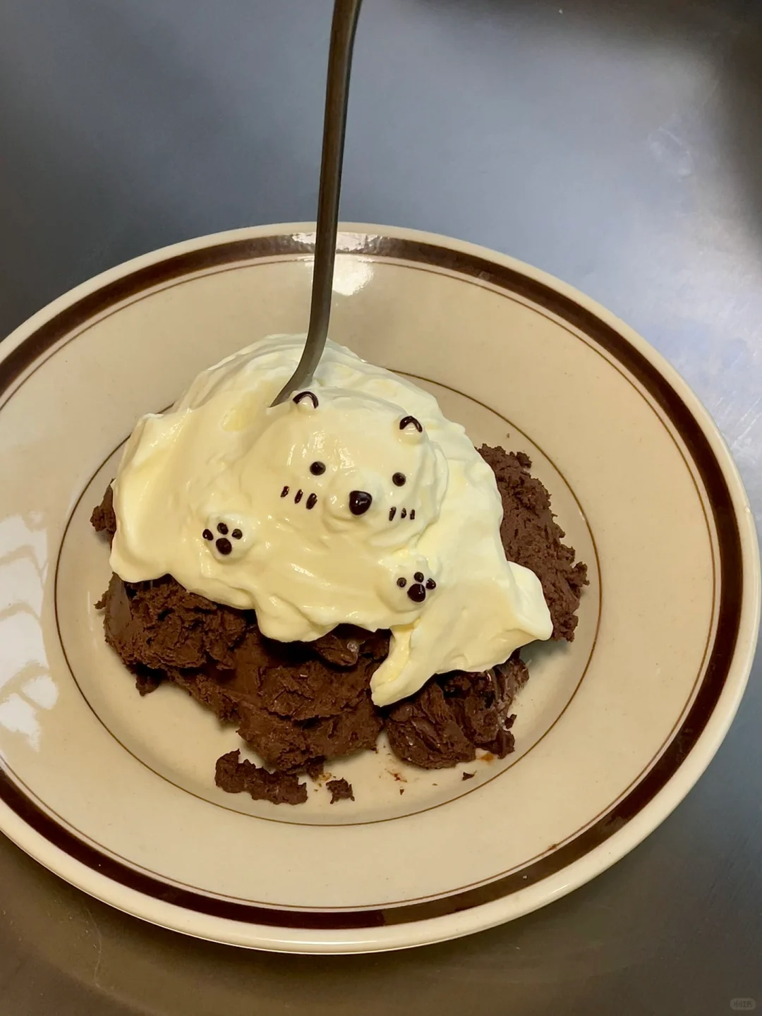 6️⃣做好的巧克力慕斯刮到盘子里,顶上加上打发好的奶油