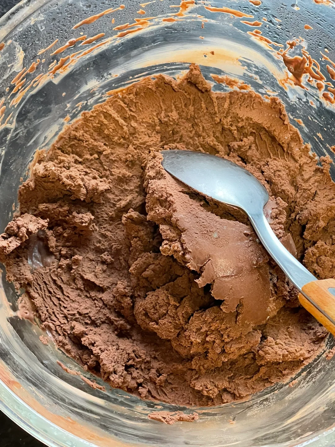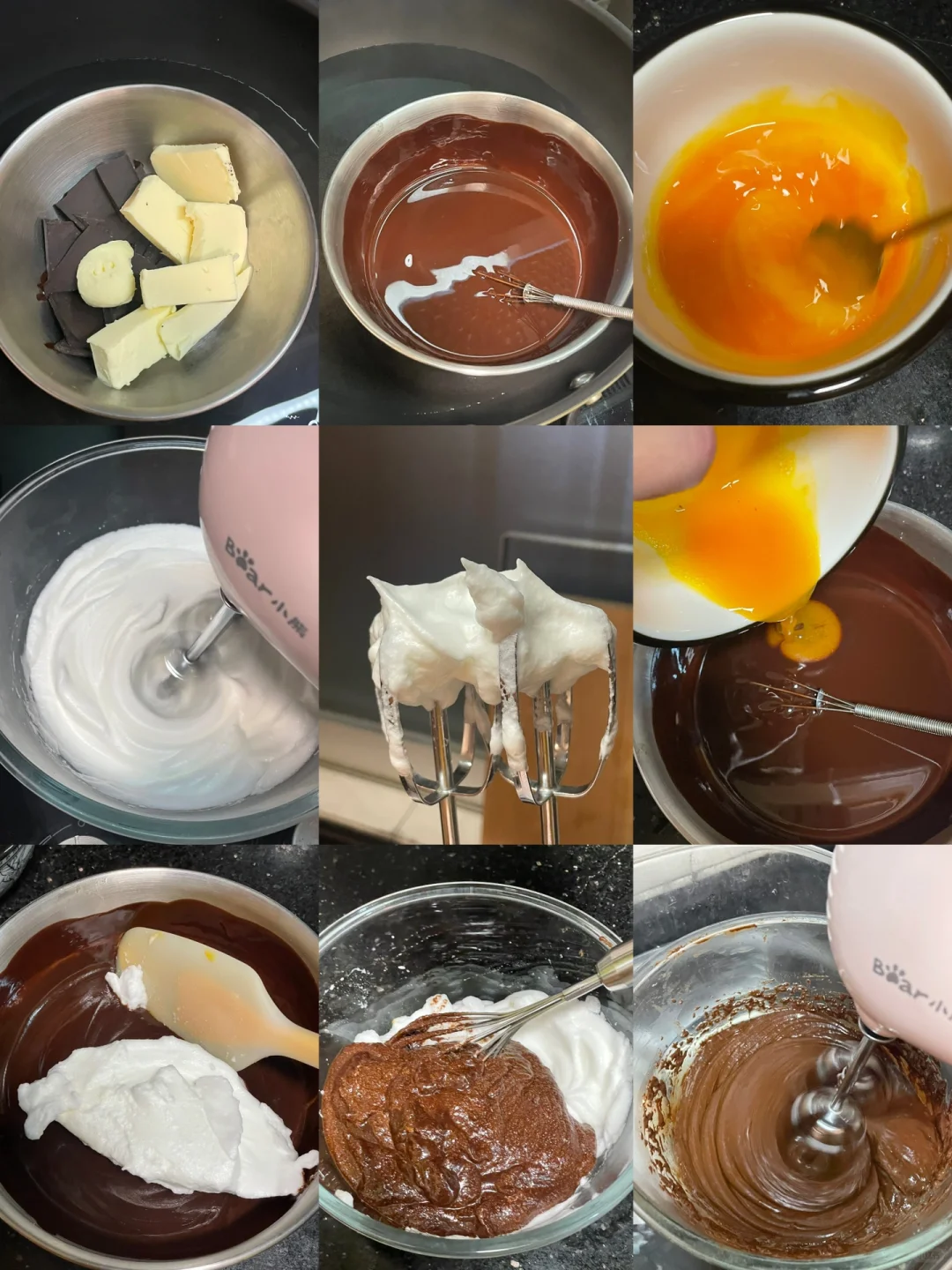 4️⃣蛋清加白糖打发硬挺,取蛋白三分之一混合到巧克力糊里,搅拌均匀后倒剩余的蛋白里,用打蛋器打发顺滑