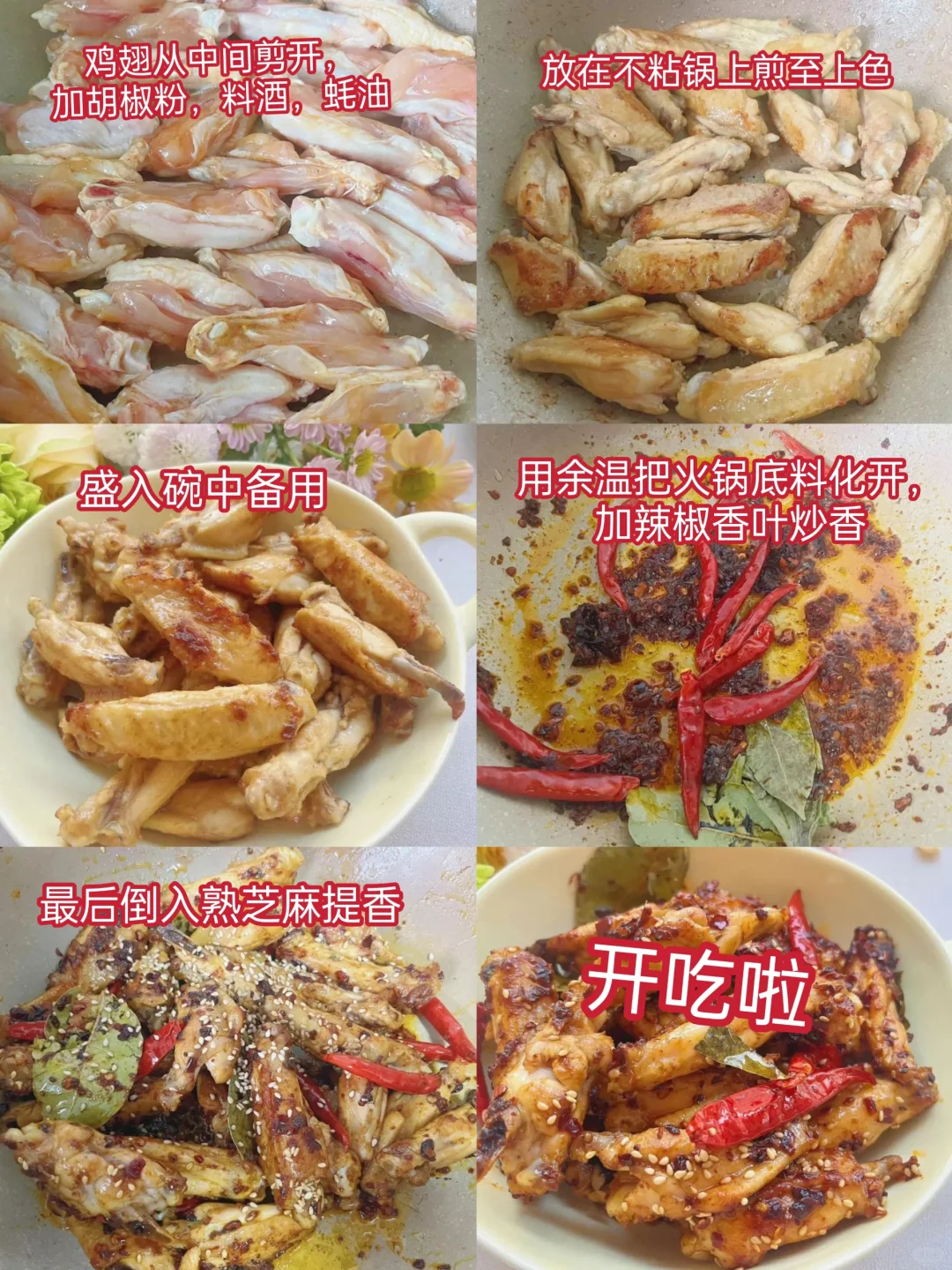 [三R]在锅里用余温把火锅底料化开,这样就不会糊掉了,再调小火,加入辣椒,香叶,一起翻炒出香味,在把鸡翅倒入一起翻炒入味,最后再倒入熟芝麻提香就好啦~