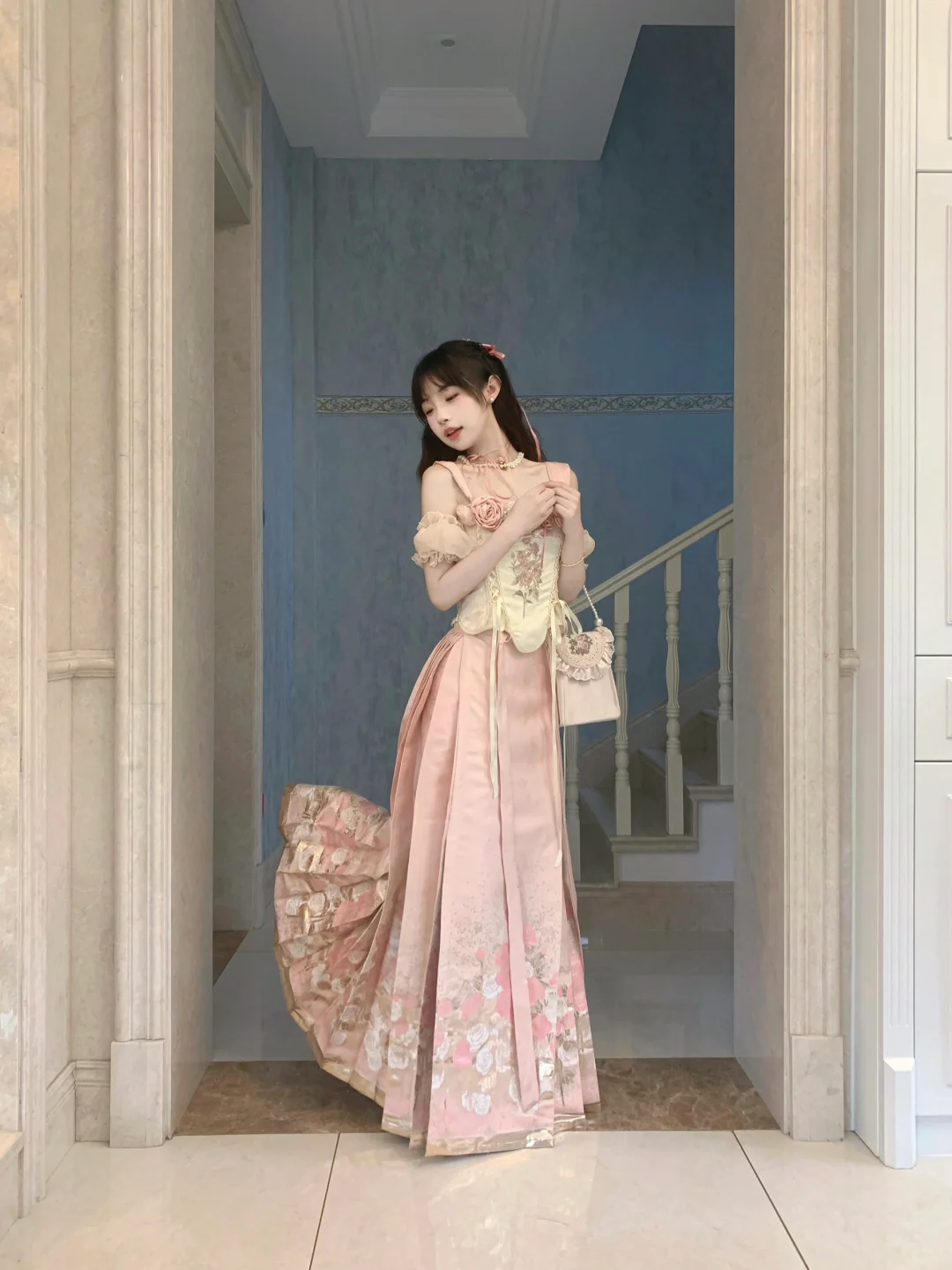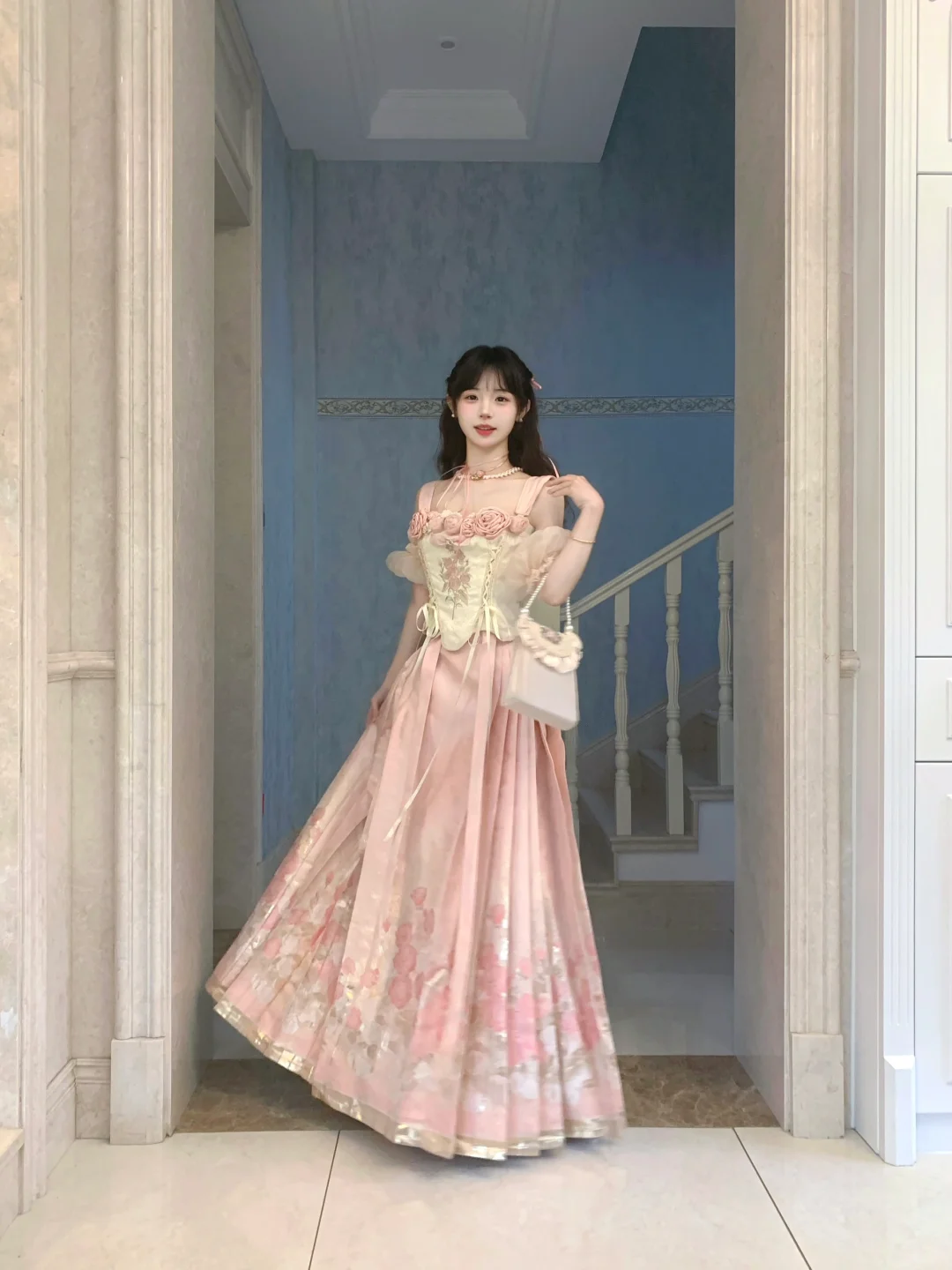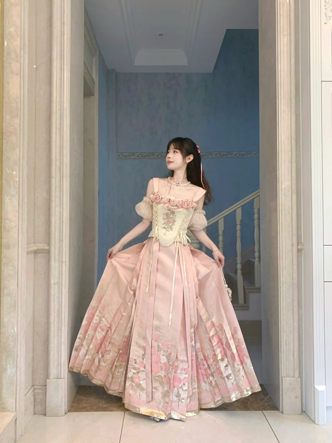 我的春日马面裙时刻: 复古玫瑰胸衣➕粉色马面裙 西式与中式的碰撞🫧 真的太优雅啦~