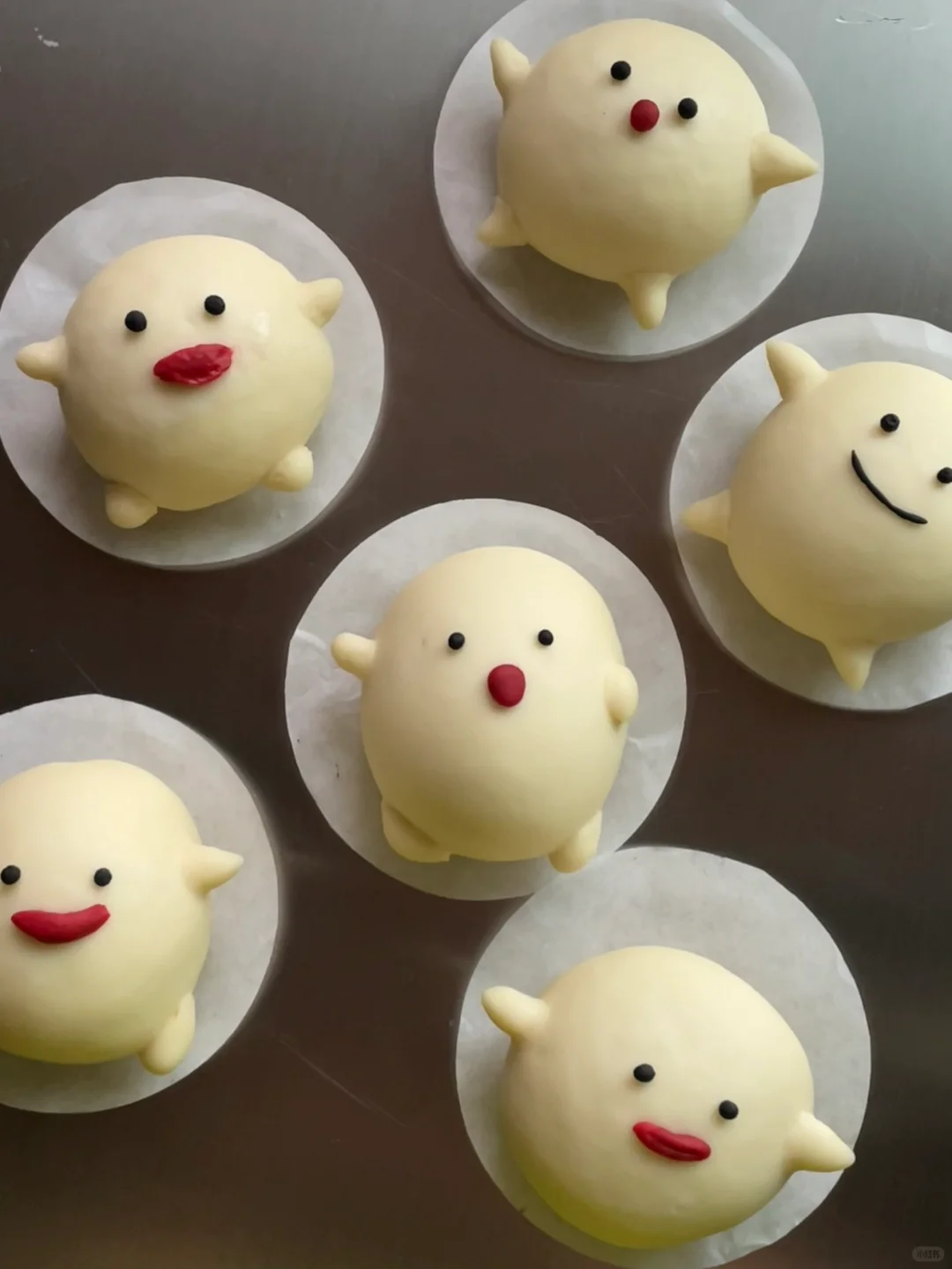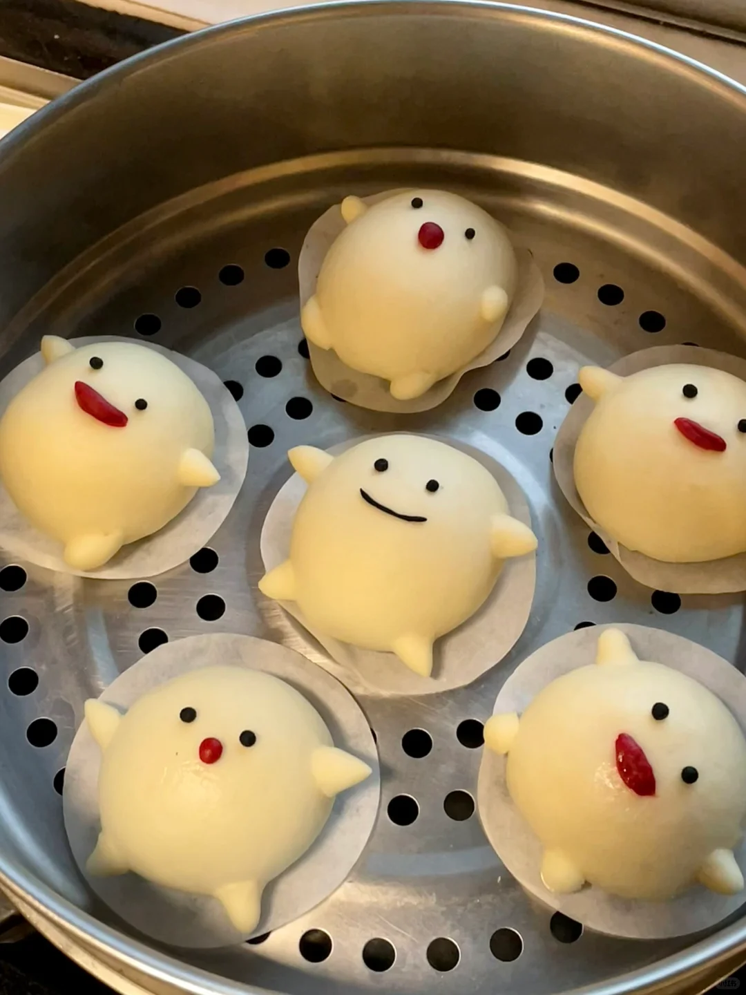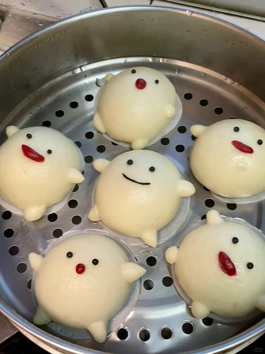 白乎乎胖嘟嘟的哇啦哇啦太可爱了吧 蓬松暄软还有满满的水光肌 真的忍不住想戳戳他! - 材料:(6个) 中筋面粉150g 冰牛奶90g(可预留10g)根据面粉吸水性不同做增减 耐高糖干酵母1.5g 白糖5g - 步骤: 1️⃣酵母倒入到冰牛奶里,搅拌均匀,调好的酵母牛奶粉分批倒入到面粉里,边倒边搅拌,搅拌成絮状 2️⃣用手揉成面团,盖上保鲜膜静置10分钟,让面粉和水自己融合下 3️⃣面团静置的时候就可以准备豆沙馅,每份20g/个 4️⃣将面团转移到案板上,用手掌根部的力量去揉,再用擀面杖反复擀平排气,揉到面团光滑,切面无气孔为止(这个步骤比较费手费力) 5️⃣预留点面团拿来做造型,其余的面团均匀分成6份,包入提前准备好的豆沙馅,收口捏紧,再给馒头加上细节 6️⃣锅里温水,把做的好馒头放在蒸锅里发酵15分钟 7️⃣中火蒸13分钟,关火后再焖3分钟