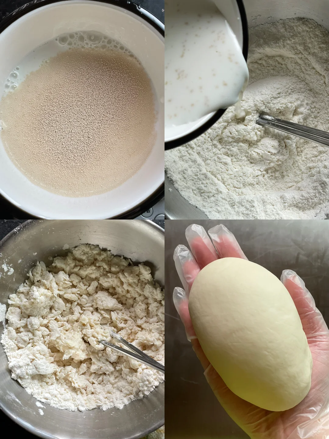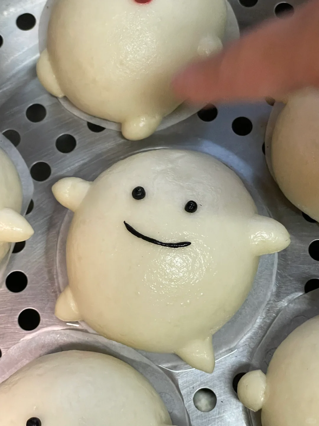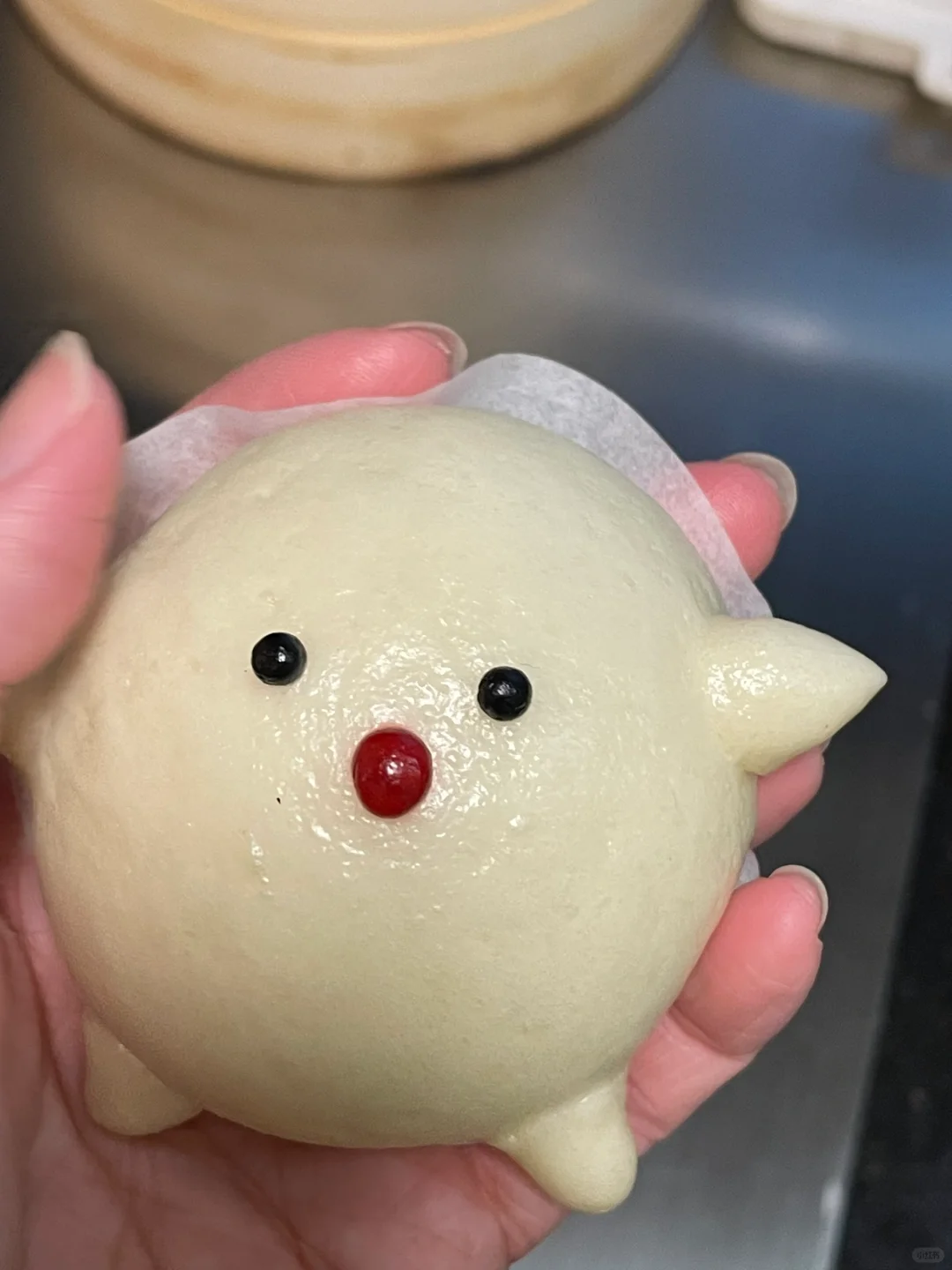 白乎乎胖嘟嘟的哇啦哇啦太可爱了吧 蓬松暄软还有满满的水光肌 真的忍不住想戳戳他! - 材料:(6个) 中筋面粉150g 冰牛奶90g(可预留10g)根据面粉吸水性不同做增减 耐高糖干酵母1.5g 白糖5g - 步骤: 1️⃣酵母倒入到冰牛奶里,搅拌均匀,调好的酵母牛奶粉分批倒入到面粉里,边倒边搅拌,搅拌成絮状 2️⃣用手揉成面团,盖上保鲜膜静置10分钟,让面粉和水自己融合下 3️⃣面团静置的时候就可以准备豆沙馅,每份20g/个 4️⃣将面团转移到案板上,用手掌根部的力量去揉,再用擀面杖反复擀平排气,揉到面团光滑,切面无气孔为止(这个步骤比较费手费力) 5️⃣预留点面团拿来做造型,其余的面团均匀分成6份,包入提前准备好的豆沙馅,收口捏紧,再给馒头加上细节 6️⃣锅里温水,把做的好馒头放在蒸锅里发酵15分钟 7️⃣中火蒸13分钟,关火后再焖3分钟