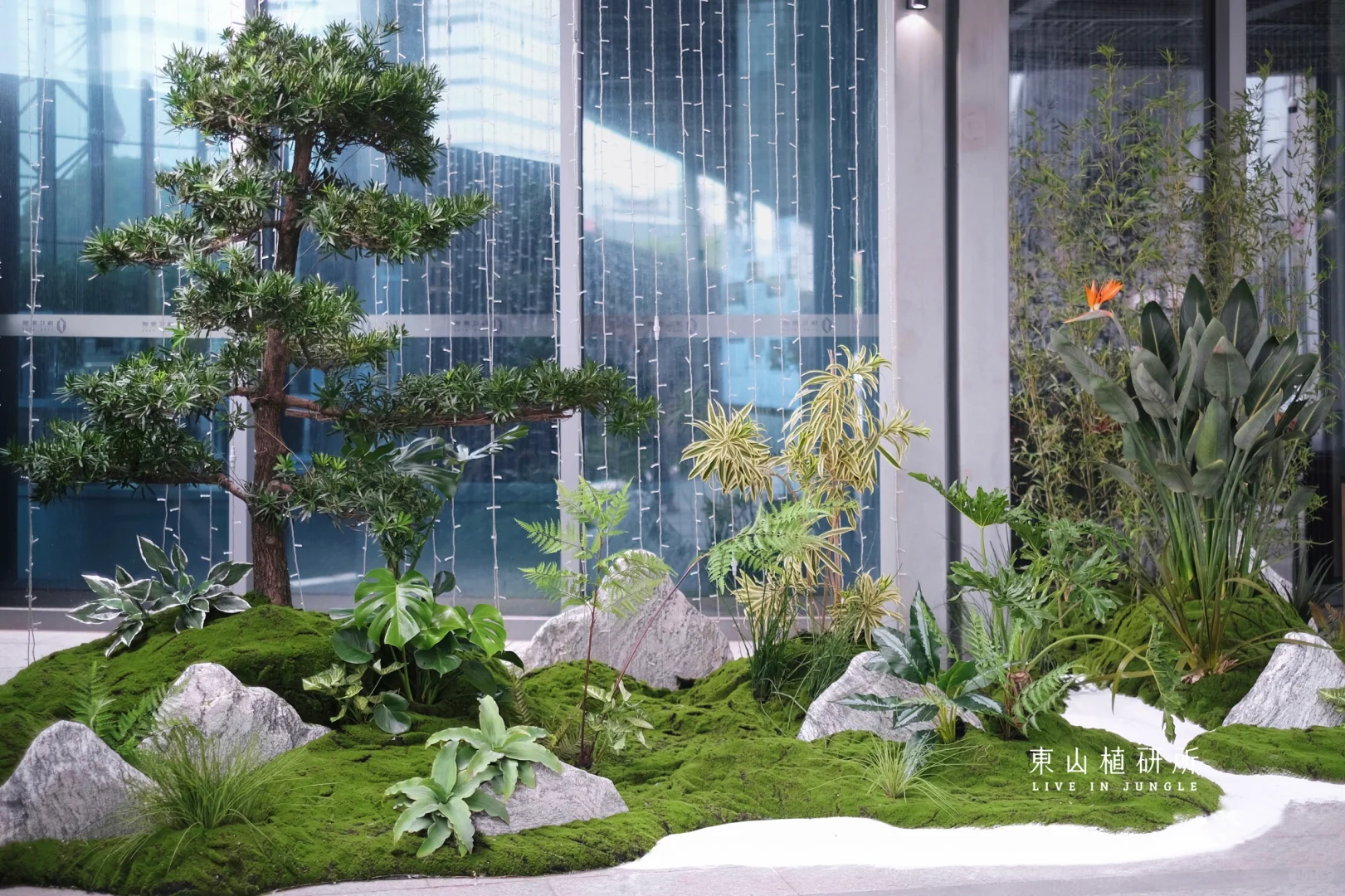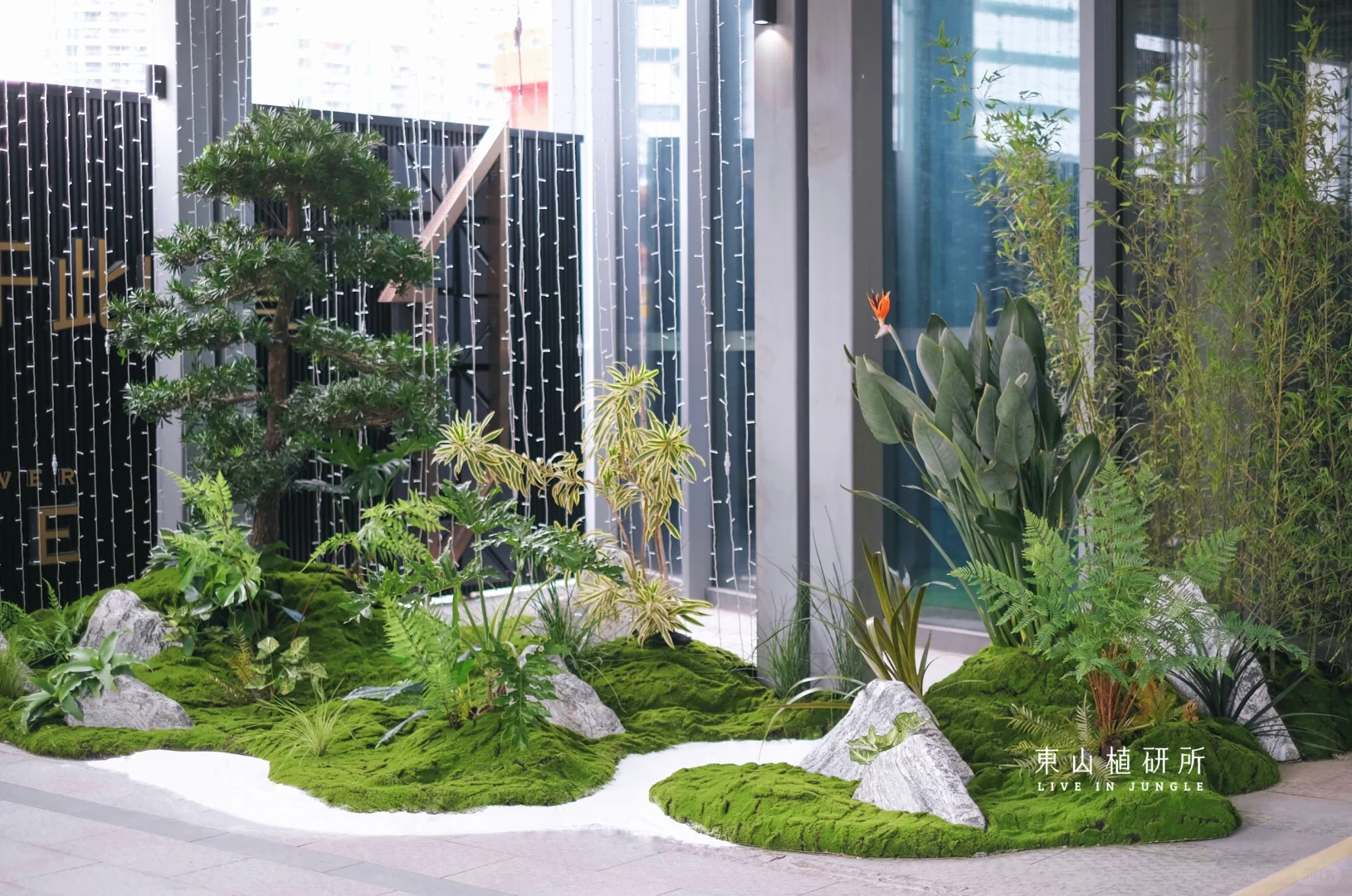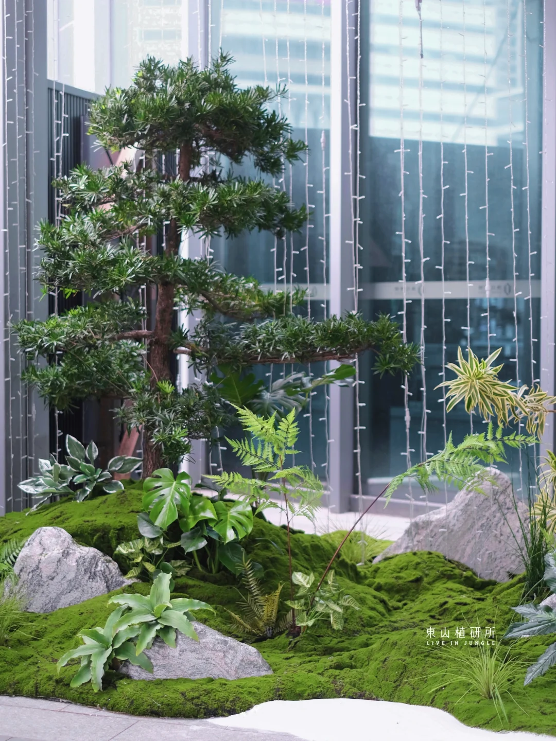 保留原有罗汉松 加入高低落差的仿真绿植搭配 保持整个空间的视觉平衡和吸引力