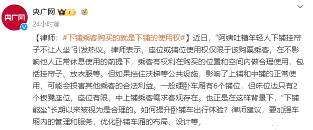 12306表示:没有明确规定不能使用,在不妨碍其他乘客的情况下可以使用。 央广网:不是谁发视频谁有理,谁买的票谁做主,拒绝道德评判。 律师:下铺乘客购买的就是下铺的使用权。