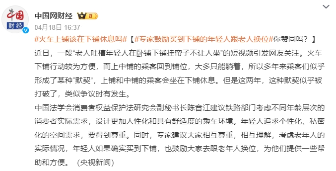 中国法学会消费者权益保护法研究会副秘书长陈音江建议:铁路部门优化乘车环境,年轻人如果确实买到下铺,也鼓励大家去跟老年人换位,为他们提供一些帮助和方便。