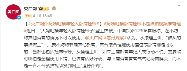 近日,一段“大妈吐槽年轻人在卧铺下铺挂帘子不让70岁老人坐”的短视频引发网友关注。