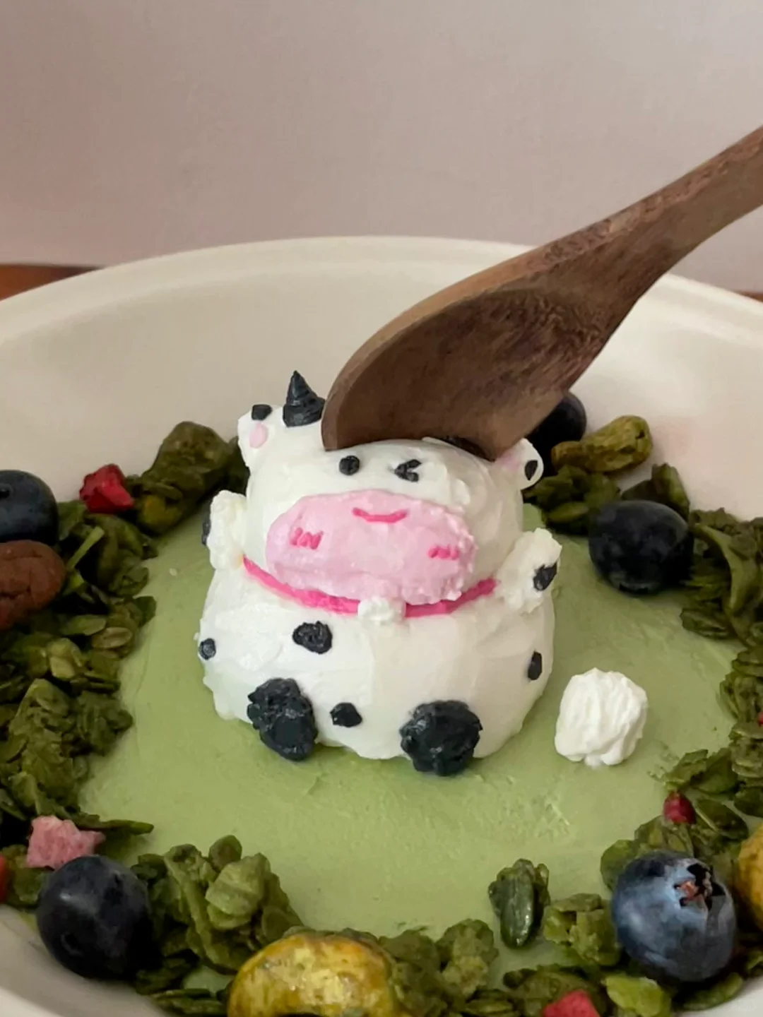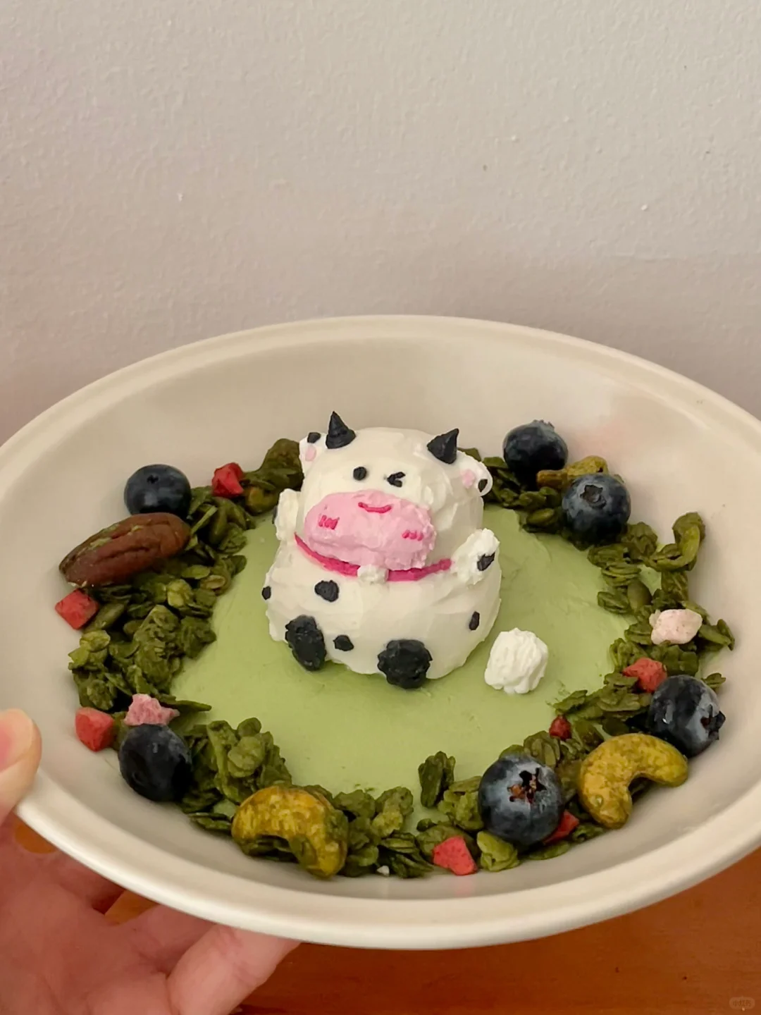 今天我吃上了敲🔥的干噎希腊酸奶碗 奶香浓郁 醇厚绵密的希腊酸奶搭配一些喜欢的麦片和水果 一碗健康低卡 饱fu感满满的减脂希腊酸奶碗这不就有了吗 我还用干噎酸奶捏了一只小牛 捏完后有点被可爱到! - 1️⃣酸奶提前一晚上过滤好(我选择的希腊式酸奶本身质地就很醇厚,乳清少所以一晚上就能过滤的很好) 2️⃣过滤好的酸奶分成两部分,一部分加抹茶粉拿来打底,另一部分拿来做成小牛 3️⃣做好后周围摆上燕麦和水果就可以啦