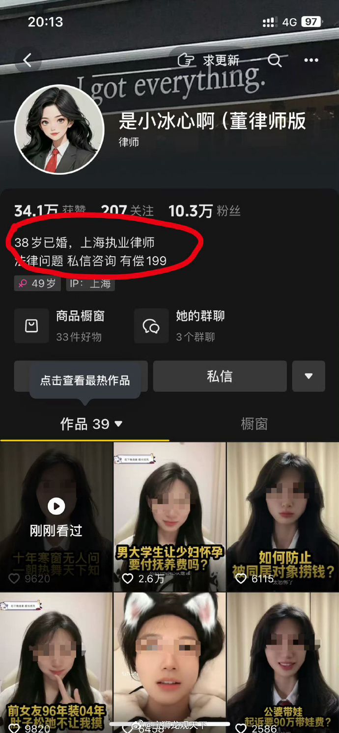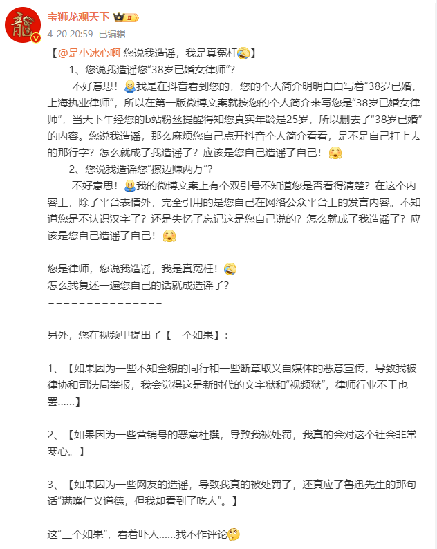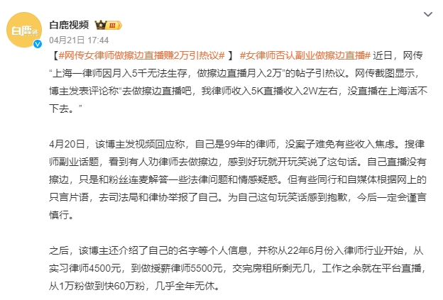 近日,一位上海女律师控诉自媒体断章取义恶意宣传她做擦边直播,导致我被律协和司法局举报”“这是新时代的文字狱和视频狱”。并声称,自己是99年出生的,才25岁,并非网传造谣的38岁已婚。 随后,该名博主晒出了一系列证据,并表示:38岁已婚是她某平台主页的签名;做擦边直播月入两万是她本人发的内容,无任何杜撰、抹黑的内容。