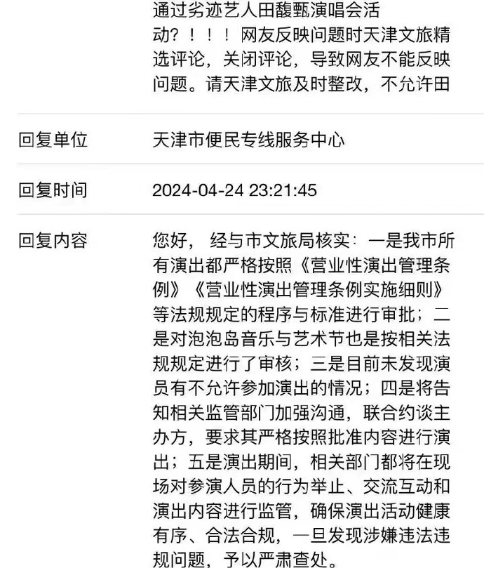 今年五一,天津音乐节宣布知名歌手田馥甄将作为压轴嘉宾出席。该消息一出,立即引起了大量网友的不满,认为天津邀请劣迹艺人是对音乐节品质的一种贬低,部分热心网友还通过天津便民服务中心进行举报。