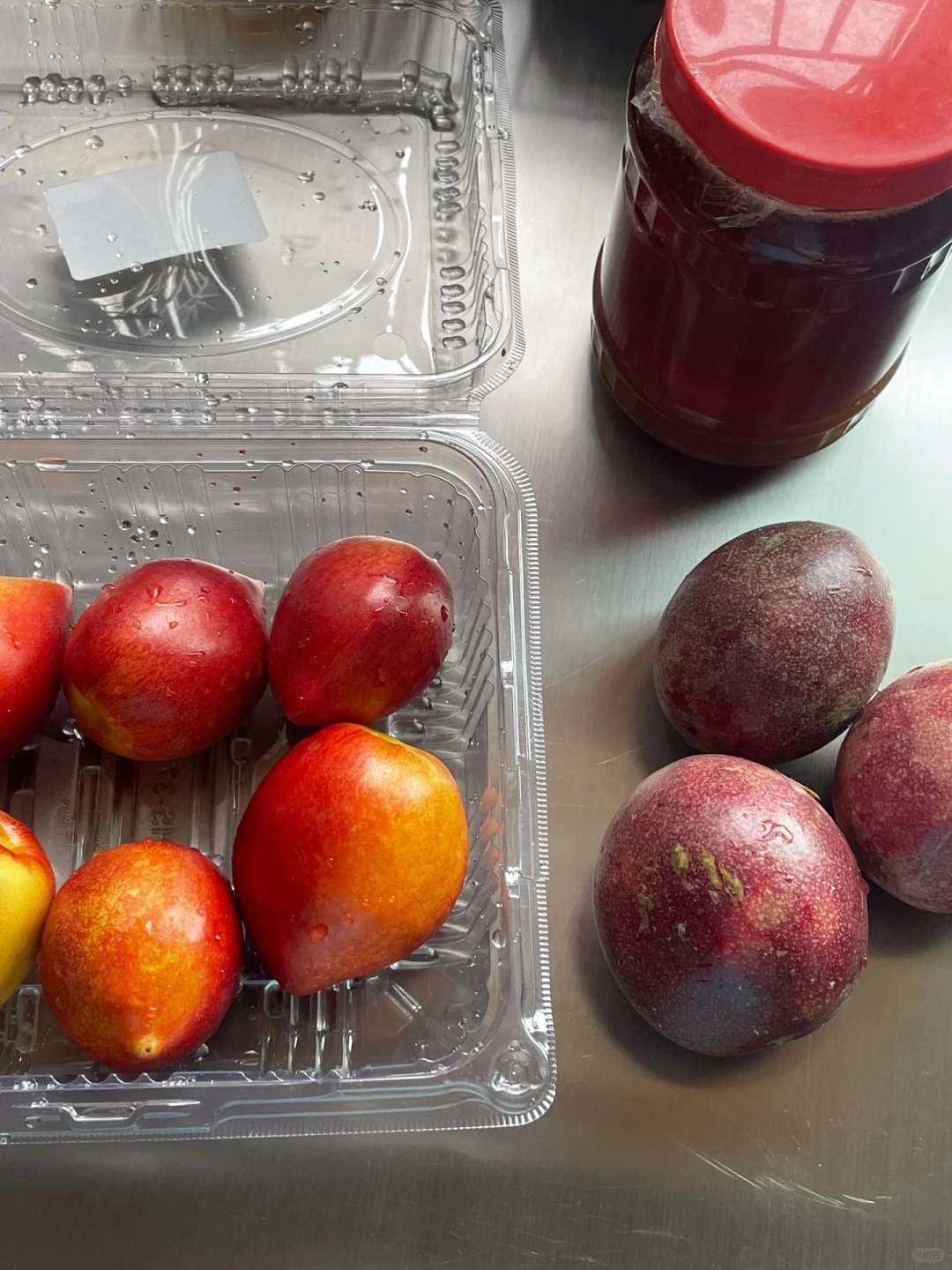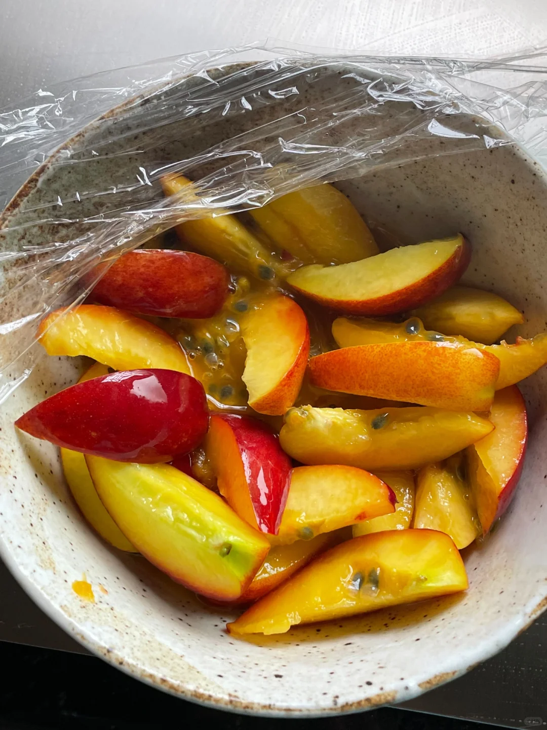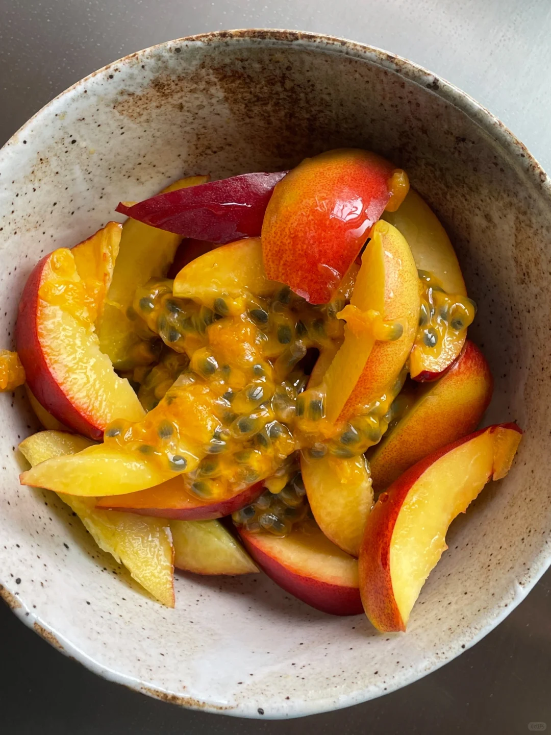 突然理解网友说的好吃到无语的桃子新吃法 刷到分享的桃子渍百香果的食谱 桃子和百香果 是1+1大于2的效果 做法很简单 其实就是把桃子和百香果混合到一起 加些蜂蜜送入冰箱冷藏腌制 zui好能隔夜 这样百香果味到才能腌到桃子里 要是把油桃换成水蜜桃 我不敢想象我有多快乐!