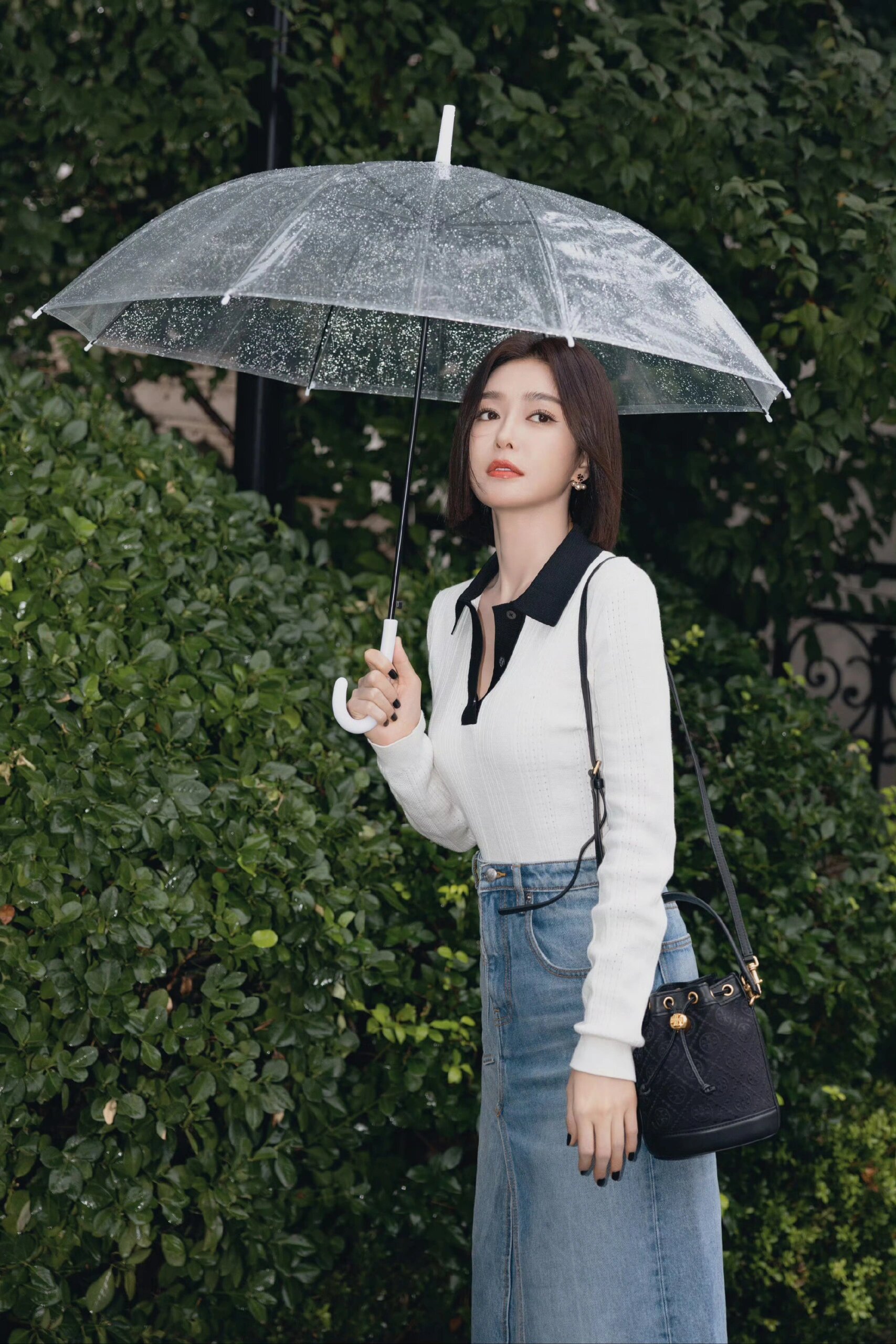 白色翻领休闲上衣搭配牛仔半裙,五官精致,颜值在线,雨中撑伞,氛围感拉满!