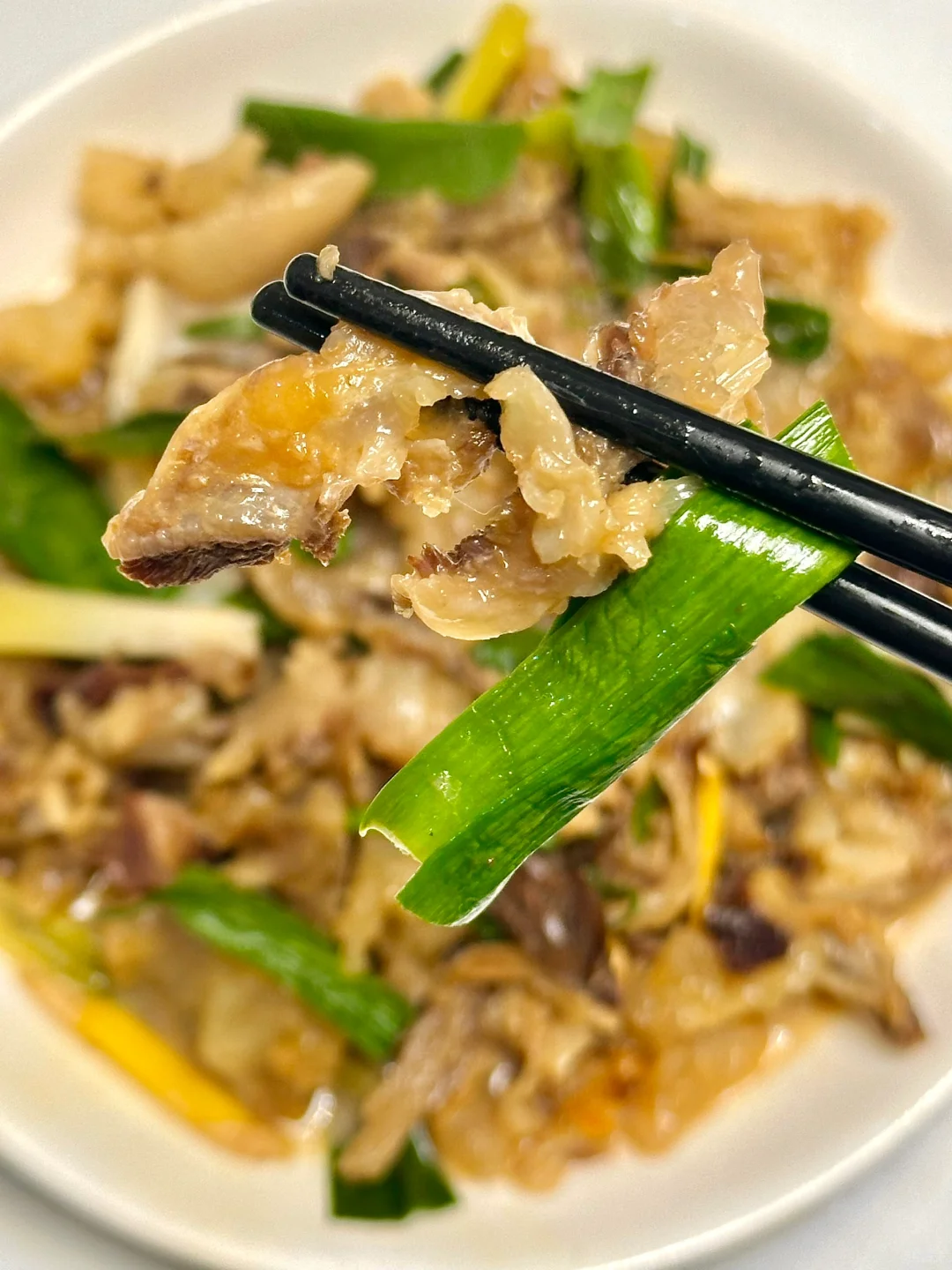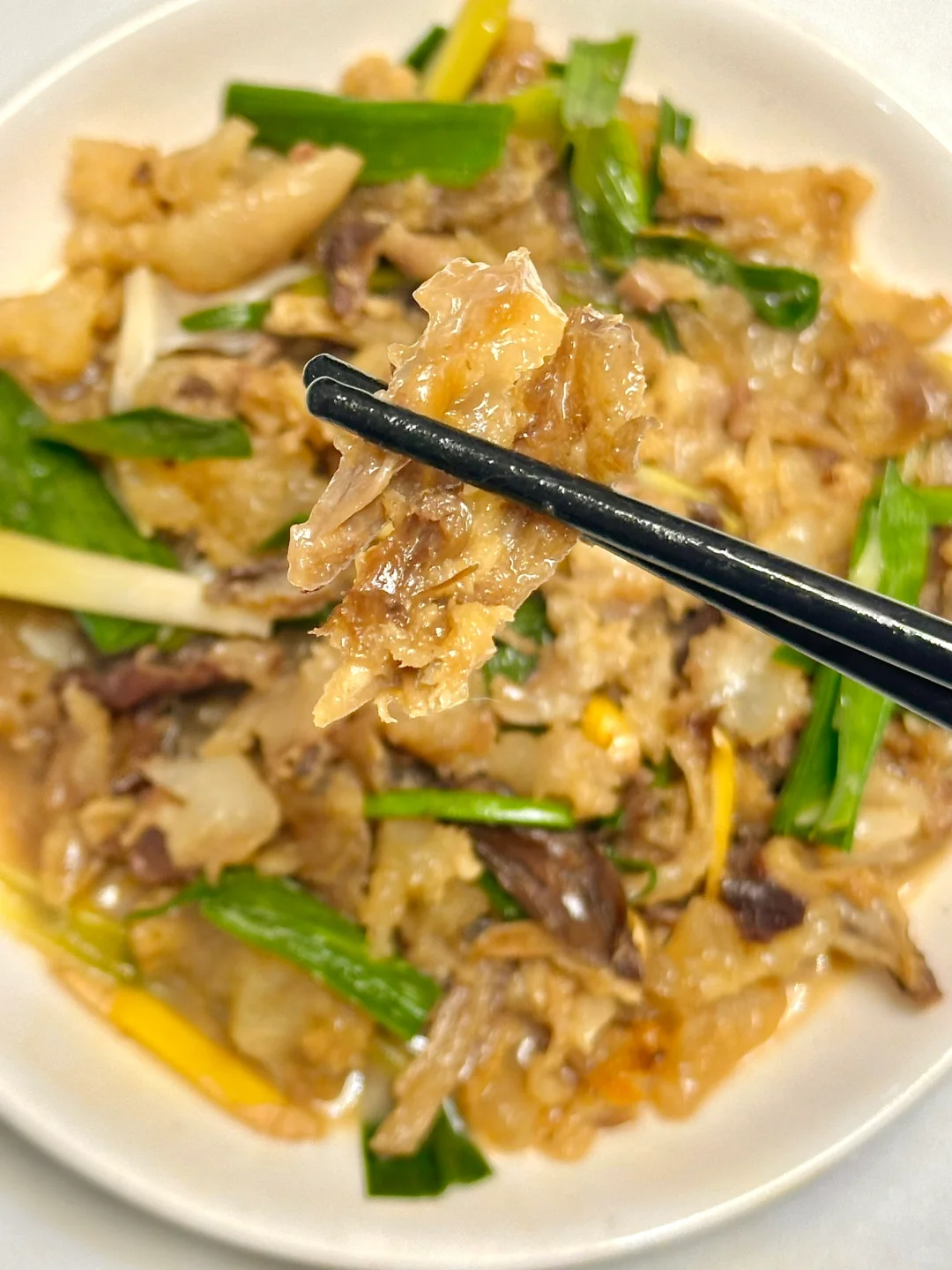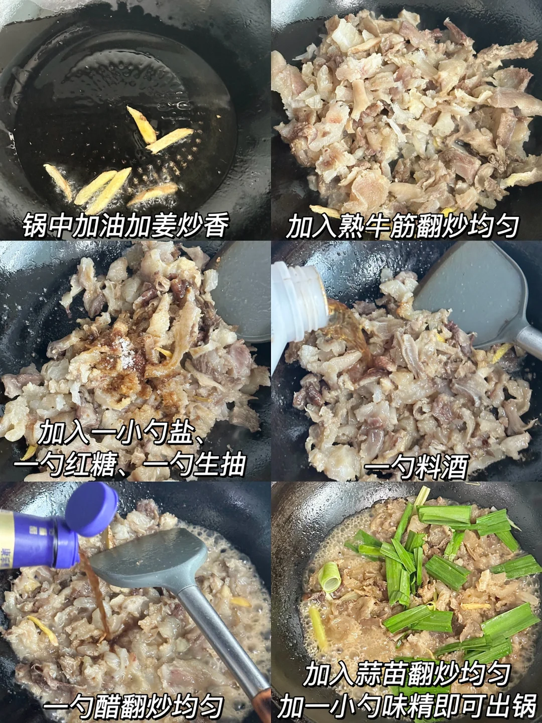 前两天回娘家吃饭吃到了我妈的新菜品!!一大盘一下子就干光了!马上get回家自己炒☺️ ㅤ 🌟准备食材🌟 熟牛筋 姜 蒜苗 🌟做法🌟 1️⃣锅中加油加姜炒香,加入熟牛筋翻炒均匀 2️⃣加入一小勺盐、一勺红糖、一勺生抽、一勺料酒、一勺醋翻炒均匀 3️⃣加入蒜苗翻炒均匀,加一小勺味精即可出锅