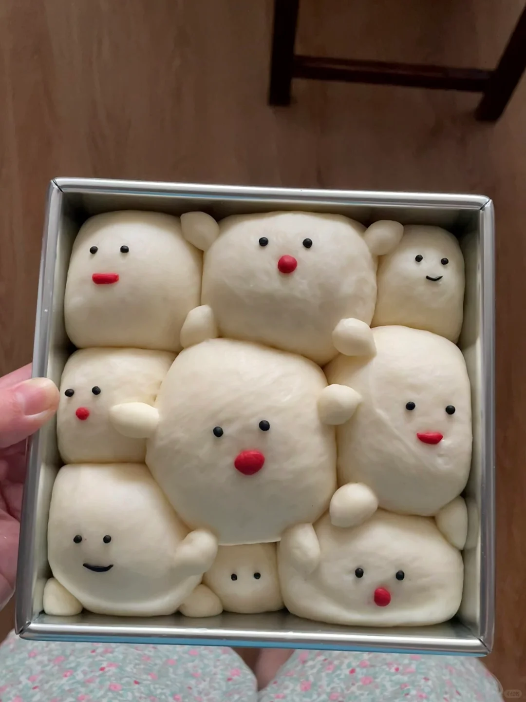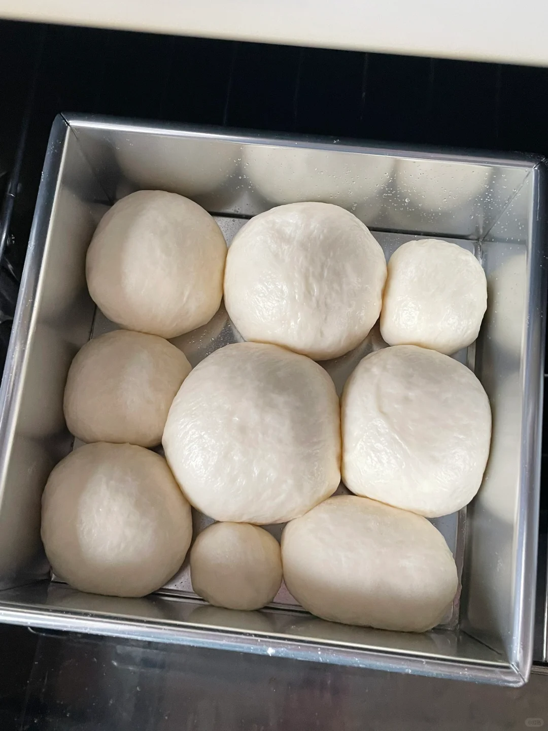 4️⃣发酵好的面团按压排气,按照你想要的大小分成小面团(我用的方形模具8寸,大的45g、小的35g、25g左右,多出来的面团我装在其他模具里)