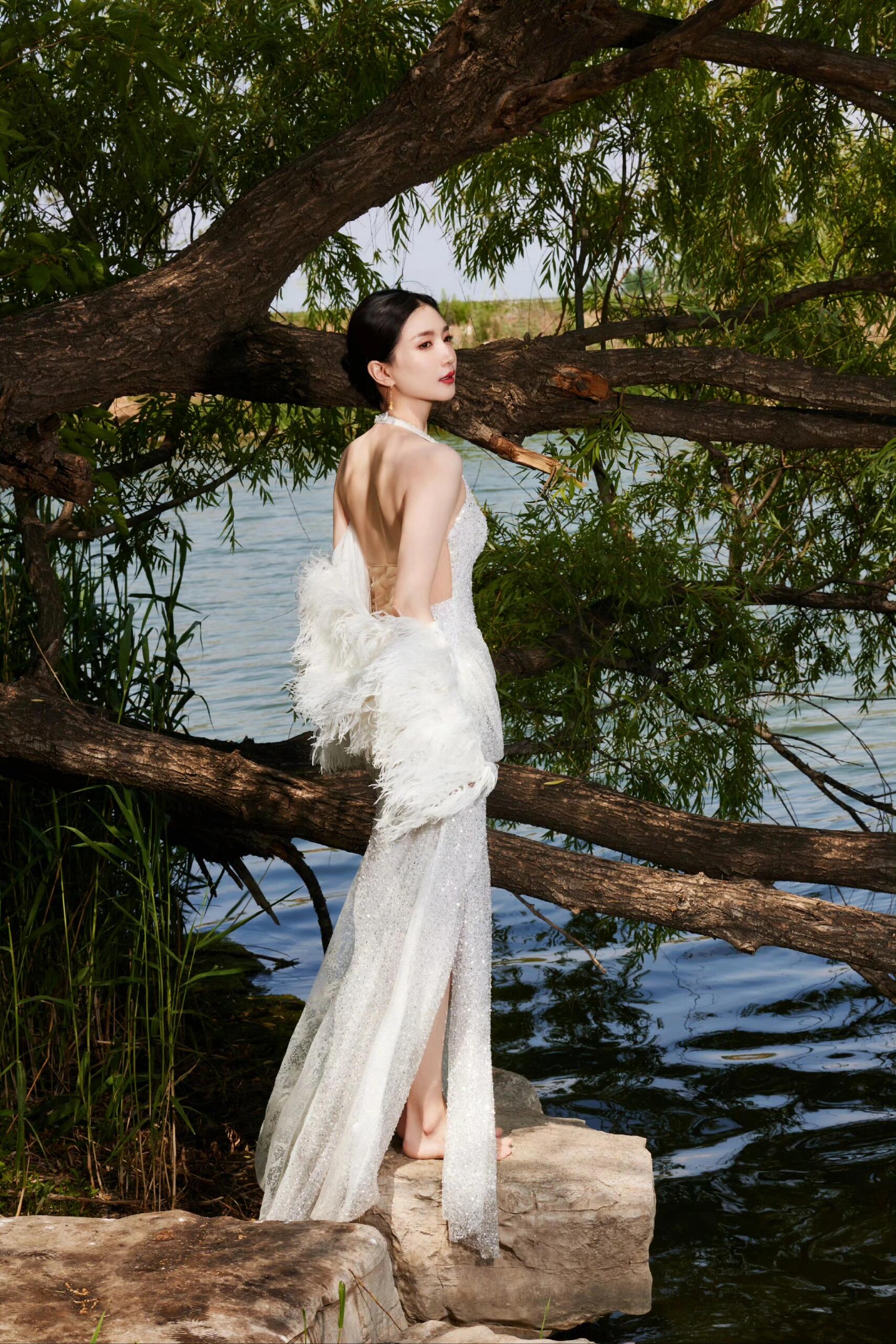 白羽毛裙绝美,修长美腿迷人吸睛,红唇热烈妩媚,气质优雅冷冽。
