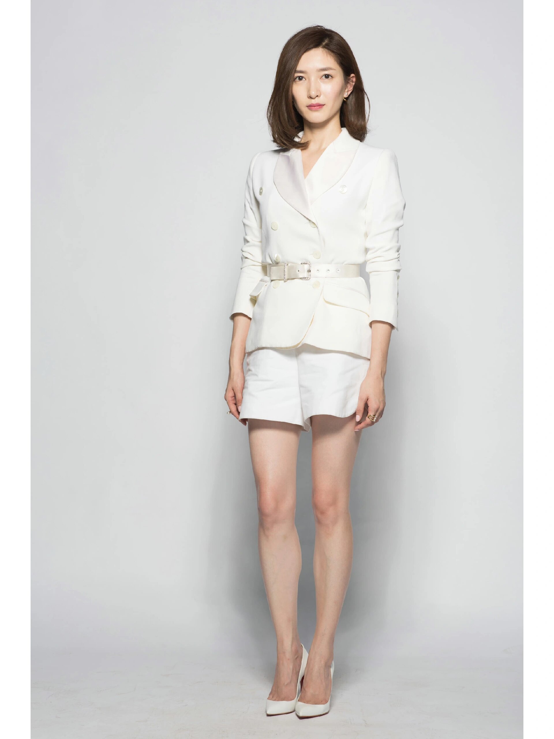 江疏影白色小西装和短裤搭配白色高跟鞋,整体非常简洁清爽的造型,而且束腰腰带,很好的凸显了江疏影的身材