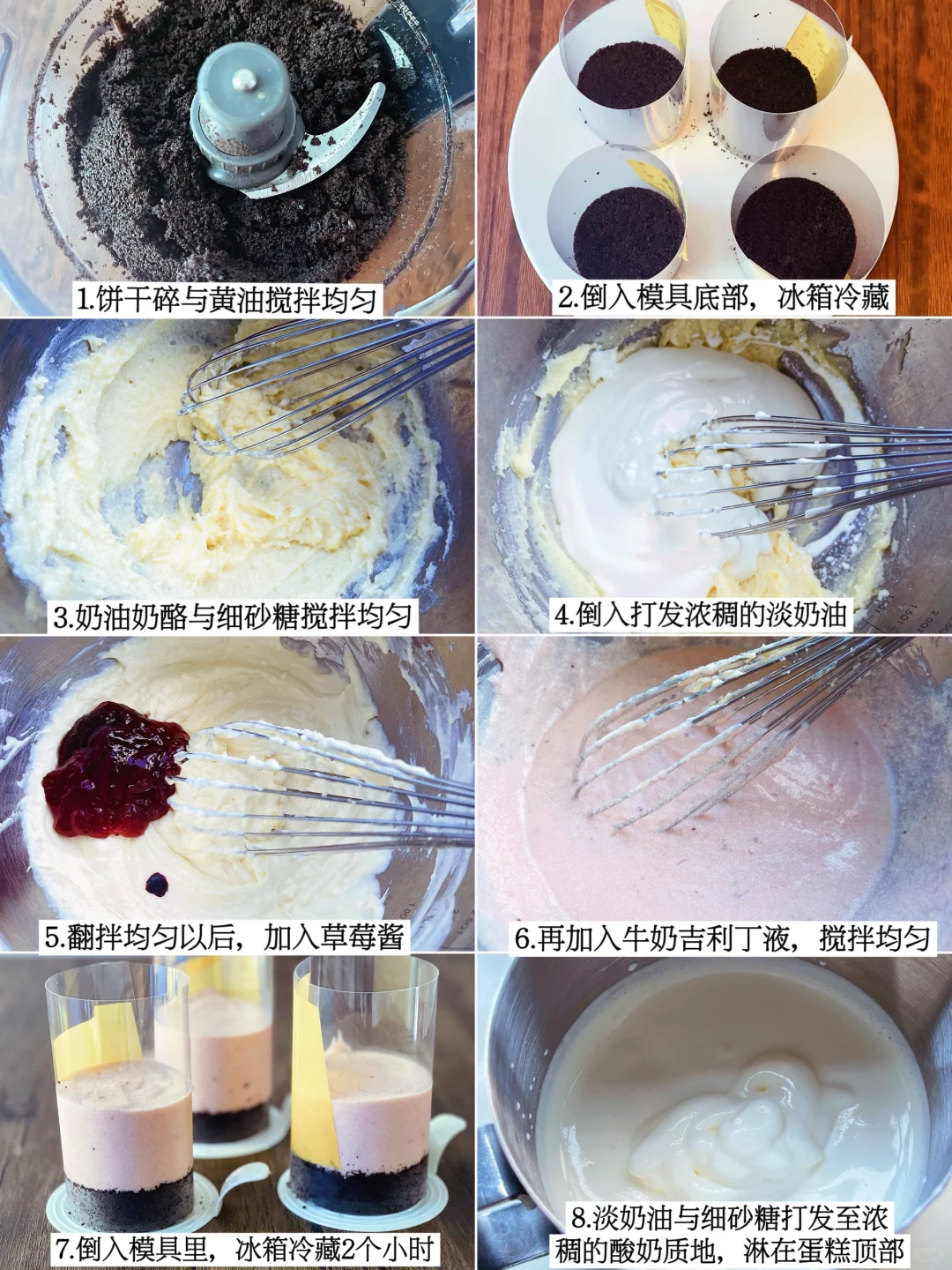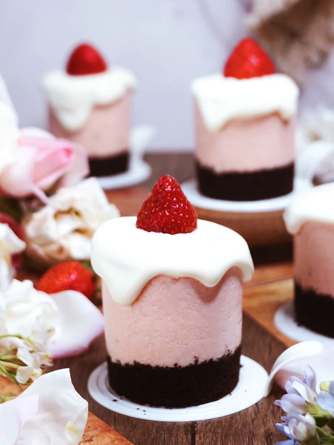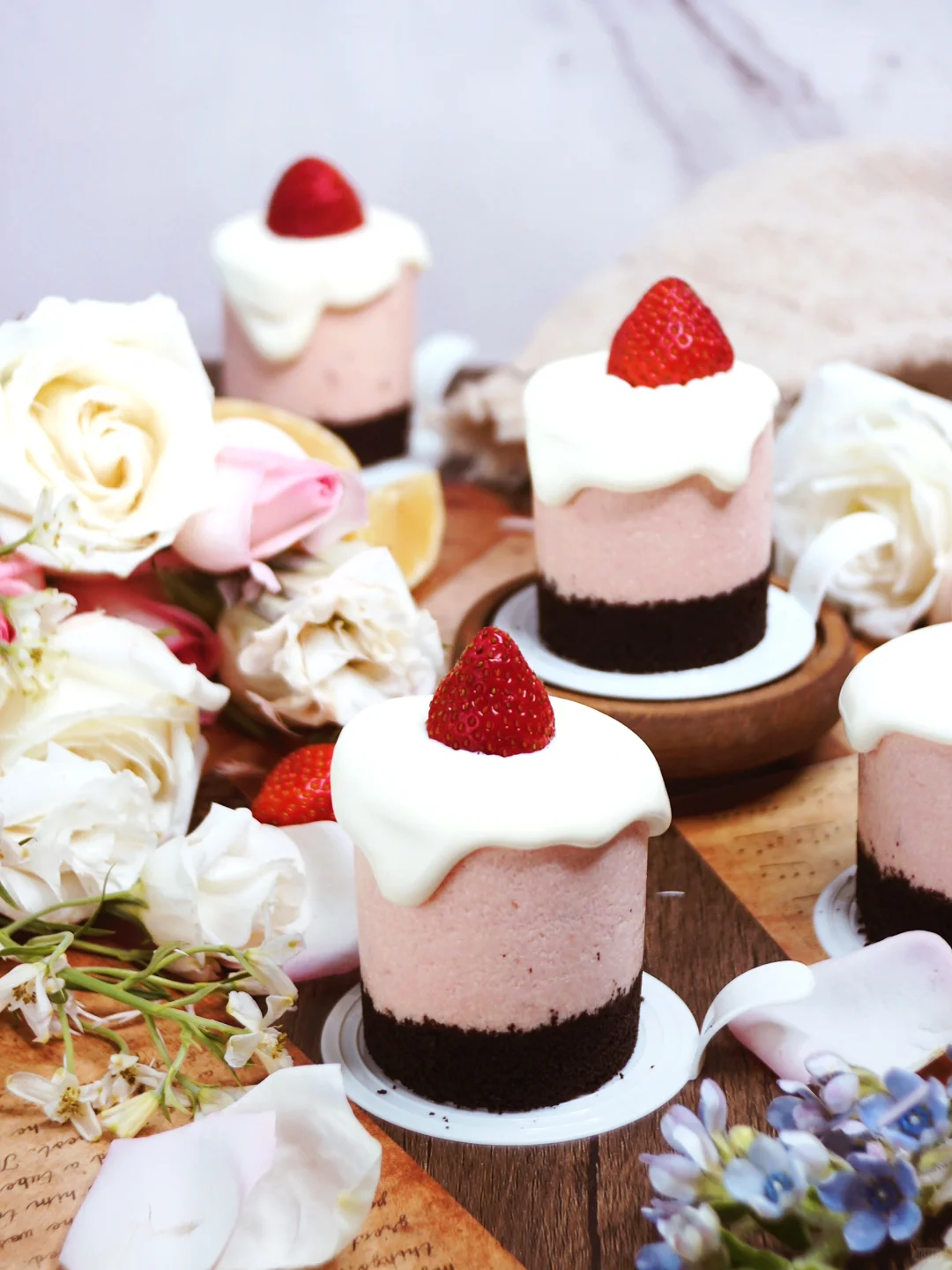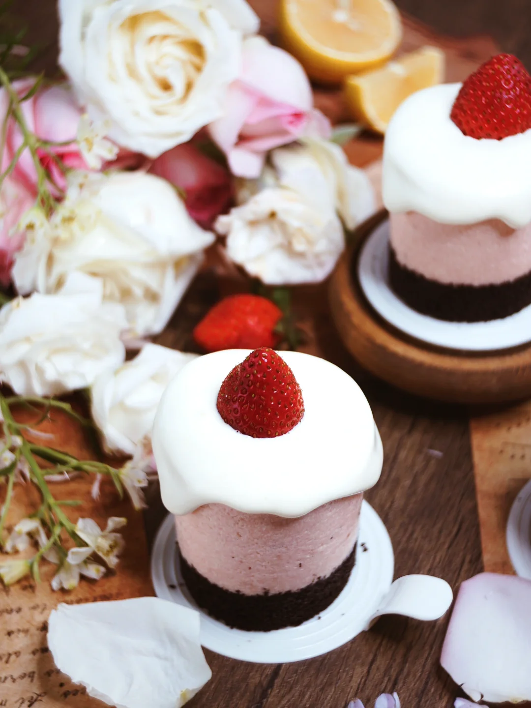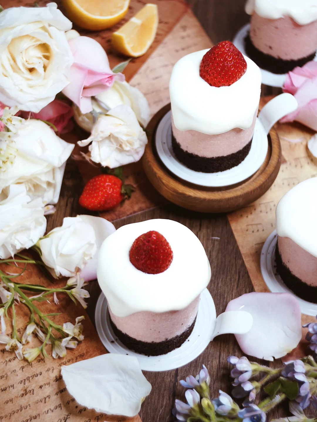 浪漫生活的记录者 有美丽的花花🌸自然少不了香甜可口的下午茶 一口一个的草莓🍓慕斯蛋糕,粉粉嫩嫩 再淋上雪顶奶盖,妥妥的高颜值甜品🍀 不需要烤箱,新手也可以做 · 👩🏻‍🍳【所需食材:】 饼干碎100g丨黄油50g 奶油奶酪200g丨淡奶油180ml丨草莓酱50g丨细砂糖40g丨牛奶50ml丨吉利丁片10g 奶盖:淡奶油60ml丨细砂糖5g · 👩🏻‍🍳【制作步骤:】 ❶黄油🧈隔热水融化,与饼干碎翻拌均匀。倒入模具底部压实,冰箱冷藏⏱️15分钟 ❷奶油奶酪🧀与细砂糖搅打顺滑,依次加入打发浓稠的淡奶油,草莓🍓酱,翻拌均匀。 ❸吉利丁片冷水泡软以后,加入温热的牛奶里🥛,搅拌融化。倒入草莓奶酪糊里,翻拌均匀 ❹分成4份,放入冰箱冷藏2个小时。撕掉围边 ❺60ml淡奶油与细砂糖打发至浓稠的酸奶质地,淋在慕斯蛋糕顶部,中间放一颗草莓 · ⚠️Tips: 喜欢粉嫩一些的,可以用红丝绒液调色。 用来支撑慕斯奶酪糊的必须是硬围边‼️