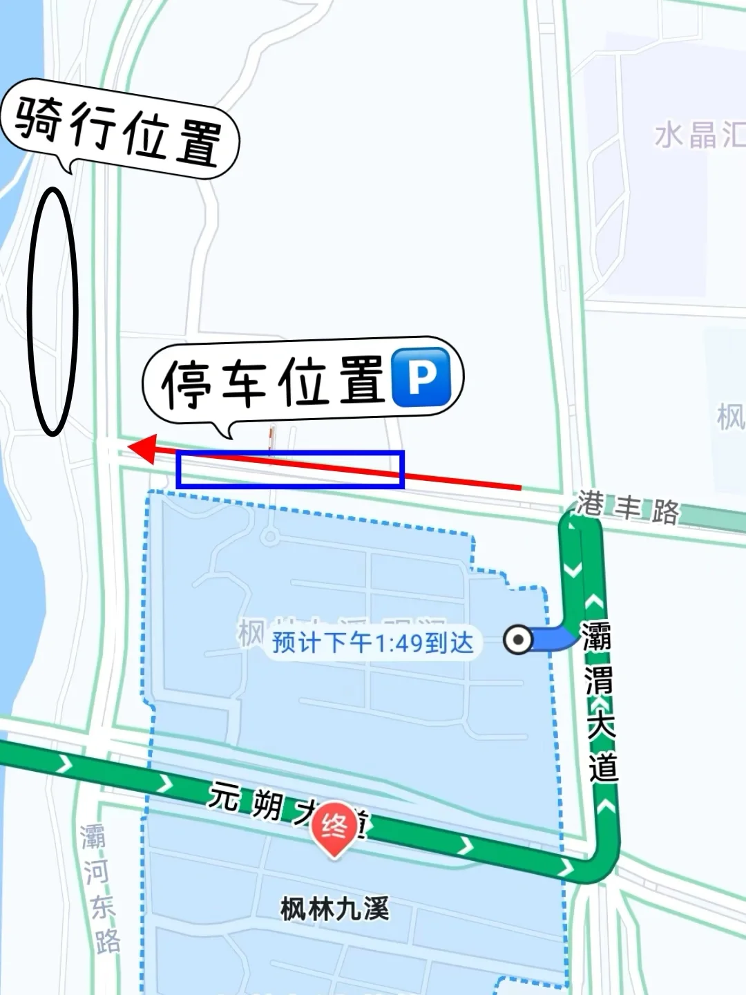 📍导航“枫林九溪”,马上到目的地时不要掉头左转开到头就可以在路边停车🅿️,带上自行车🚲往河边走就可以到达骑行步道!(参考图11)
