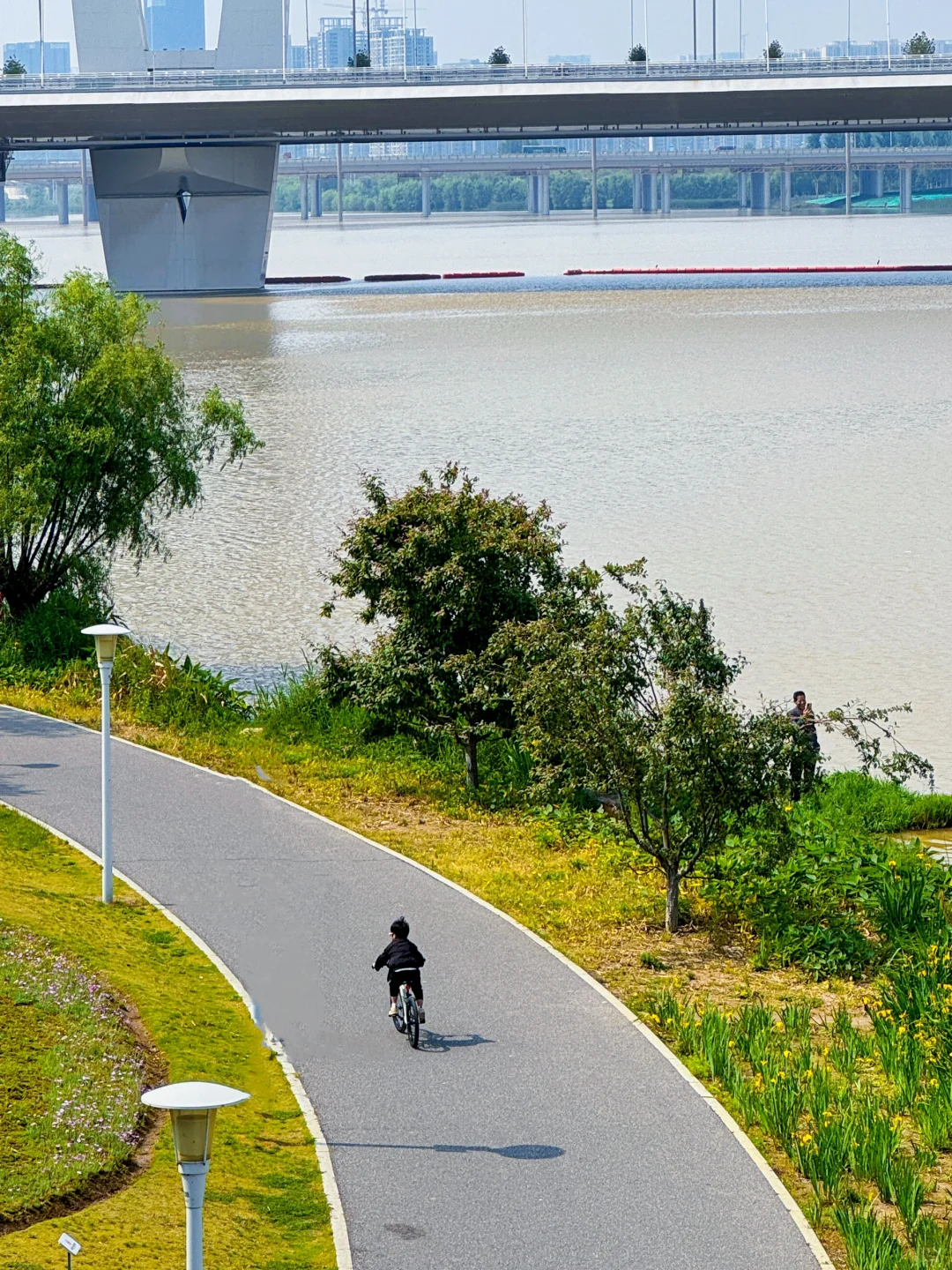 ✅晚上出行的话还可以看到奥体中心的灯光,白天骑行河边植被繁茂,有树荫,不用担心很晒!