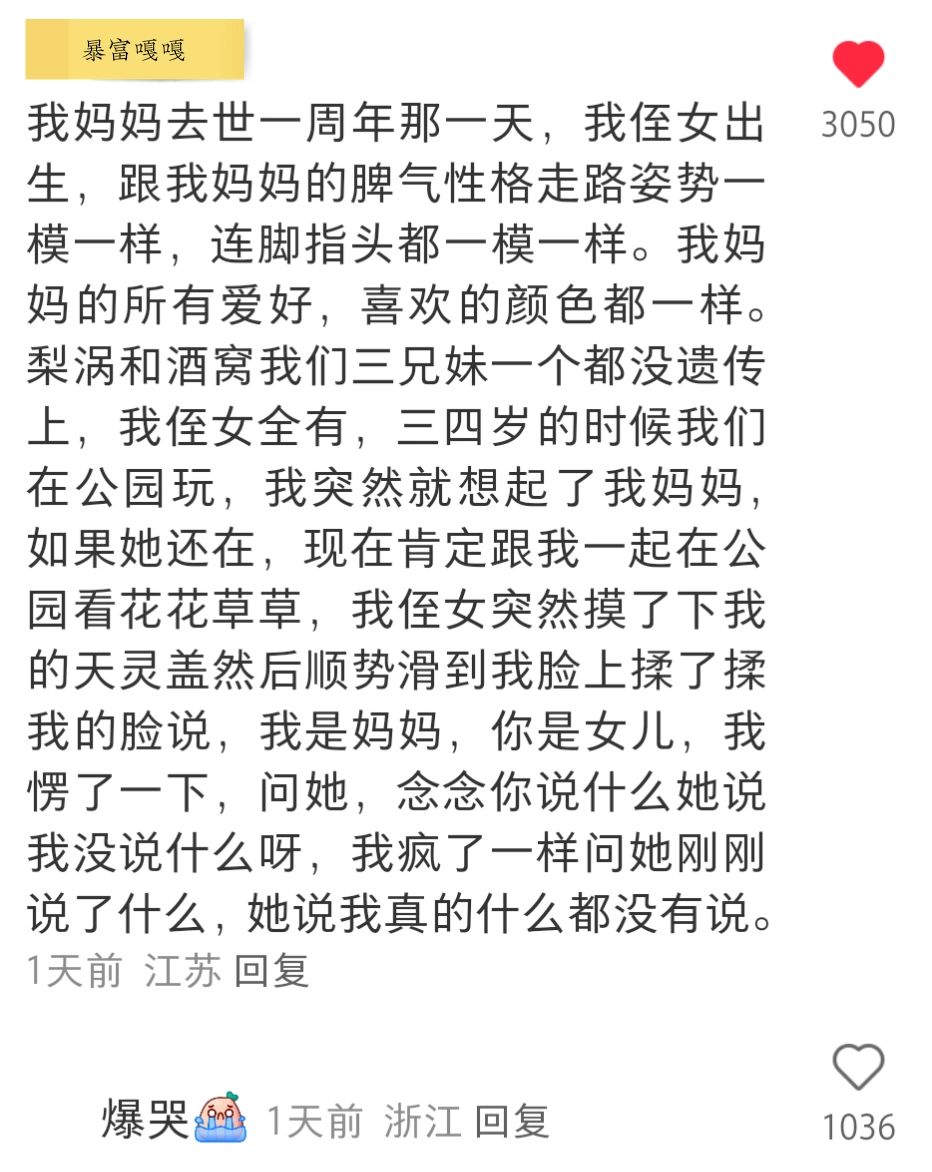 轮回转世,儿子花光所有的钱买了我 我儿子说他是在天上看到我,然后把他所有的钱买了我,一问所有钱是多少,他说3块。 大家相信有轮回转世吗?已故的亲人会回来以另一种方式陪伴着我们吗?