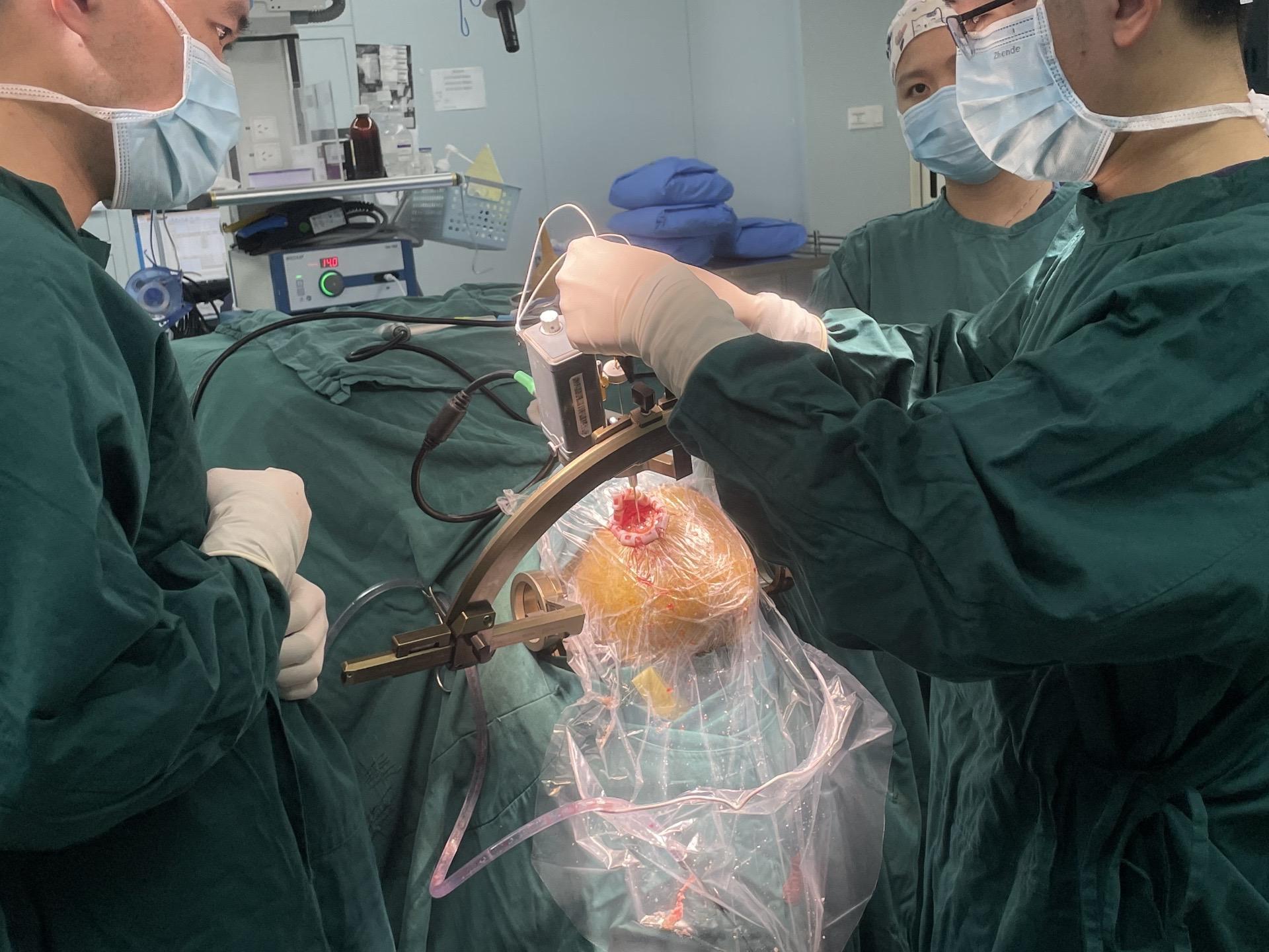 帕金森病-机器人辅助手术。帕金森病由于需要精准植入,常采用立体定向框架或者机器人来精准制导,且手术需要人员较多!