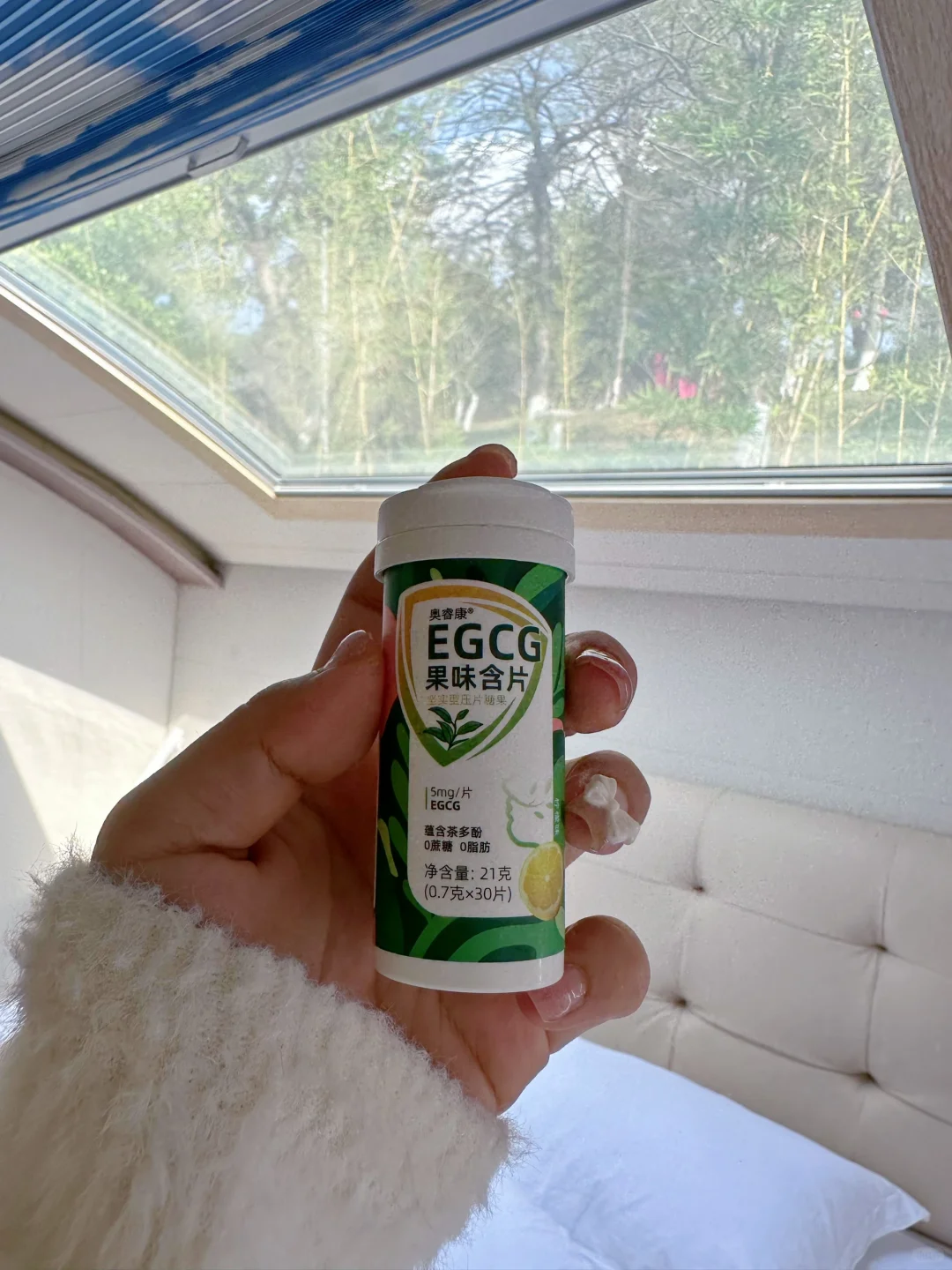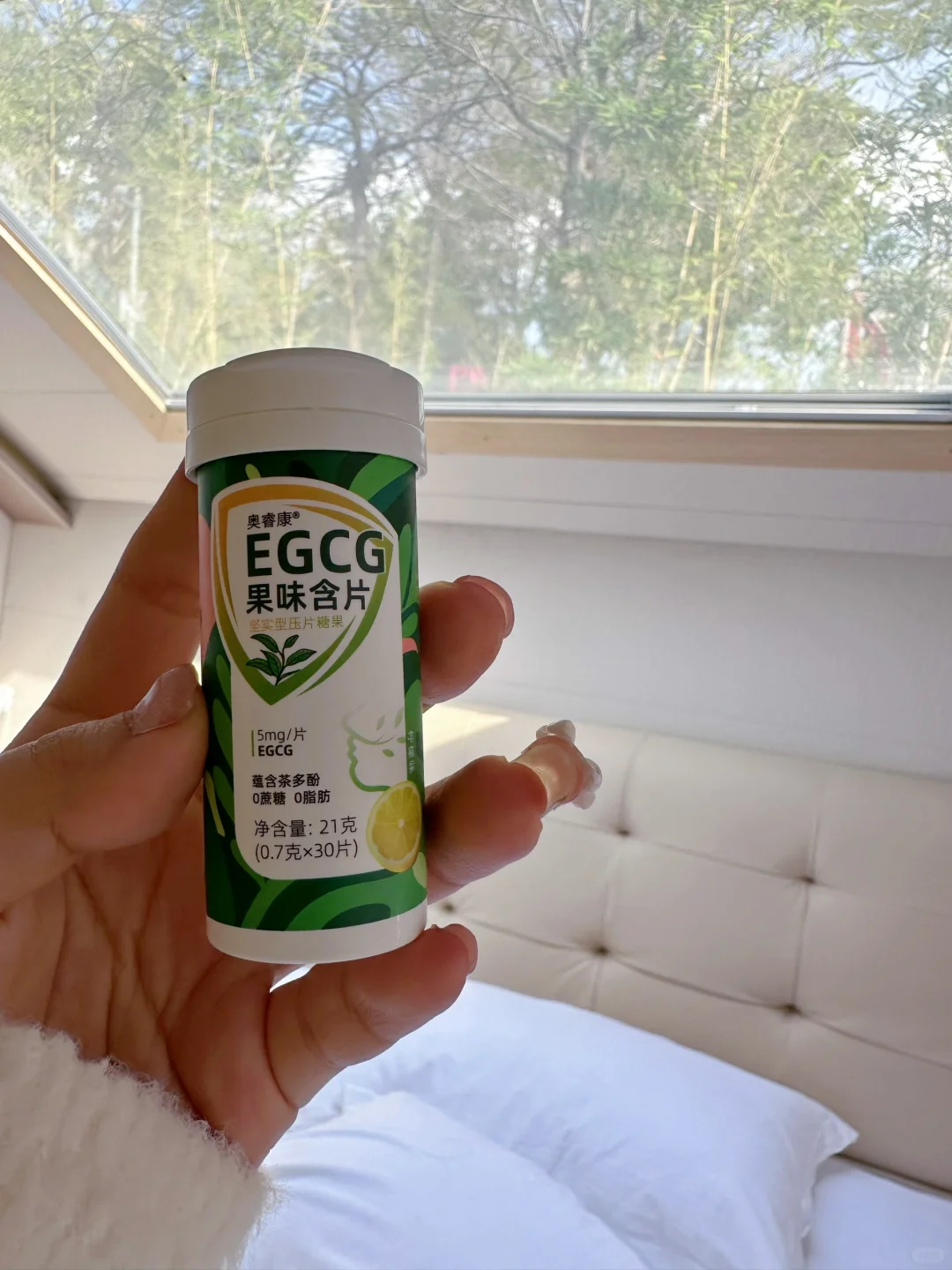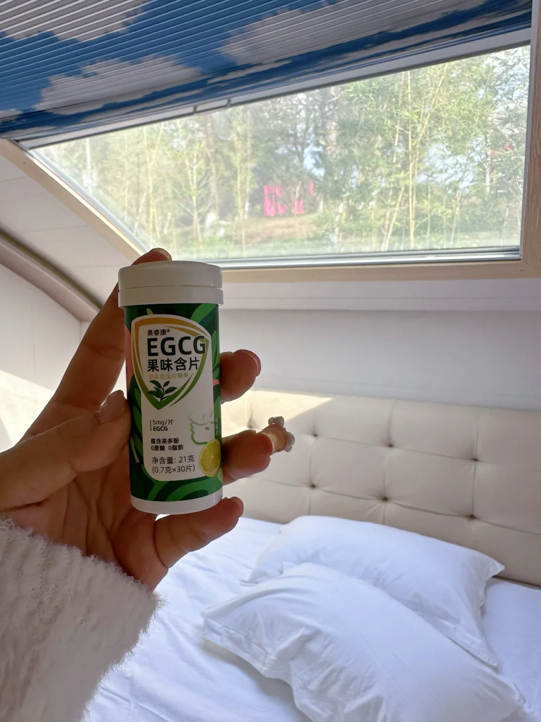 谁懂啊!我现在出门都必须带着这个奥睿康EGCG口含片了!!这次去房车露营时候真的少不了ta!由于户外比较少吃蔬菜水果,嘴巴难免有点味道,而这含片里面采用了天然茶多酚,含完后口气清新了不少!