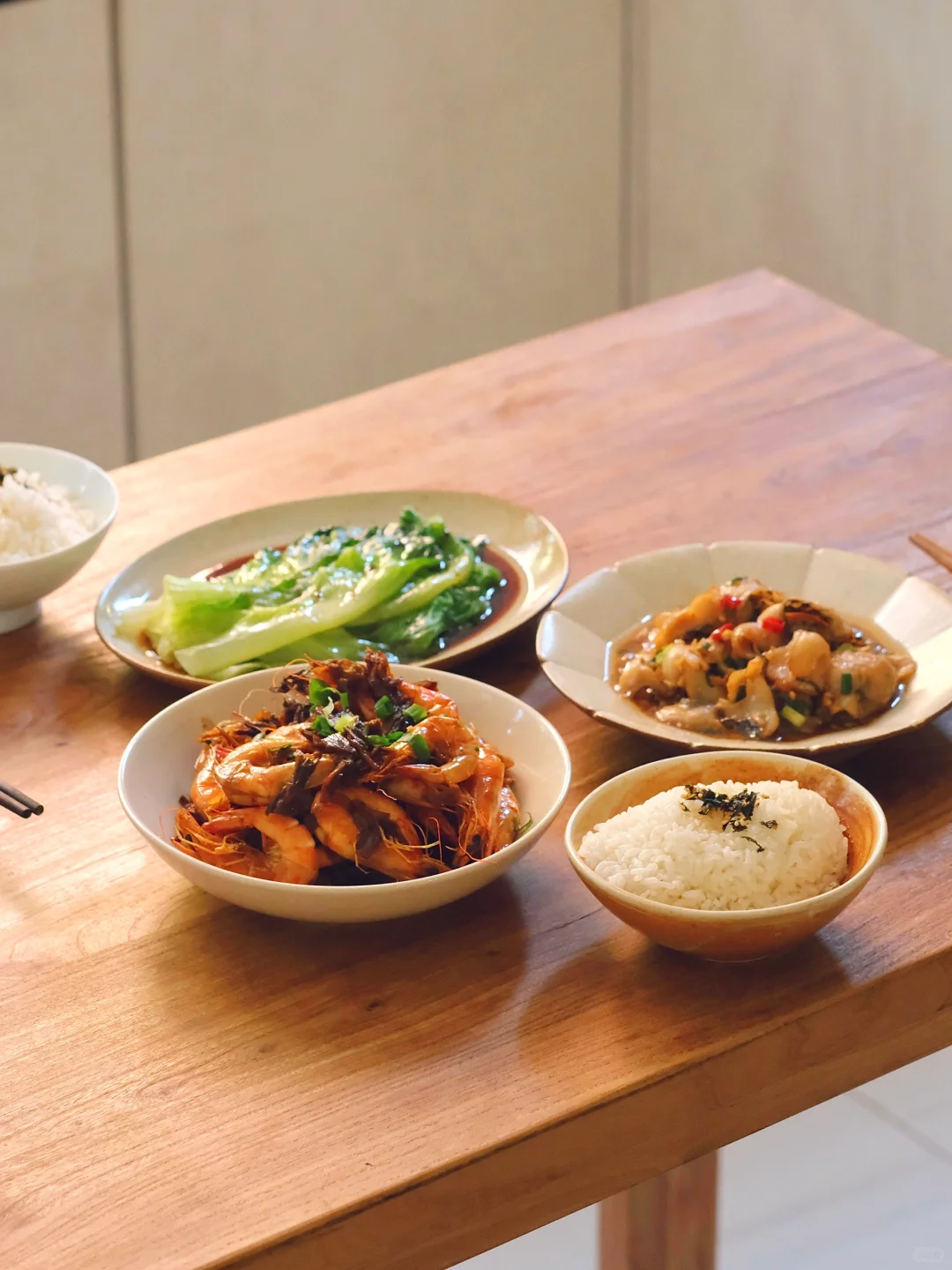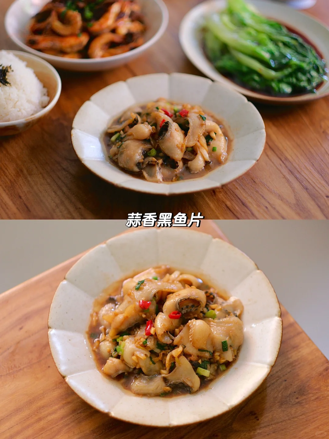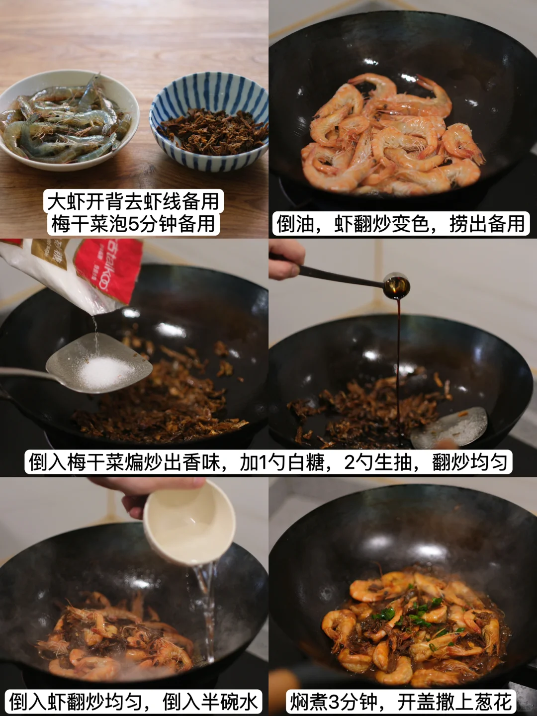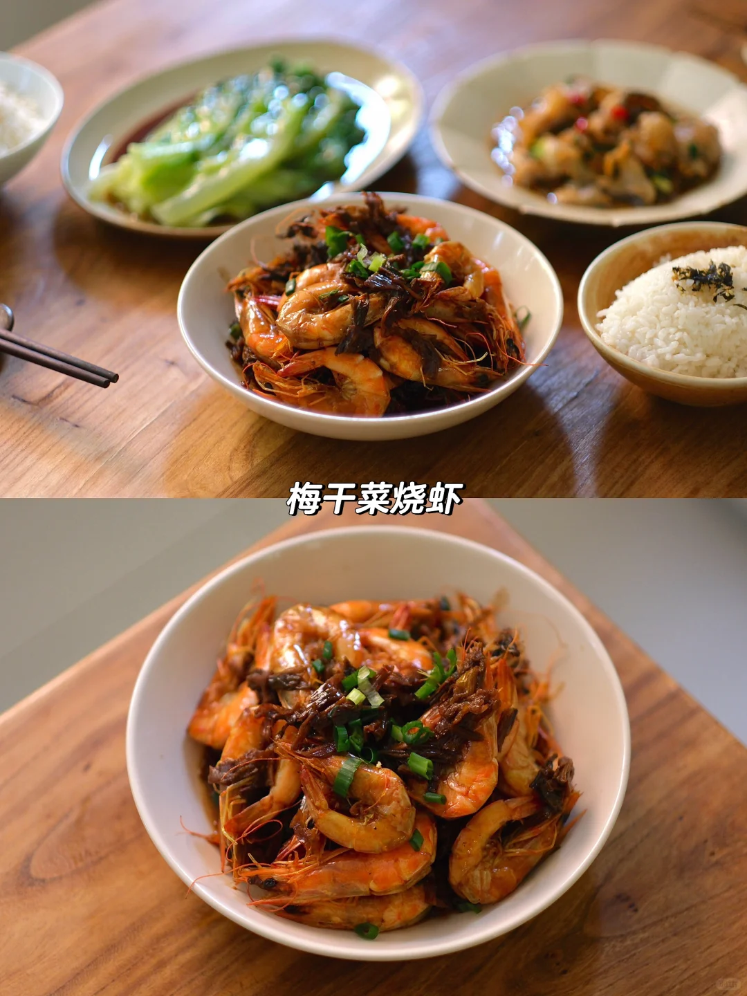 今日菜单: 1.梅干菜烧虾 2.豉油生菜 3.蒜香黑鱼片
