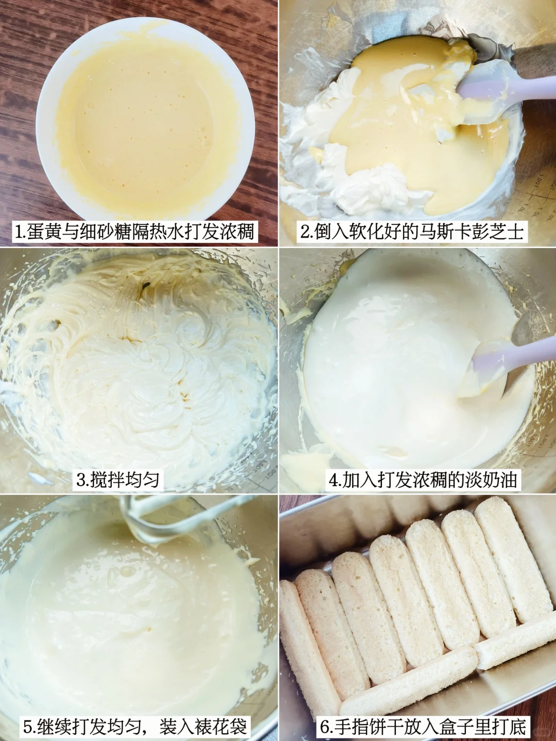 ❶蛋黄🥚与30g细砂糖隔热水打发至颜色变白,浓稠有纹路的状态,与软化好的马斯卡彭芝士🧀搅打均匀