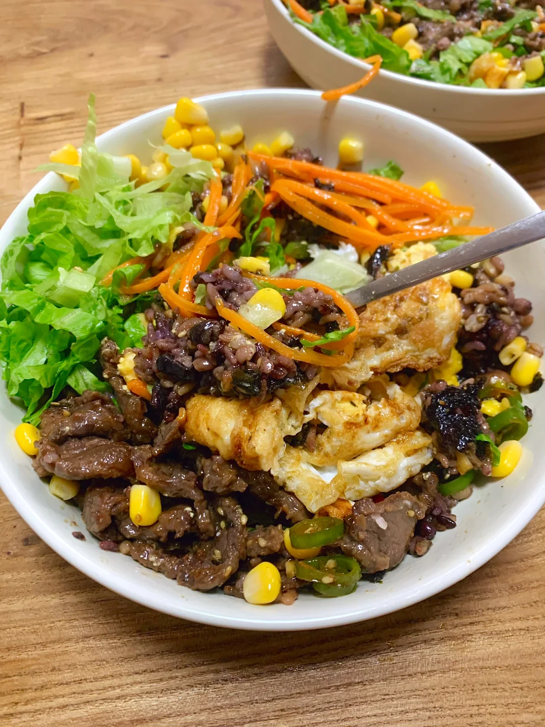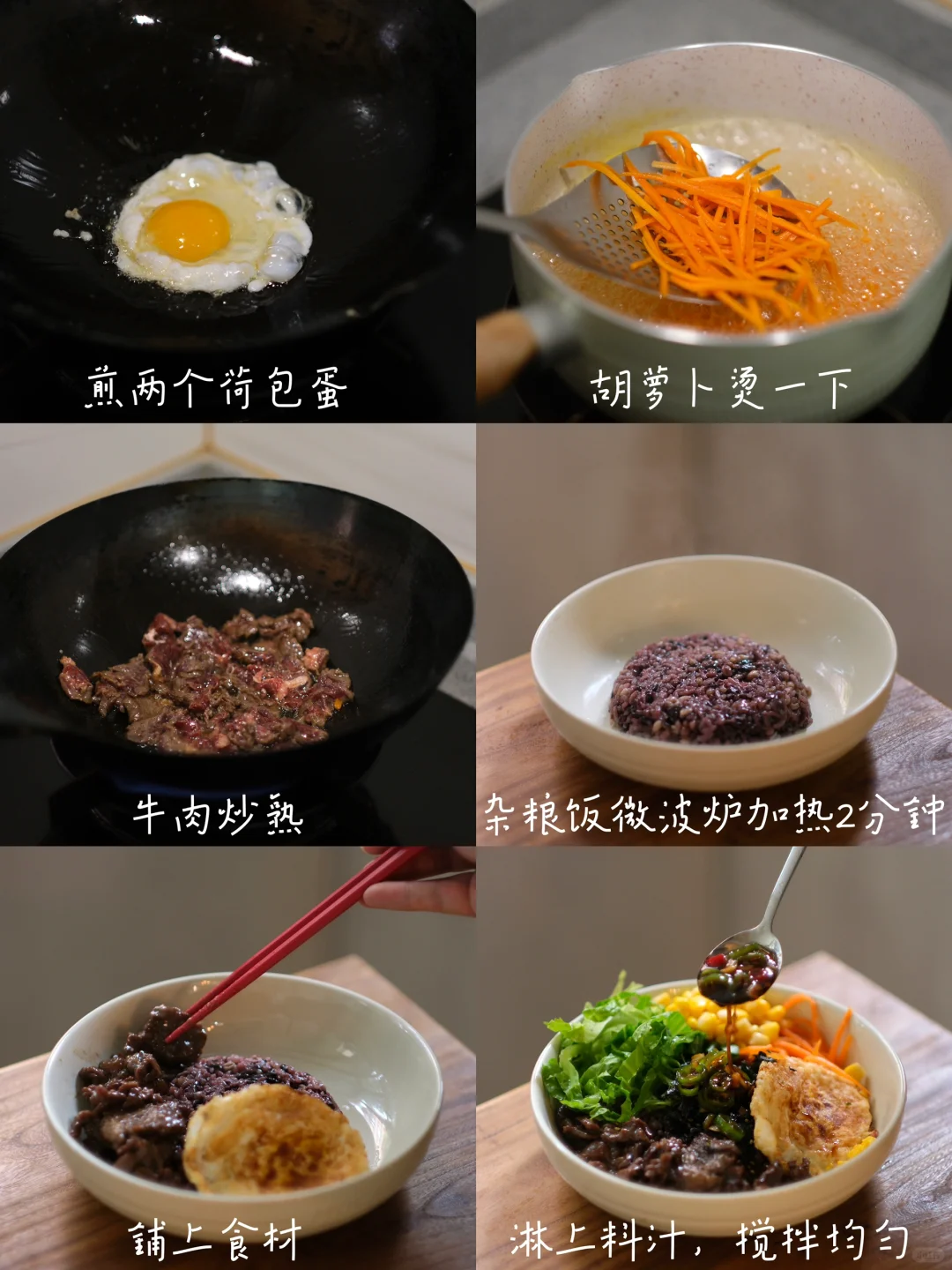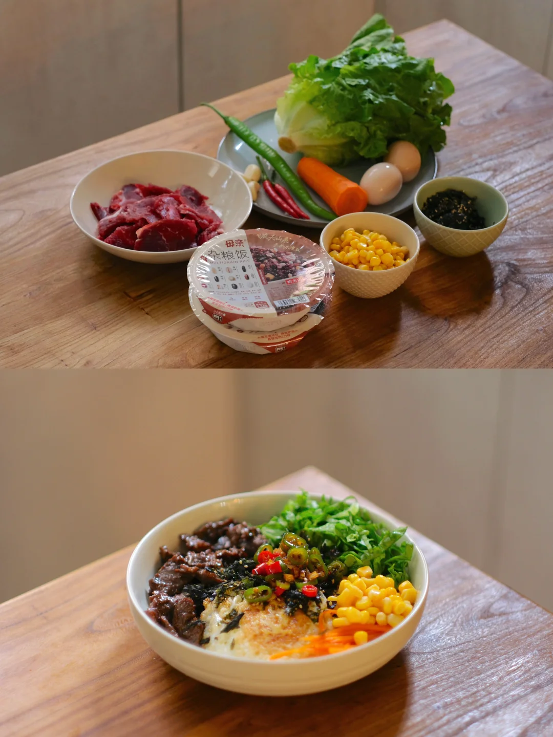 今日菜单:生菜牛肉拌饭 食材: 母亲杂粮饭、牛肉、生菜、鸡蛋、胡萝卜、玉米粒 步骤: 1⃣️牛肉腌制:牛肉切薄片,加入黄酒、生抽、蚝油生粉各1勺,抓拌均匀腌制15分钟。 2⃣️调配料汁:蒜末、小米辣、线椒,淋上热油,加入3勺生抽、1勺蚝油、半勺白糖,搅拌均匀。 3⃣️煎两个荷包蛋、牛肉煎熟、萝卜丝焯水、杂粮饭烹煮太复杂,我们直接用母亲杂粮饭,一盒有12种谷物豆类在里面!微波炉加热2分钟,铺上食材,淋上料汁,搅拌均匀即可食用。