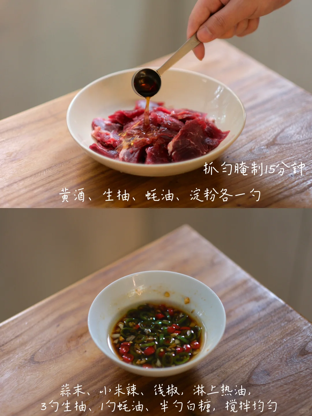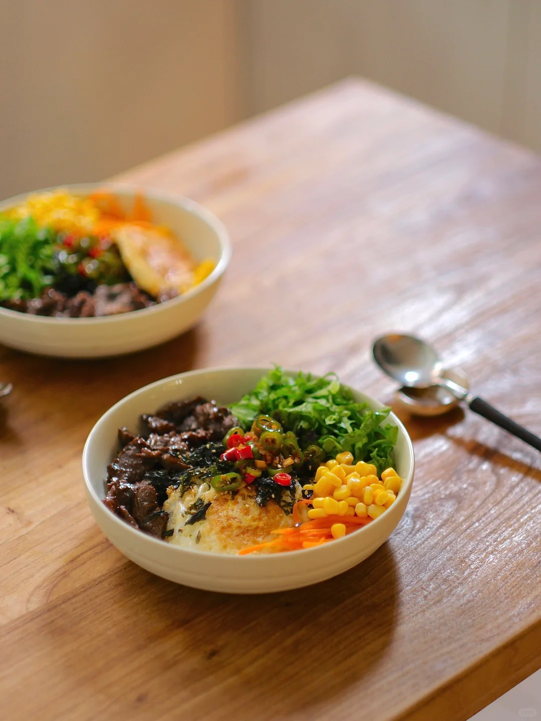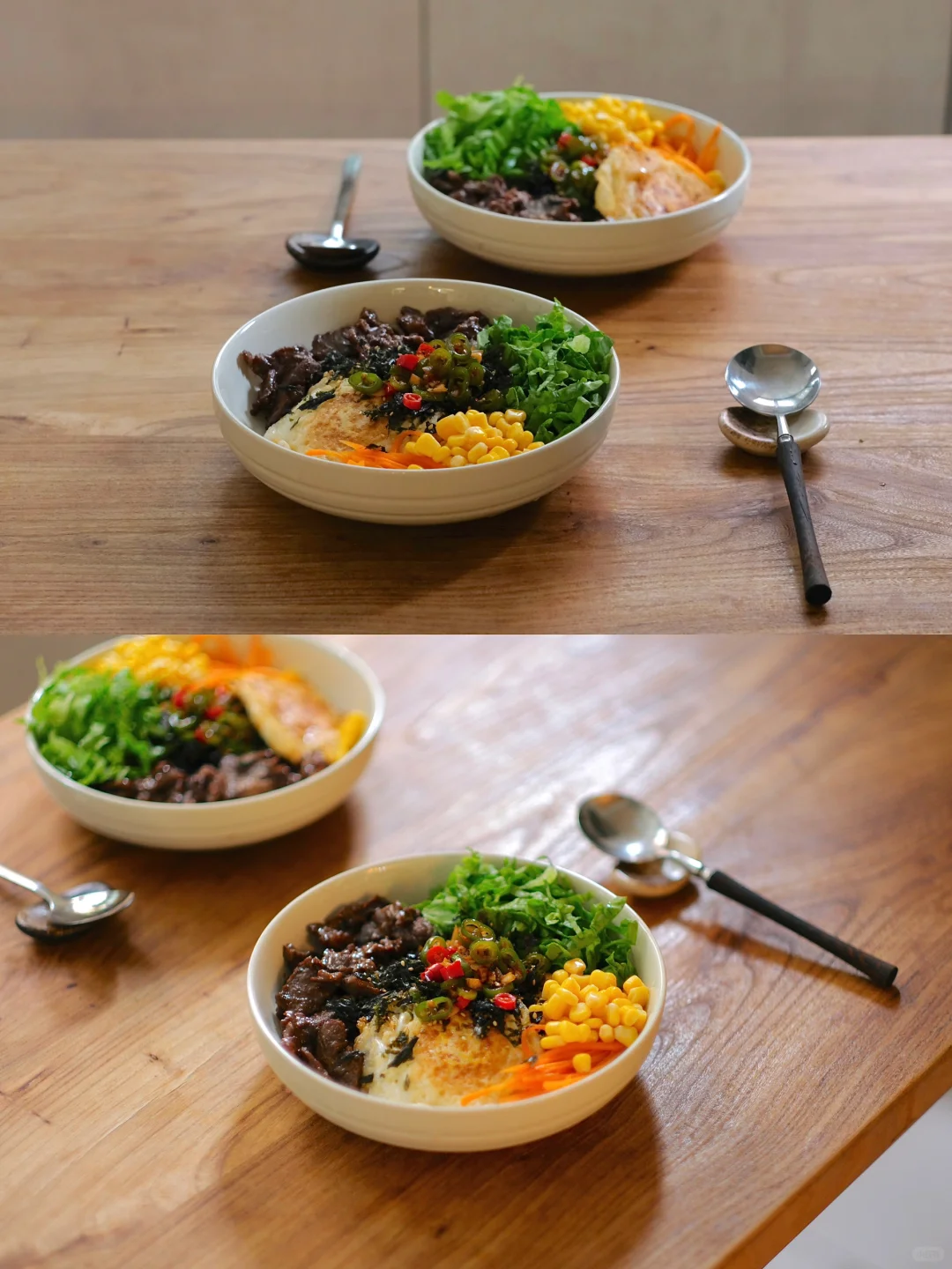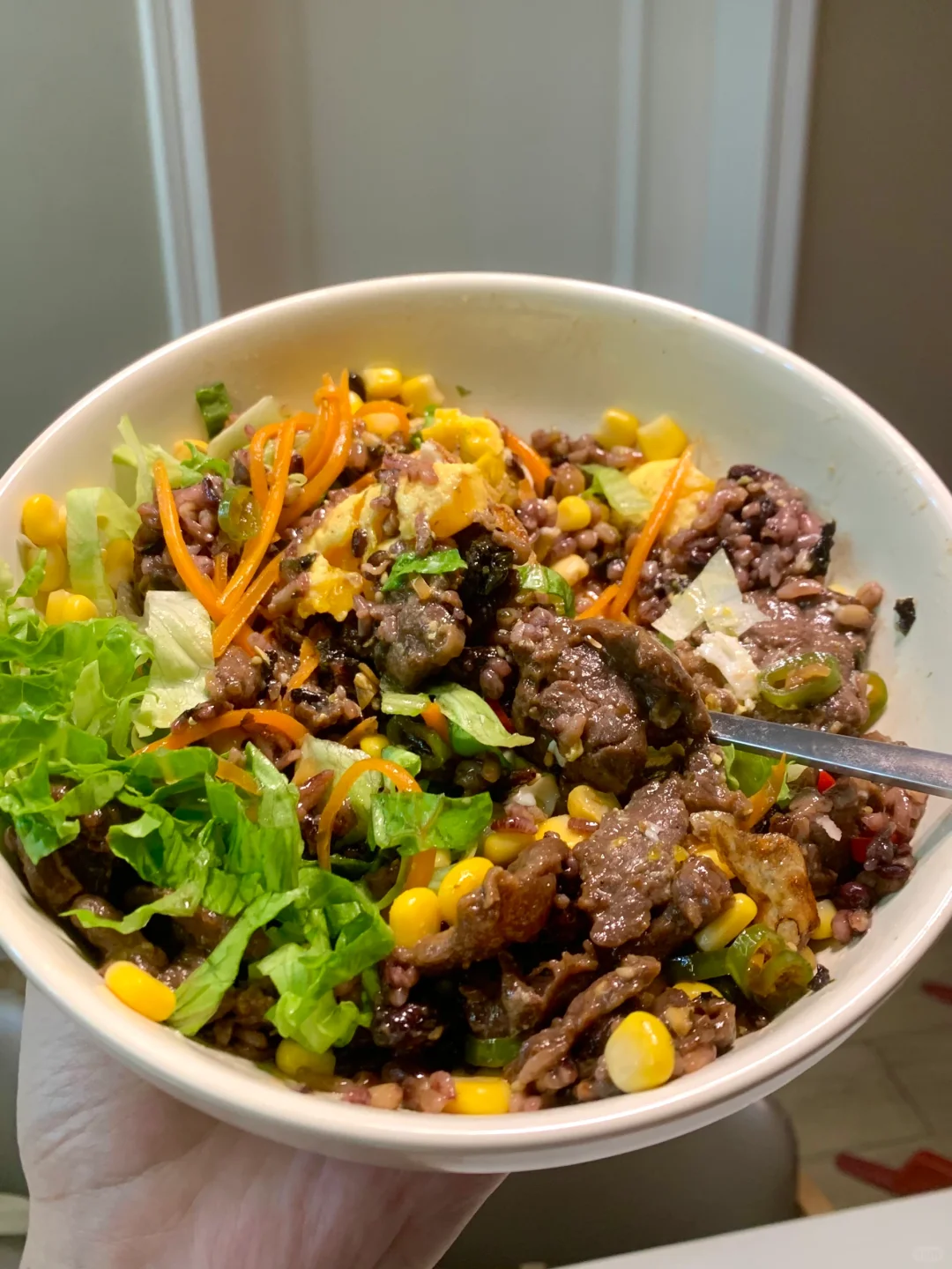 今日菜单:生菜牛肉拌饭 食材: 母亲杂粮饭、牛肉、生菜、鸡蛋、胡萝卜、玉米粒 步骤: 1⃣️牛肉腌制:牛肉切薄片,加入黄酒、生抽、蚝油生粉各1勺,抓拌均匀腌制15分钟。 2⃣️调配料汁:蒜末、小米辣、线椒,淋上热油,加入3勺生抽、1勺蚝油、半勺白糖,搅拌均匀。 3⃣️煎两个荷包蛋、牛肉煎熟、萝卜丝焯水、杂粮饭烹煮太复杂,我们直接用母亲杂粮饭,一盒有12种谷物豆类在里面!微波炉加热2分钟,铺上食材,淋上料汁,搅拌均匀即可食用。