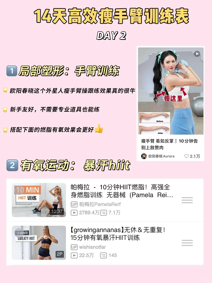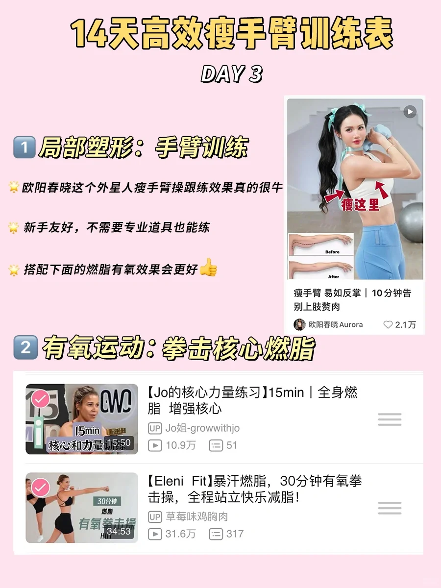 这个14天瘦手臂训练表超有效!手臂操和暴汗燃脂跟练搭配,我15天内就看到明显效果了~
