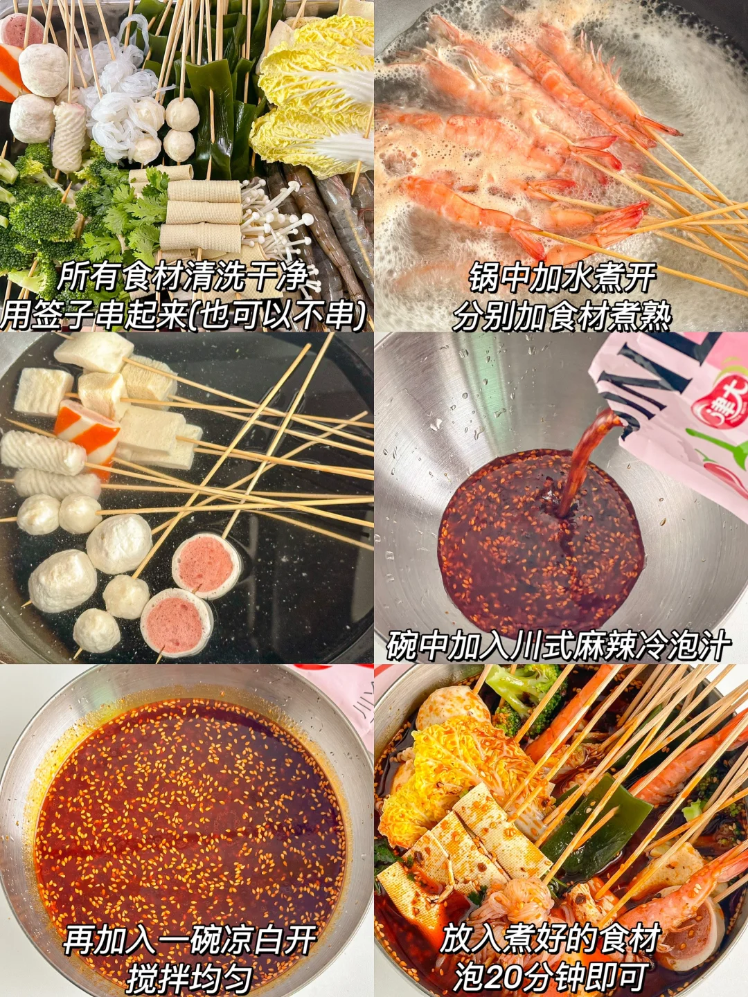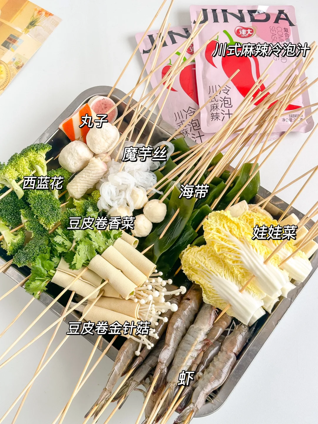 夏天谁能不好这口冷锅串串阿!!又麻又辣🌶️!一串接一串好吃到停不下来!!做法简单0失败,一煮一泡就好啦,快快学起来叭😋😋😋 ㅤ 🌟准备食材🌟 虾 海带 金针菇 千张 香菜 娃娃菜 西蓝花 魔芋丝 丸子 川式麻辣冷泡汁(我用的是津大的~) 🌟做法🌟 1️⃣所有食材清洗干净,用签子串起来(也可以不串) 2️⃣锅中加水煮开,分别加食材煮熟 3️⃣碗中加入麻辣冷泡汁,再加入一碗凉白开搅拌均匀,放入煮好的食材泡20分钟即可(泡得越久越入味哦~) ㅤ 一大锅自制钵钵鸡就做好啦🍢🍢麻辣爽口,真的巨好吃!!想吃什么泡什么😏有了这个川式麻辣冷泡汁调味料,小白也能秒学会!边吃边追剧太过瘾啦~🥰🥰🥰ㅤㅤ ㅤ