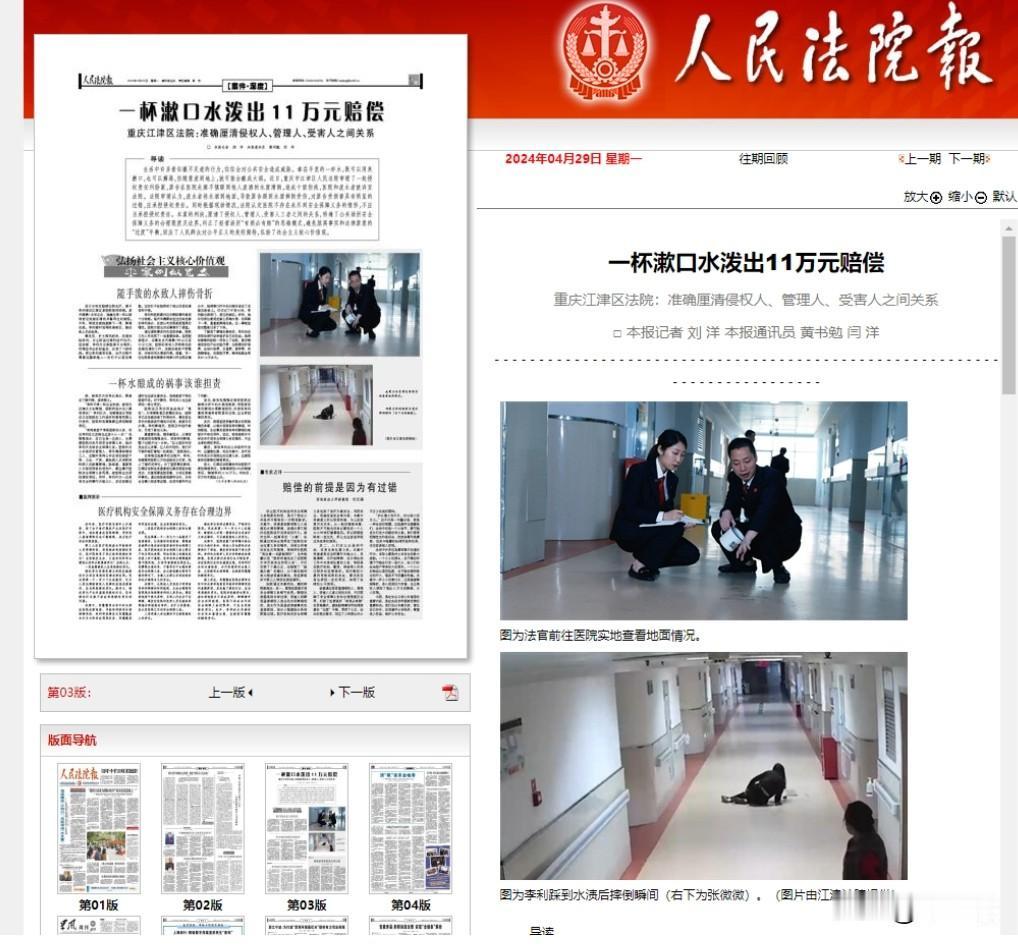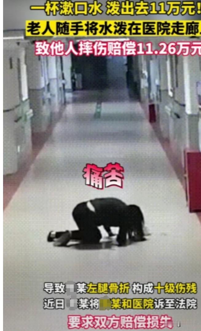 重庆,女子在医院陪护脑梗丈夫,这天她去洗碗,却不慎在走廊摔倒,造成10级伤残。调取监控后发现,是另外一名患者倒的漱口水导致她跌倒。女子把医院和患者告上法庭,要求赔偿各项损失共计16万,法庭上,三方都认为自己没错,法院这样判了! (本文信源来自于:光明网《一杯漱口水,泼出去11万元!》) 在一家综合医院里,一场由一杯漱口水引发的意外,让刘女士遭受了十级伤残的重创,也让医院和另一名患者司女士陷入了赔偿纠纷的漩涡中。 当时刘女士的丈夫因为突发脑梗住进了医院,她便开始了几个月的陪护生活。丈夫的病情一直在好转,医生也表示再住一周观察就可以准备出院了。 刘女士为了让丈夫开开心心出院,那天特意买了他最爱吃的馄饨。 丈夫吃得香喷喷,刘女士端着餐具去洗手间清洗,谁知就在她迈步走向水池的那一刻,一只脚猛然一滑,“嘣”,当即感到剧痛从左腿传来,这下摔的可惨了。 经过检查,刘女士被诊断为十级伤残,不得不做手术打进去一颗钉子固定住断裂的地方,手术过程异常难受,术后也是疼痛许久。 更让她伤心的是,丈夫的出院计划被迫搁浅,她也无法像之前那样全心全意地照顾丈夫了。 事后医院展开了调查,从视频中看到,在刘女士摔倒的40秒前,一名老年女性患者司女士随手将一杯漱口水泼洒在了地上,而刘女士不慎踩到了那滩水而摔倒受伤。 得知真相的刘女士气愤难平,她数次找到司女士想要一个解释,却被对方狡辩推脱。 司女士理直气壮地说:“来往几十个人都好好的,这分明是你自己不小心,别赖到我头上。” 刘女士无可奈何,只得将医院和司女士一并告上法庭,要求赔偿16万元的各项损失。 庭审过程中,刘女士一再强调,就因为司女士随意泼洒漱口水,使得她摔倒受伤,根据法律,司女士和医院应当承担连带赔偿责任。 司女士嬉皮笑脸地说:“我在医院里随手泼了点水,可也没人管啊,要是医院地面打扫干净,她就不会摔倒了,再说走路也得看着点吧,分明是她自己不小心。” 医院方面辩解说,清洁工会定期清扫,但水撒到地上和人摔倒的时间仅相隔40秒,他们怎么预判到这件事从而作出任何防范措施呢,并且在发现刘女士受伤后,医院已尽到了及时救助的义务。 法官经过缜密调查取证,作出了一个折中的判决,司女士的行为确实构成了过失,导致刘女士受伤,应当承担90%的主要赔偿责任,赔偿11.26万元。 同时法官认为刘女士作为一名成年人,在公共场合理应提高警惕,注意自身安全,她在这起意外中也负有一定责任,需自行承担剩余10%的损失。 而医院方面,存在一些管理疏漏,并非主观恶意,且在事后也及时履行了救助义务,不承担赔偿责任。 这起看似平凡的小事故,引发了社会各界的广泛关注和热议。有人认为,法院这一判决过于理性化,缺乏人性化考虑,完全没有将刘女士作为一名病人家属的特殊处境考虑在内。 也有人质疑,医院是否应当对患者和家属的人身安全负有更大责任?毕竟像司女士这样的患者,是否具备完全的民事行为能力也值得怀疑。 从法理层面来说,法院这一判决无可厚非,刘女士作为成年人,理应对自己的行为负完全责任,而医院也确实在第一时间内尽到了应尽的义务。 生活常常就是充满了意外,一杯漱口水却能引发如此令人唏嘘的后果。这或许也警示我们,无论是在什么场合,都应当怀着对他人、对社会的基本责任心,以避免给他人带来不必要的伤害。