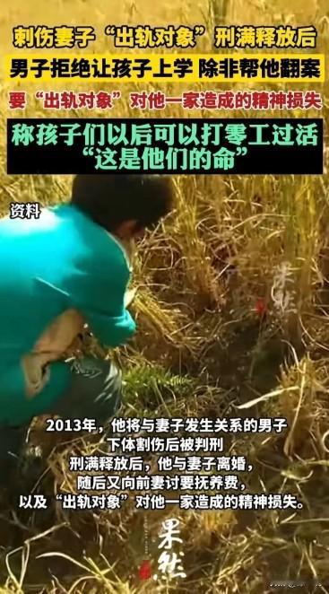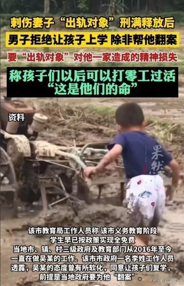 东南某市,一男子刺伤妻子的出轨对象,被判刑。男子出狱后,与妻子离婚。可男子的三个小孩一直在家,不让他们上学。面对政府工作人员的苦口婆心,男子却要求为他翻案。只要给他翻案,就让三个小孩上学。可这显然是不现实的。面对记者的追问,男子却毫无愧疚之心,说道,这都是孩子的命。 (本文信源来自于:红星新闻 《刺伤妻子“出轨对象”刑满释放后,男子拒绝让三孩子上学长达7年》) 2013年的夏天,老吴辛劳了一年,终于攒够了钱准备回到老家和妻儿团聚,谁知道回到家中,等待他的却是一地狼藉。 老吴并不是没有听过村里的流言蜚语,只是他从来就不愿相信。 直到亲眼目睹了妻子和那个小白脸鬼混的现场,老吴彻底失去了理智,狠狠地掏出了随身携带的水果刀,对准那个小白脸的肚子就是一下。 鲜血很快就在地上绽放开来,小白脸捂着伤口,痛苦地嚎叫着,老吴如梦方醒,他扔下刀就夺门而出,逃之夭夭。 第二天,老吴就被当地的警察带走了,他被控故意伤害罪,由于行凶的手段过于残暴,受害人不治恐怕就有性命之忧,法院最终判处老吴有期徒刑4年。 在狭小肮脏的牢房里,老吴度过了漫长而煎熬的四年牢狱之灾。 2017年,他重新走出监狱大门,回到了阔别已久的家中,却发现家中空无一人,妻子早已离开,把三个女儿也遗弃在了这个家。 出狱的老吴一贫如洗,靠打点零工勉强维持生计,他将一切过错归咎于当初妻子的出轨和那个可恶的小白脸,认为正是他们毁掉了自己的家庭,导致了如今的家破人亡。 老吴向妻子和小白脸索赔精神损失费,可是谁又愿意理会这个可怜虫呢? 令人诧异的是,老吴似乎将怨恨转嫁到了三个天真无辜的女儿身上。 他独自一个人抚养三个孩子,靠打零工维持生计,十分清贫。贫困潦倒的老吴不允许三个女儿上学,说自己拿不出更多的钱来供三个孩子上学。 每当有政府工作人员上门劝说,学杂费由政府来承担,甚至有好心人说三个孩子到大学毕业的钱都由他来付。 可老吴总是嘴里念叨说:“你们要是不给我平反,证明当年我是维护男人尊严才伤人的,我就不让三个孩子上学。” 工作人员明知老吴说的是事实,可他们也没什么办法,出轨是道德问题,只能谴责。谴责对于没脸没皮的人来说,就是空气,蹲监狱可真就毁了一个人的一生了。 村里人心里都知道老吴做的是对的,放到古代怎么也是一个好汉,但放到现在,老吴当年的行为太过直接了,已经触犯了法律,是故意伤害罪,任何人都不可能为他翻案平反。 现如今老吴却将三个孩子的受教育权利作为要挟的筹码,这一点实在没法让人同情,毕竟一码归一码,孩子是无辜的。 老吴不思悔改,反而坚持己见,剥夺了三个孩子接受教育、拥抱美好未来的权利,作为父亲,老吴真是罄竹难书啊! 岁月就这样一年一年过去,眨眼间就是7年的时光,在这漫长的7年里,老吴的三个女儿从未踏进过学校,每天在那狭小破旧的平房里混日子。 邻居家的孩子们很快就有了自己的小楼房,而老吴一家只能住在那间低矮简陋的平房里,两相对比,分外触目惊心。 看到这样的一幕,有人说这个老吴自己做错事入狱也就算了,关键是出狱后把气全撒在三个孩子身上,真是太不像话了! 还有人认为作为父亲,他理应为孩子们的前途考虑啊,可是他偏偏把孩子们的受教育权利当做要挟的筹码,我看他就是想逼政府为他翻案平反,这分明就是在肆意妄为啊! 不知道你们如何看待这件事?