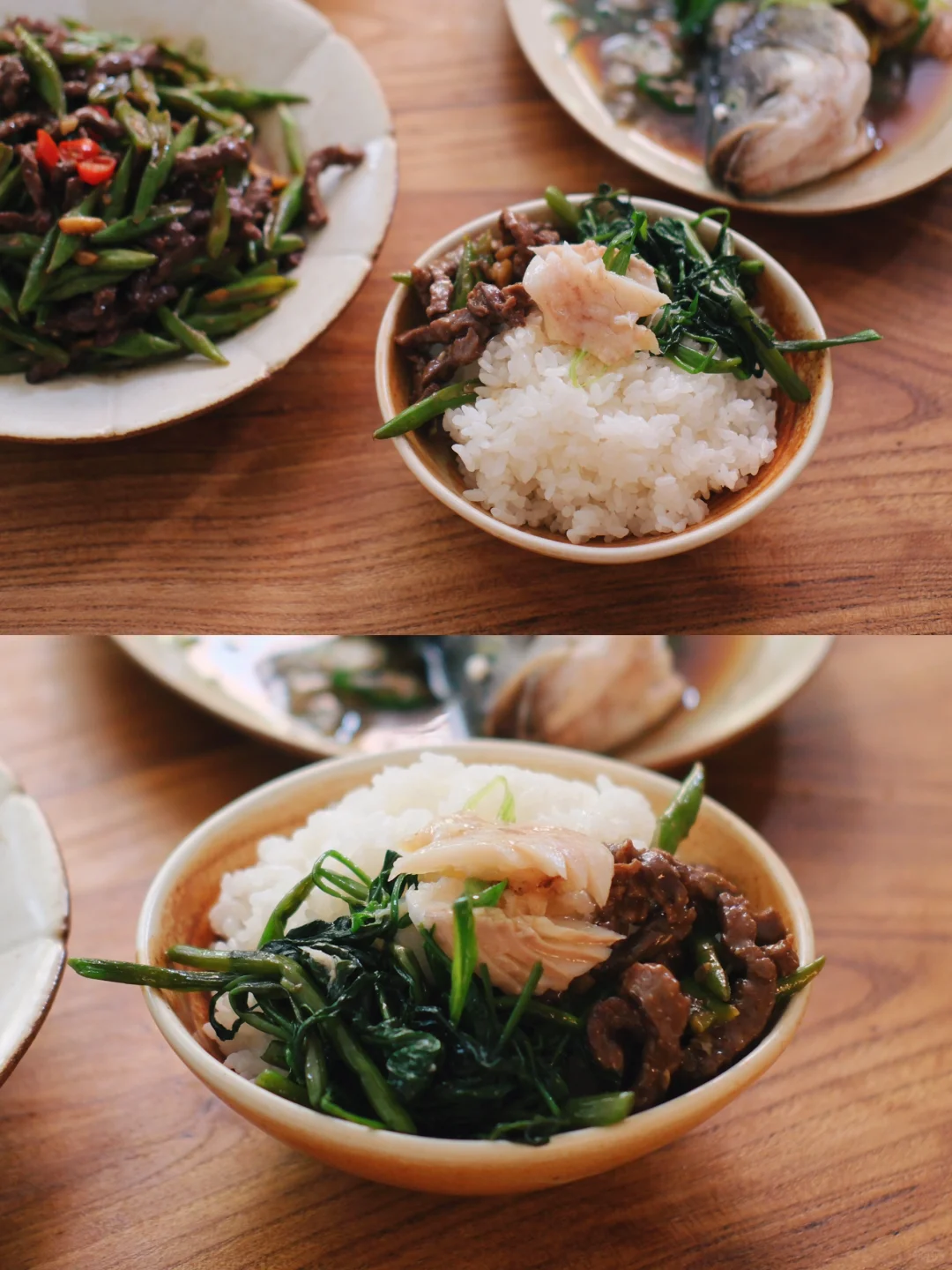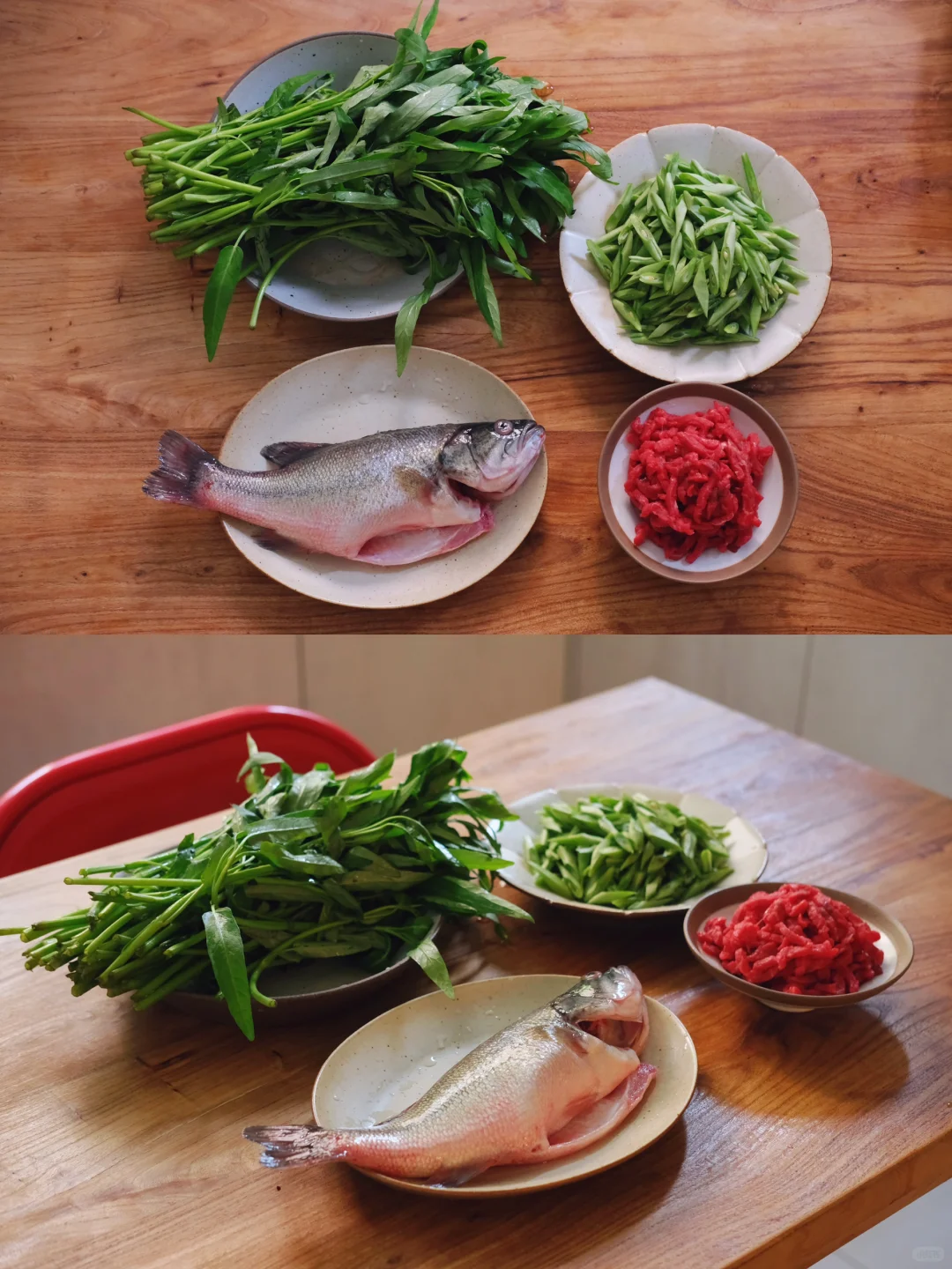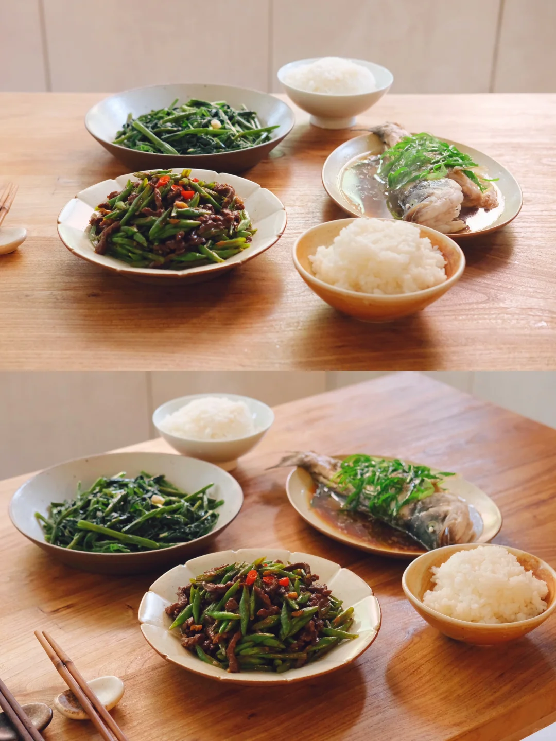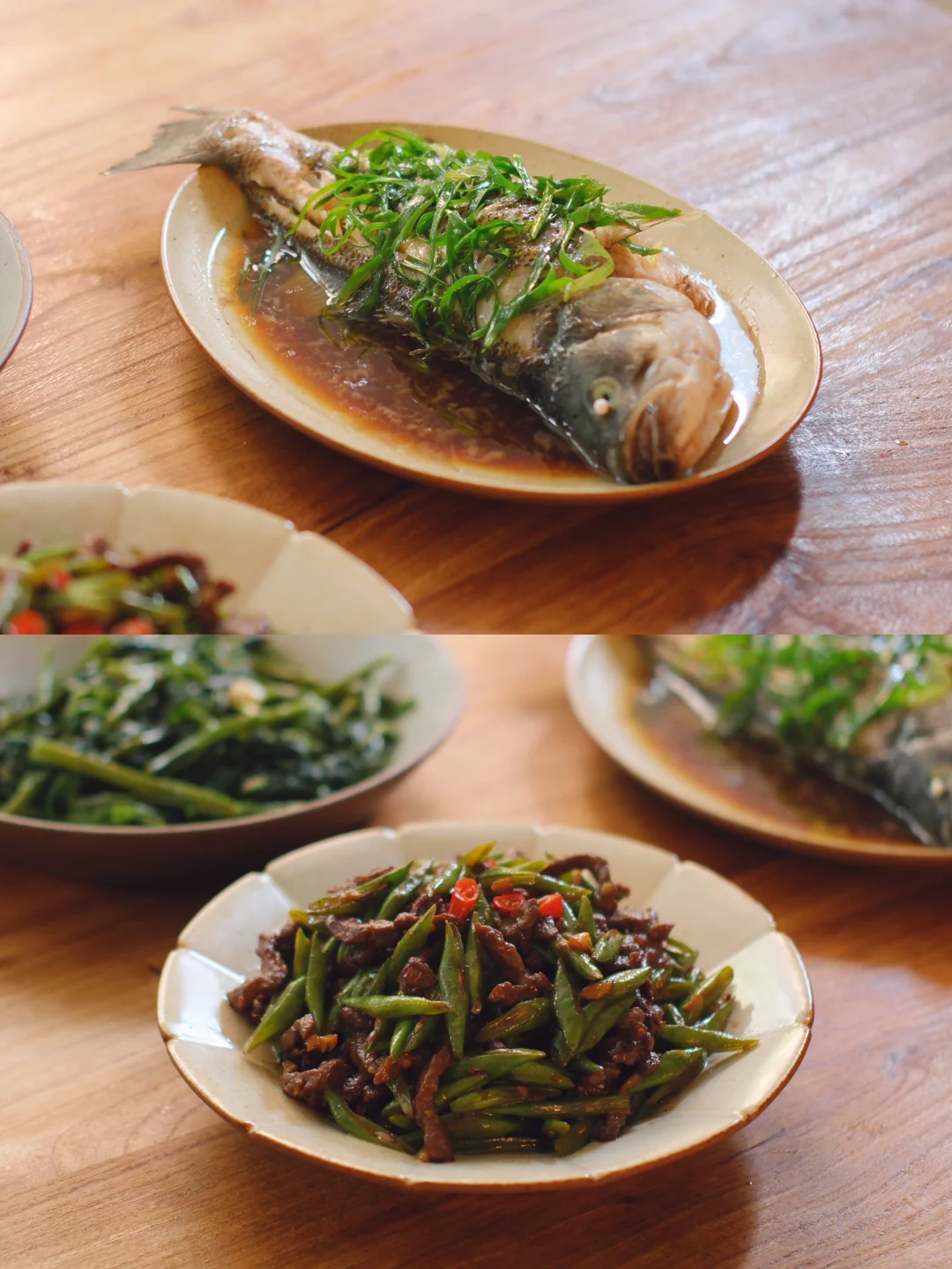 今日菜单: 1.葱油鲈鱼 2.四季豆炒牛肉 3.清炒空心菜